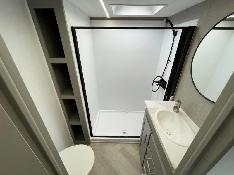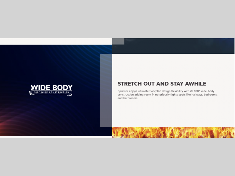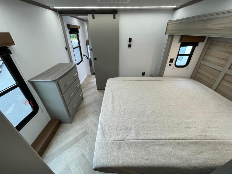 The Sprinter fifth wheels by Keystone feature spacious living areas, plenty of storage, and outstanding towability. Each unit is constructed with 2" aluminum framed and laminated sidewalls, a fully walkable roof, and dual layer insulation to help extend your camping season. The heated pass-through storage includes lockable slam latch baggage doors so you can easily pack your gear, and the one-touch 4-point leveling system features return hookup memory to have you set up in no-time. Head inside to find Congoleum vinyl flooring, Thomas Payne luxury collection furniture, residential style seamless marbled countertops, and an upgraded bedspread to name a few comforts. The Sprinter also includes a Girard tankless on-demand water heater, a central command center, plus a 30k BTU furnace and two A/C units to ensure your comfort!