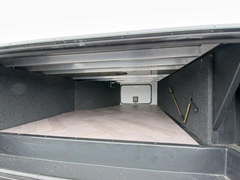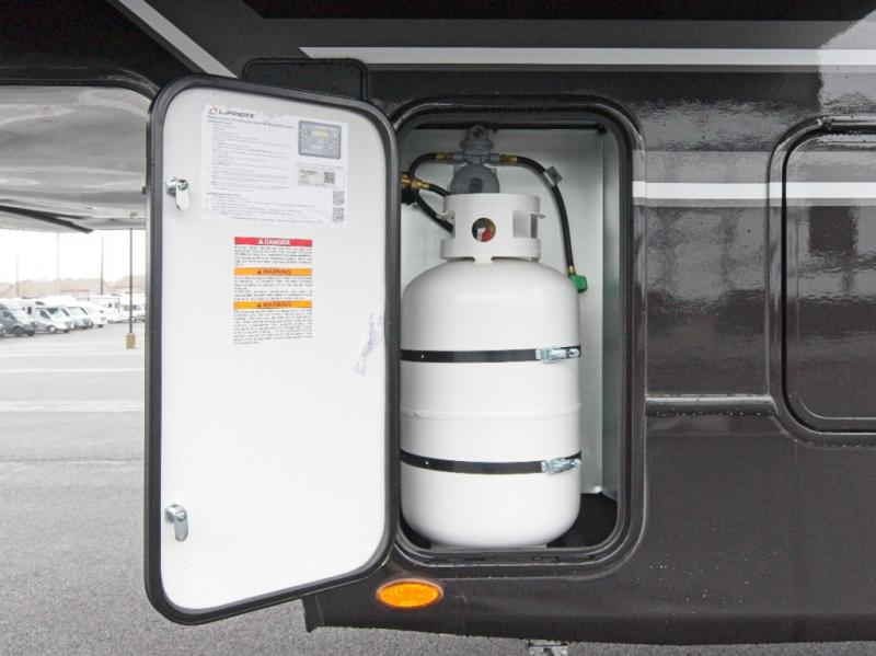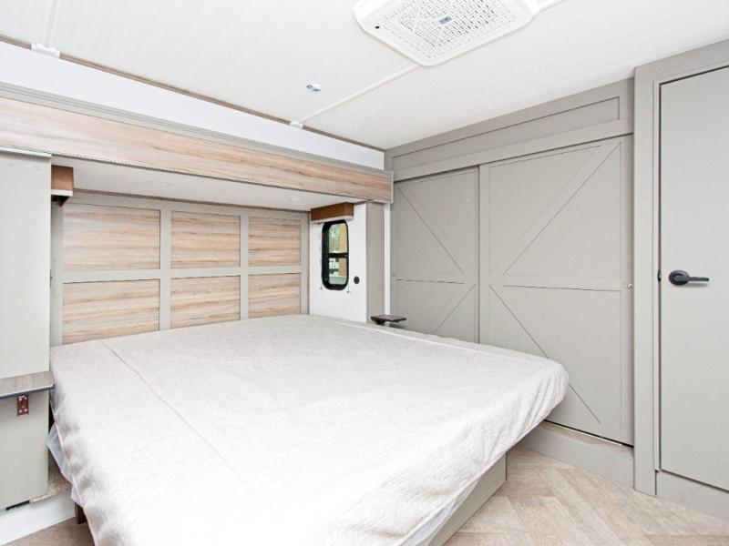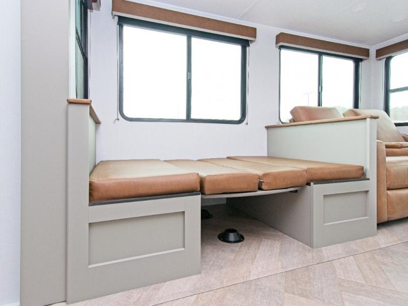 Inside, you’ll find high-end features designed to make your camping experience as comfortable as possible. From Congoleum vinyl flooring and Thomas Payne luxury furniture to seamless marbled countertops, every detail has been thoughtfully crafted. Enjoy the added luxury of an upgraded bedspread, Girard tankless on-demand water heater, a central command center, a 30k BTU furnace, and dual A/C units to keep you comfortable no matter the weather.