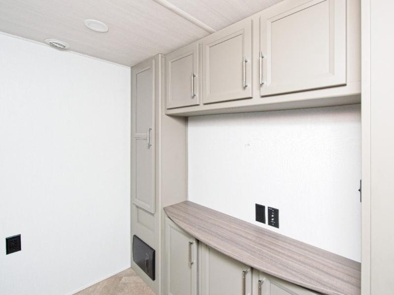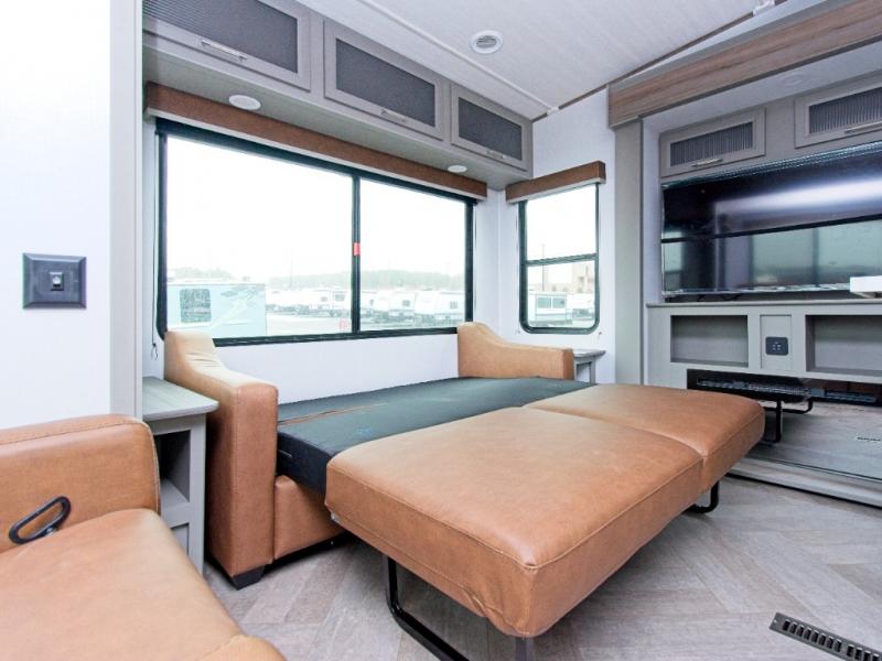 The chef-inspired kitchen in the Keystone Sprinter 3590LFT is perfect for preparing all your favorite meals while on the road. With a large kitchen island for extra prep space, a well-organized pantry, and a booth dinette with hinged storage, you’ll have everything you need at your fingertips. After dinner, kick back in the full-reclining theater seating equipped with massage features, ambient lighting, and USB ports to keep your devices charged.
