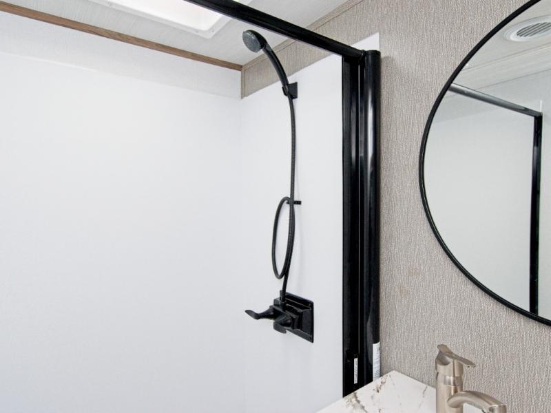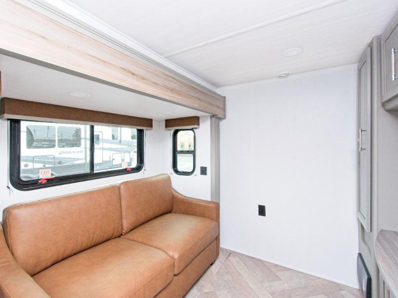 The Keystone Sprinter Fifth Wheel is built with your adventures in mind. Constructed with 2" aluminum-framed laminated sidewalls, a fully walkable roof, and dual-layer insulation, this fifth wheel is engineered for all-season comfort and durability. The heated pass-through storage with lockable slam latch doors ensures your gear stays secure. With the one-touch 4-point leveling system that remembers your hookup settings, setting up your campsite has never been easier.