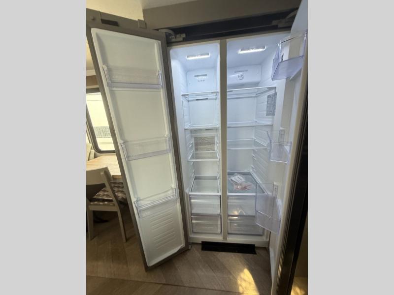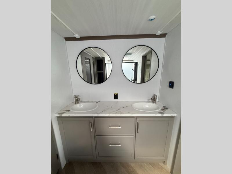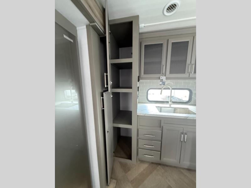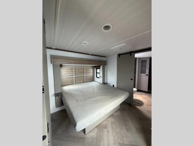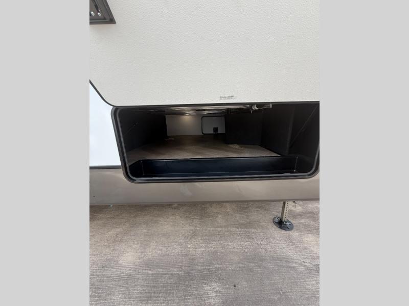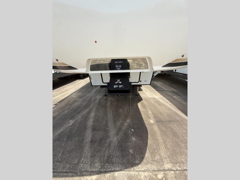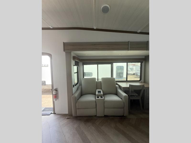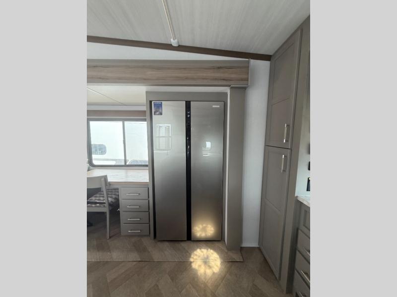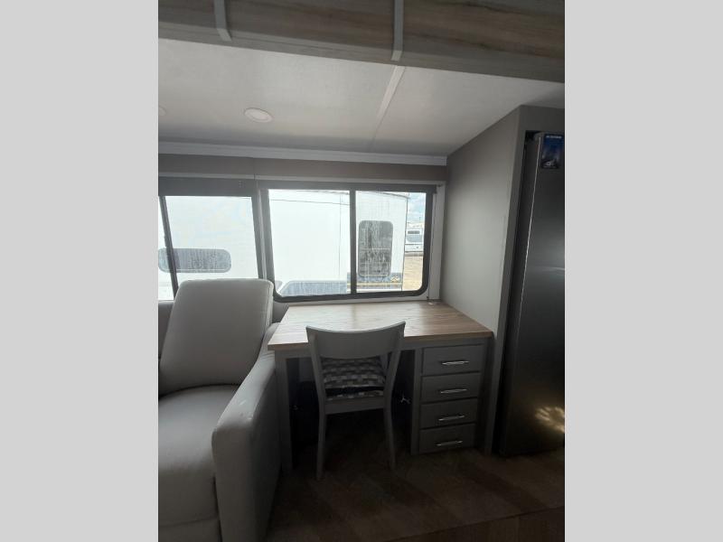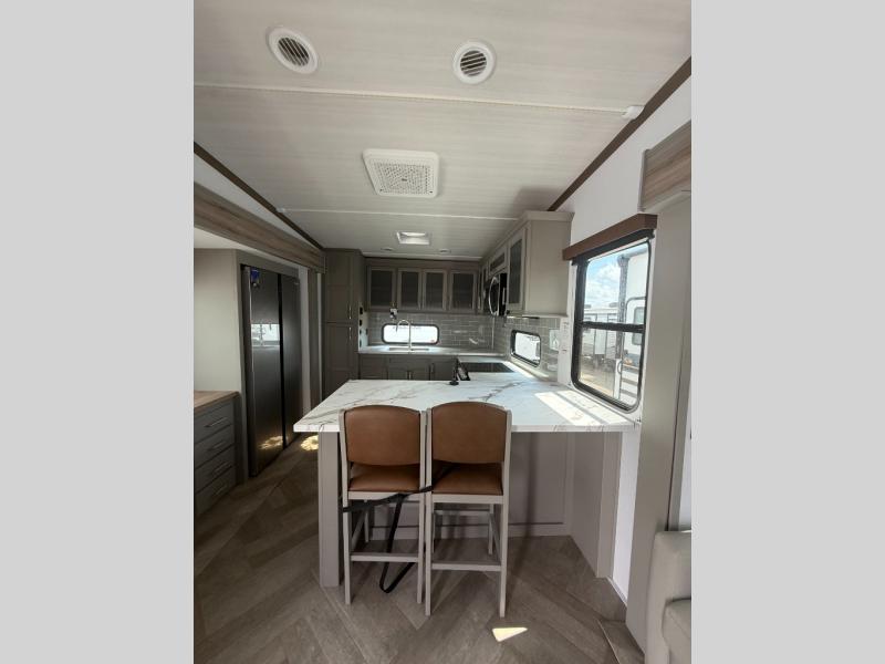 There is much to love about this fifth wheel! Starting with the front full bathroom which has a dual sink vanity for two to get ready at once and heading to the rear kitchen where you will have everything you need to prepare the best home cooked meals. There are also three bar stools at the bar top so guests can socialize with the cook. If you need to get a little work done while you're away, then you can easily get it done at the desk with chair next to the reclining theater seating and the 16 cu. ft. refrigerator for quick access to a snack break. The private bedroom has a king bed slide to lay your head on at night, and if you need an extra sleeping space then you can utilize the sofa slide too. Inside the half bathroom is a countertop with an area prepped for a washer and dryer to be added so you can enjoy clean clothes throughout your entire trip!