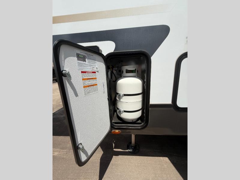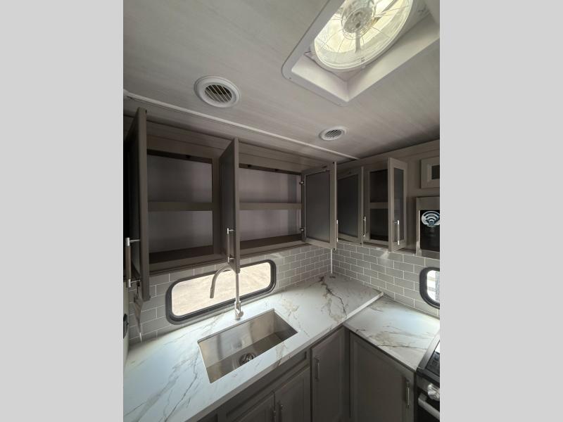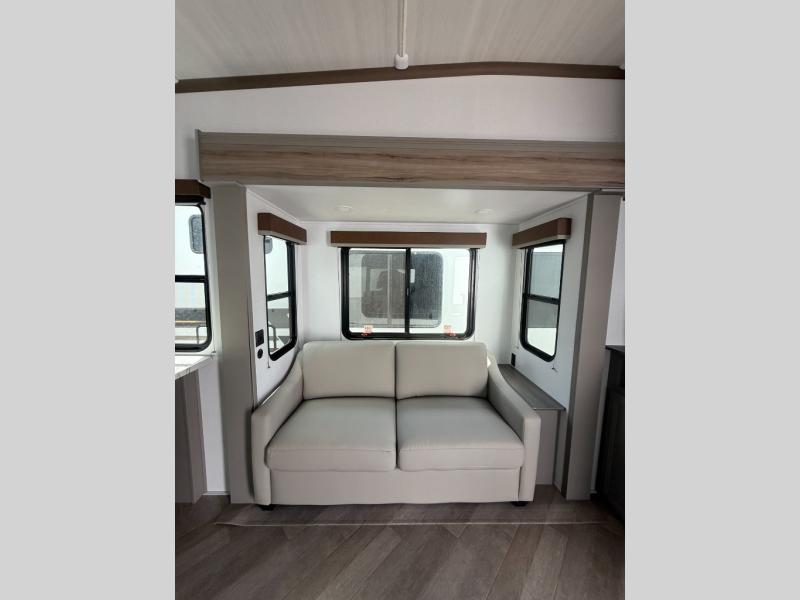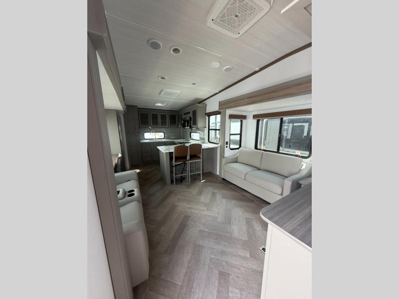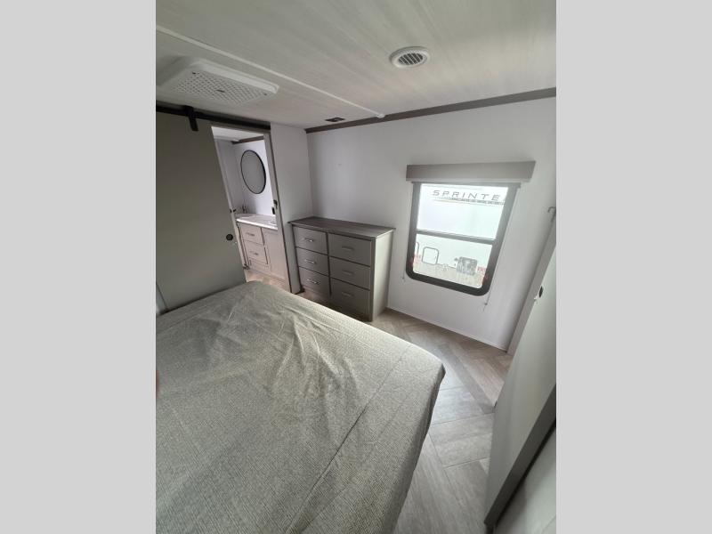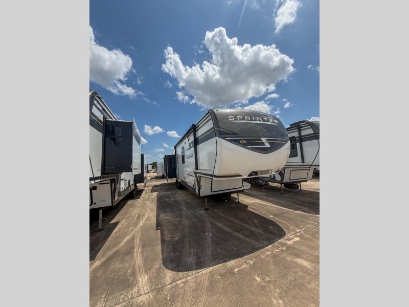The Sprinter fifth wheels by Keystone feature spacious living areas, plenty of storage, and outstanding towability. Each unit is constructed with 2" aluminum framed and laminated sidewalls, a fully walkable roof, and dual layer insulation to help extend your camping season. The heated pass-through storage includes lockable slam latch baggage doors so you can easily pack your gear, and the one-touch 4-point leveling system features return hookup memory to have you set up in no-time. Head inside to find Congoleum vinyl flooring, Thomas Payne luxury collection furniture, residential style seamless marbled countertops, and an upgraded bedspread to name a few comforts. The Sprinter also includes a Girard tankless on-demand water heater, a central command center, plus a 30k BTU furnace and two A/C units to ensure your comfort!