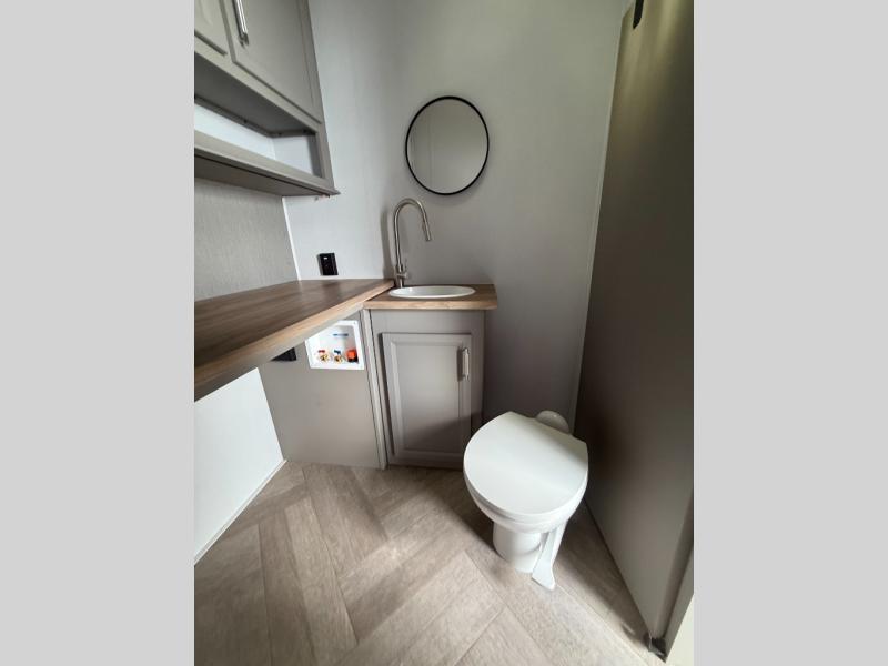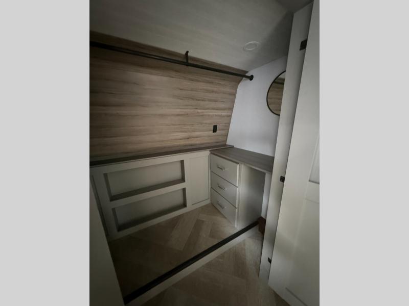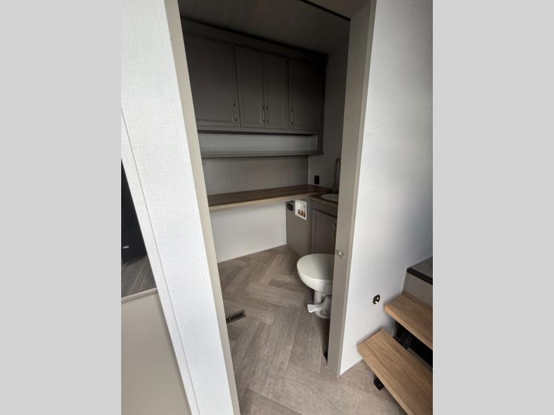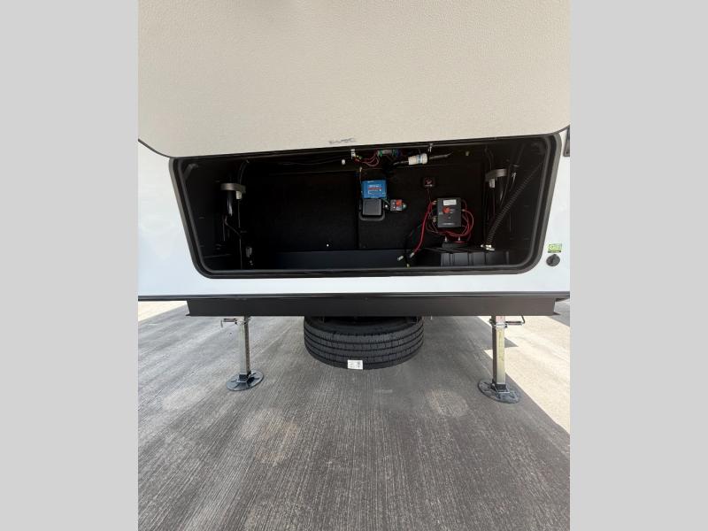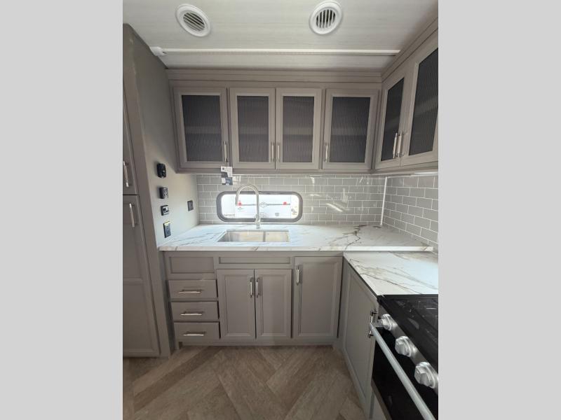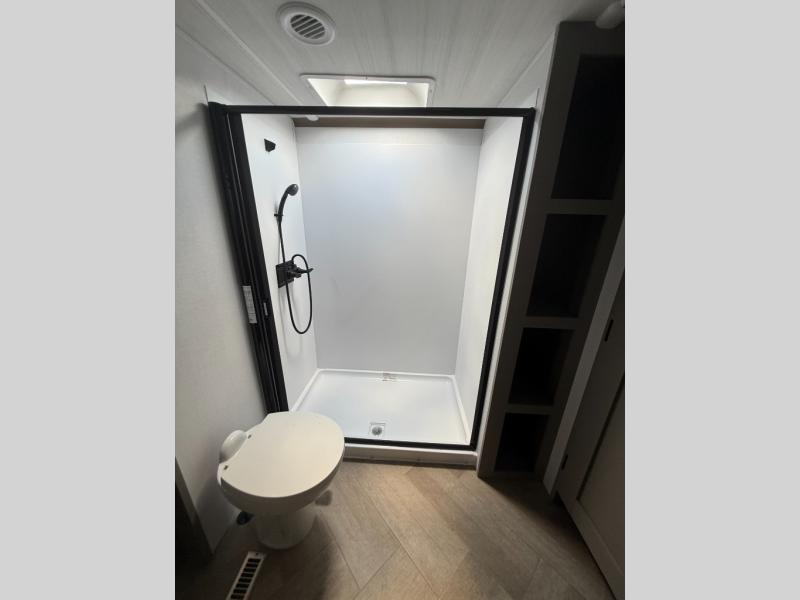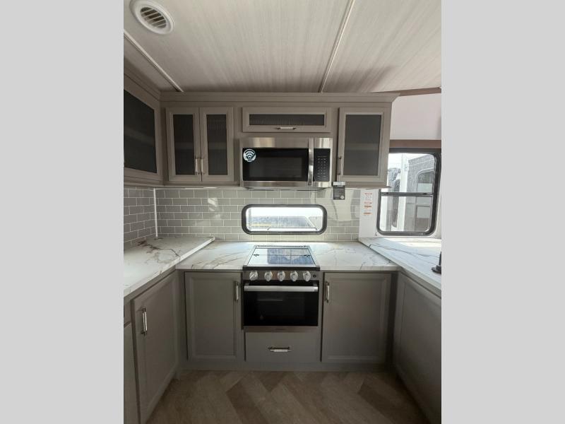 The Sprinter fifth wheels by Keystone feature spacious living areas, plenty of storage, and outstanding towability. Each unit is constructed with 2" aluminum framed and laminated sidewalls, a fully walkable roof, and dual layer insulation to help extend your camping season. The heated pass-through storage includes lockable slam latch baggage doors so you can easily pack your gear, and the one-touch 4-point leveling system features return hookup memory to have you set up in no-time. Head inside to find Congoleum vinyl flooring, Thomas Payne luxury collection furniture, residential style seamless marbled countertops, and an upgraded bedspread to name a few comforts. The Sprinter also includes a Girard tankless on-demand water heater, a central command center, plus a 30k BTU furnace and two A/C units to ensure your comfort!