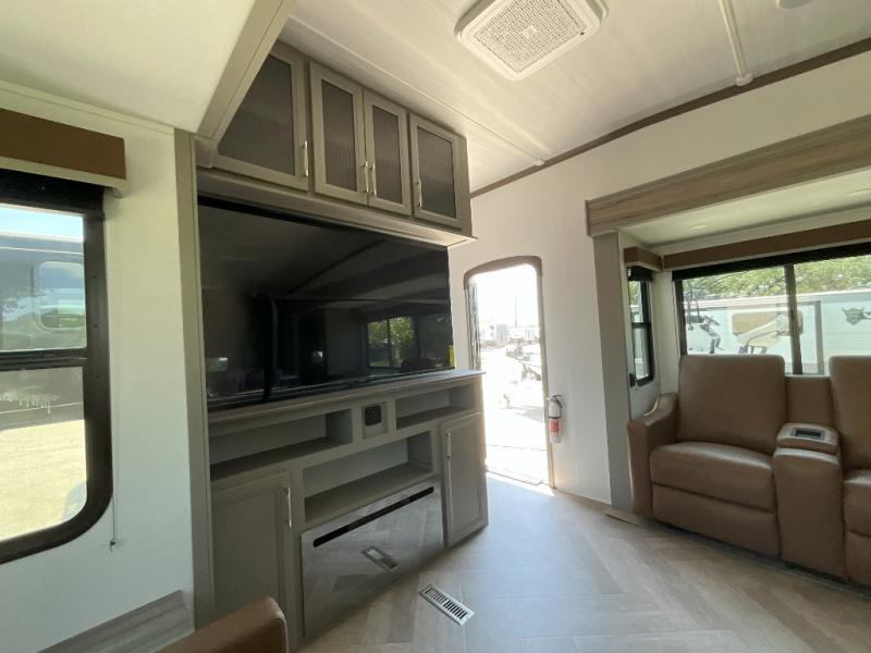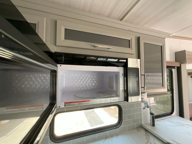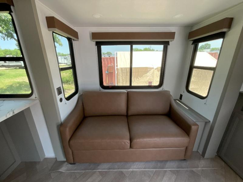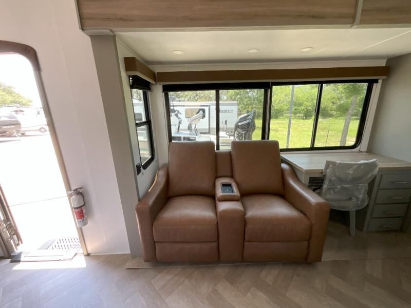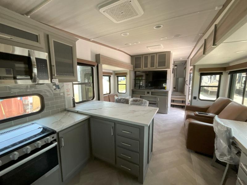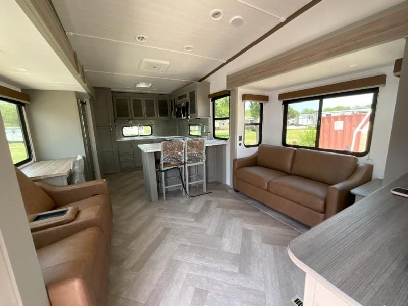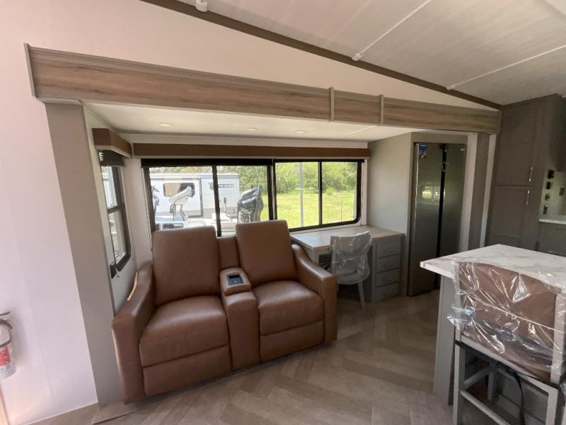 There is much to love about this fifth wheel! Starting with the front full bathroom which has a dual sink vanity for two to get ready at once and heading to the rear kitchen where you will have everything you need to prepare the best home cooked meals. There are also three bar stools at the bar top so guests can socialize with the cook. If you need to get a little work done while you're away, then you can easily get it done at the desk with chair next to the reclining theater seating and the 16 cu. ft. refrigerator for quick access to a snack break. The private bedroom has a king bed slide to lay your head on at night, and if you need an extra sleeping space then you can utilize the sofa slide too. Inside the half bathroom is a countertop with an area prepped for a washer and dryer to be added so you can enjoy clean clothes throughout your entire trip!