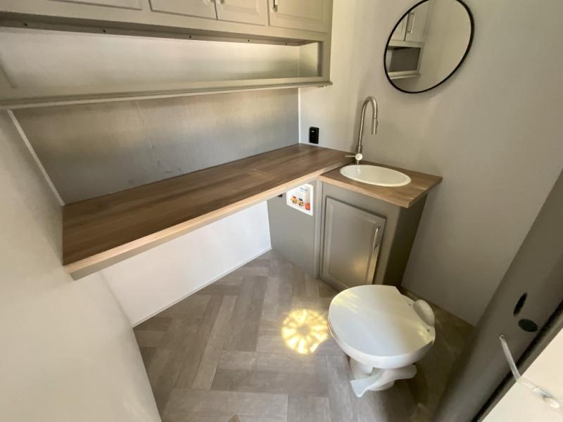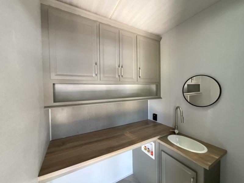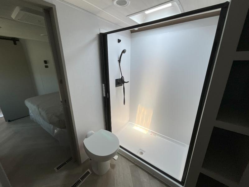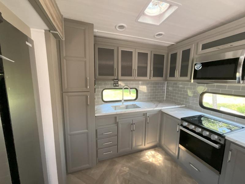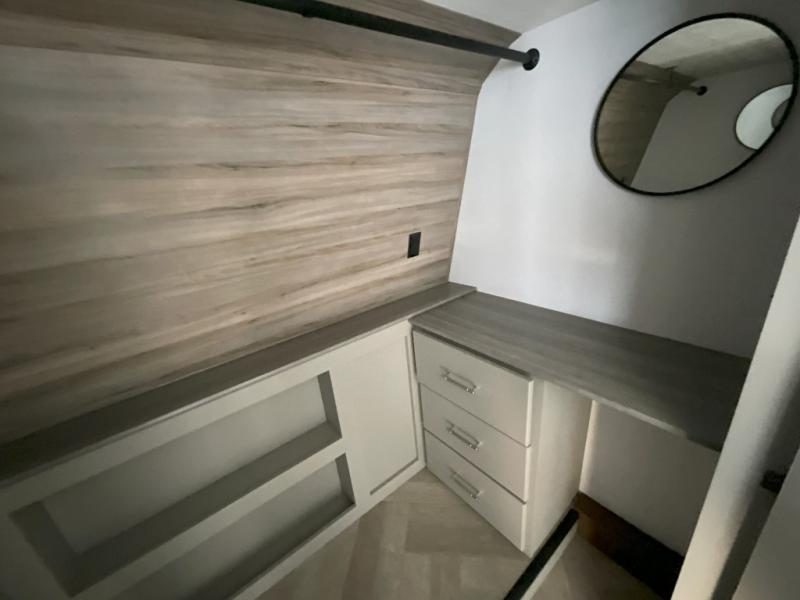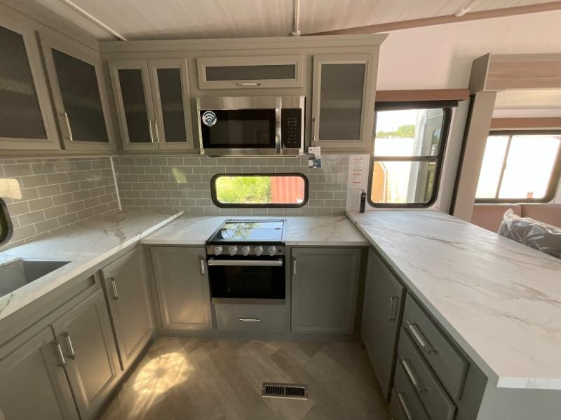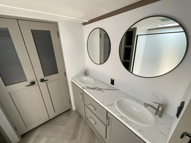 There is much to love about this fifth wheel! Starting with the front full bathroom which has a dual sink vanity for two to get ready at once and heading to the rear kitchen where you will have everything you need to prepare the best home cooked meals. There are also three bar stools at the bar top so guests can socialize with the cook. If you need to get a little work done while you're away, then you can easily get it done at the desk with chair next to the reclining theater seating and the 16 cu. ft. refrigerator for quick access to a snack break. The private bedroom has a king bed slide to lay your head on at night, and if you need an extra sleeping space then you can utilize the sofa slide too. Inside the half bathroom is a countertop with an area prepped for a washer and dryer to be added so you can enjoy clean clothes throughout your entire trip!