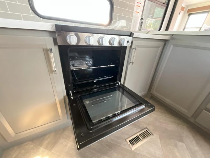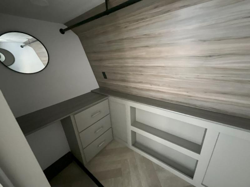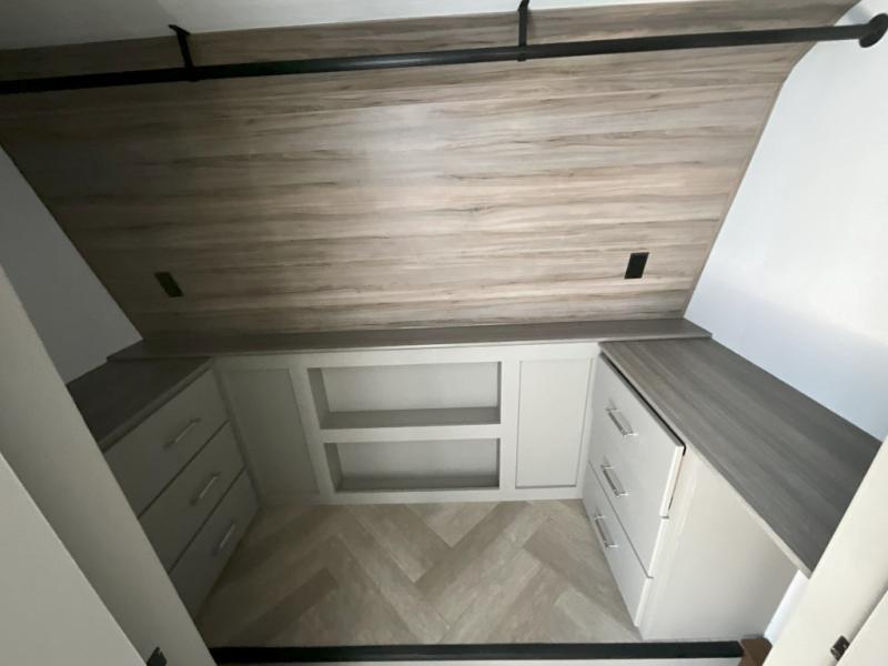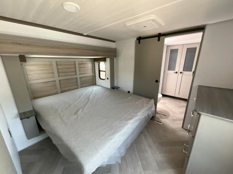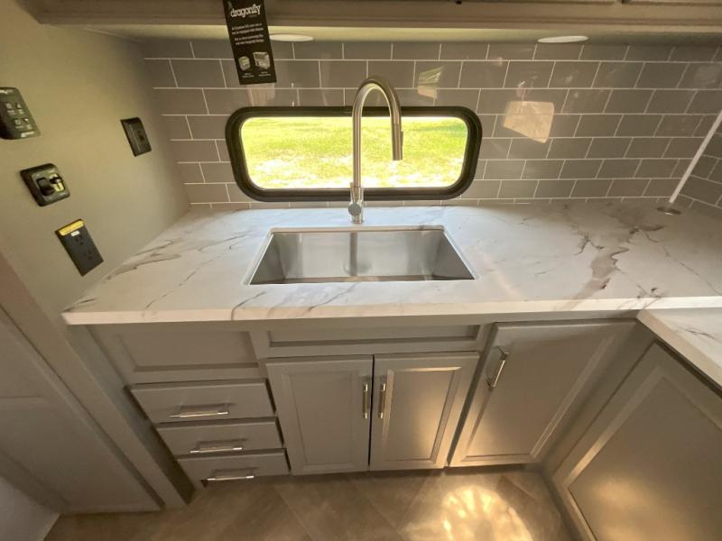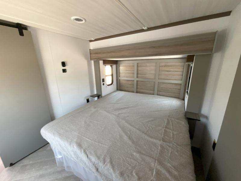 The Sprinter fifth wheels by Keystone feature spacious living areas, plenty of storage, and outstanding towability. Each unit is constructed with 2" aluminum framed and laminated sidewalls, a fully walkable roof, and dual layer insulation to help extend your camping season. The heated pass-through storage includes lockable slam latch baggage doors so you can easily pack your gear, and the one-touch 4-point leveling system features return hookup memory to have you set up in no-time. Head inside to find Congoleum vinyl flooring, Thomas Payne luxury collection furniture, residential style seamless marbled countertops, and an upgraded bedspread to name a few comforts. The Sprinter also includes a Girard tankless on-demand water heater, a central command center, plus a 30k BTU furnace and two A/C units to ensure your comfort!