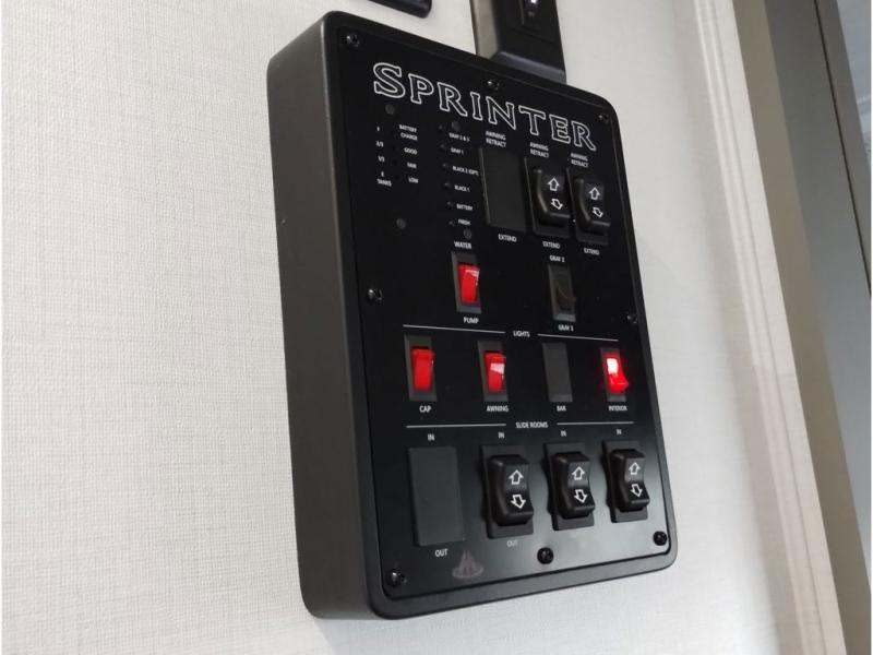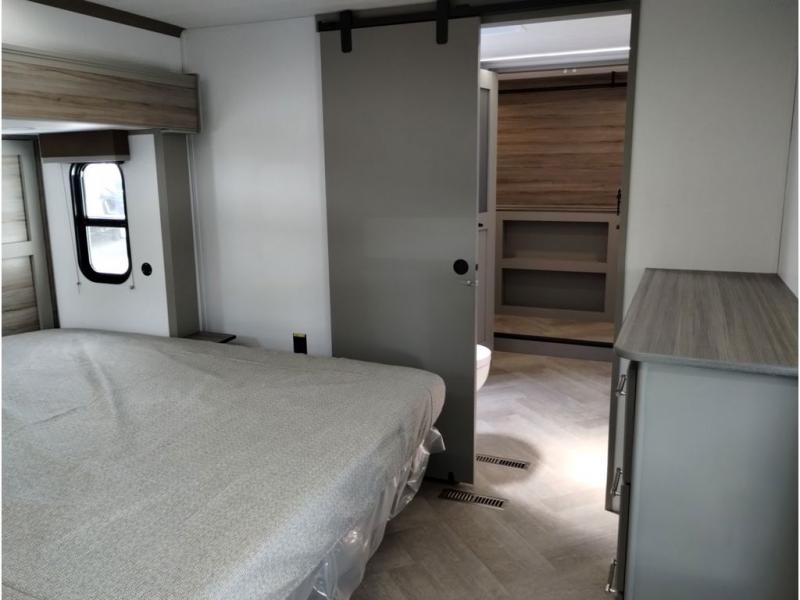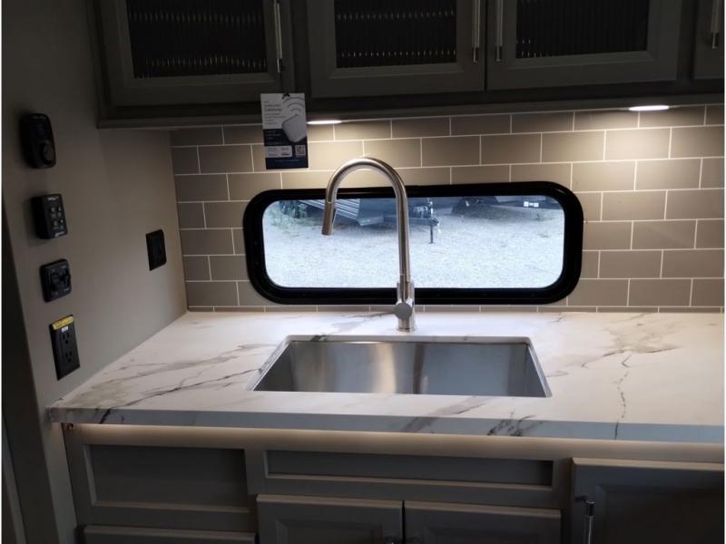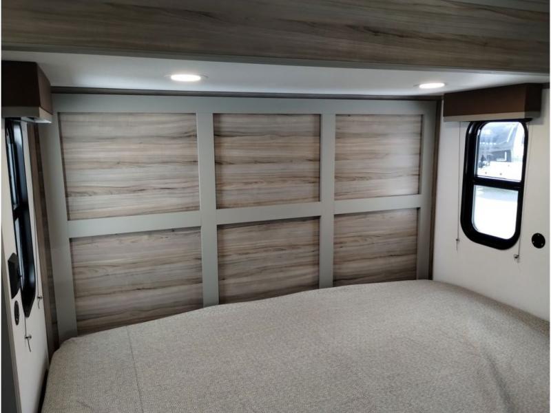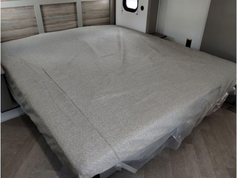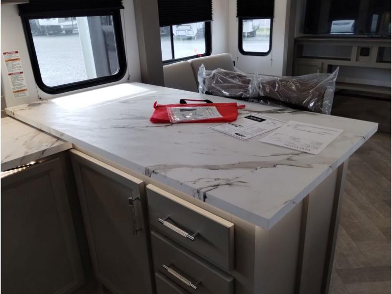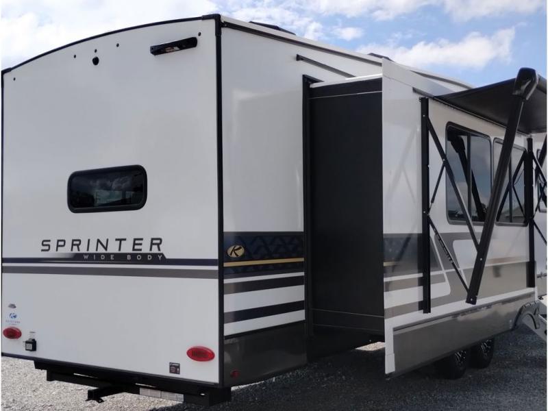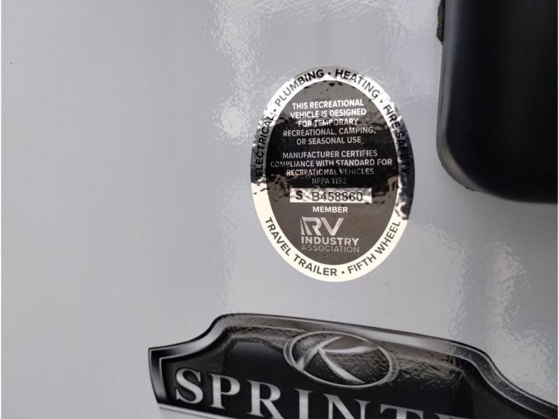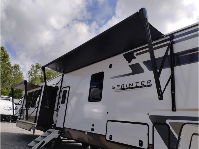 The Sprinter fifth wheels by Keystone feature spacious living areas, plenty of storage, and outstanding towability. Each unit is constructed with 2" aluminum framed and laminated sidewalls, a fully walkable roof, and dual layer insulation to help extend your camping season. The heated pass-through storage includes lockable slam latch baggage doors so you can easily pack your gear, and the one-touch 4-point leveling system features return hookup memory to have you set up in no-time. Head inside to find Congoleum vinyl flooring, Thomas Payne luxury collection furniture, residential style seamless marbled countertops, and an upgraded bedspread to name a few comforts. The Sprinter also includes a Girard tankless on-demand water heater, a central command center, plus a 30k BTU furnace and two A/C units to ensure your comfort!