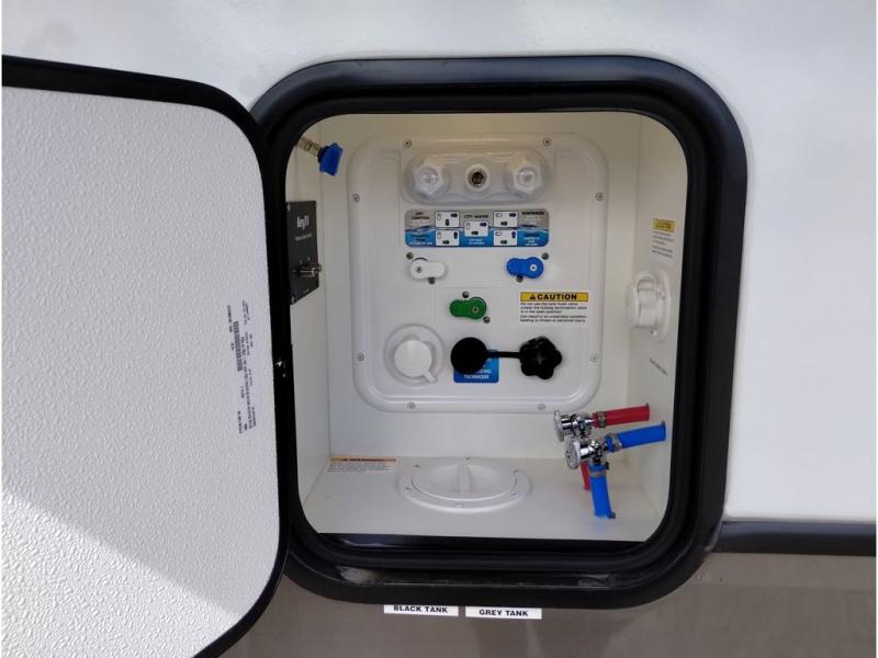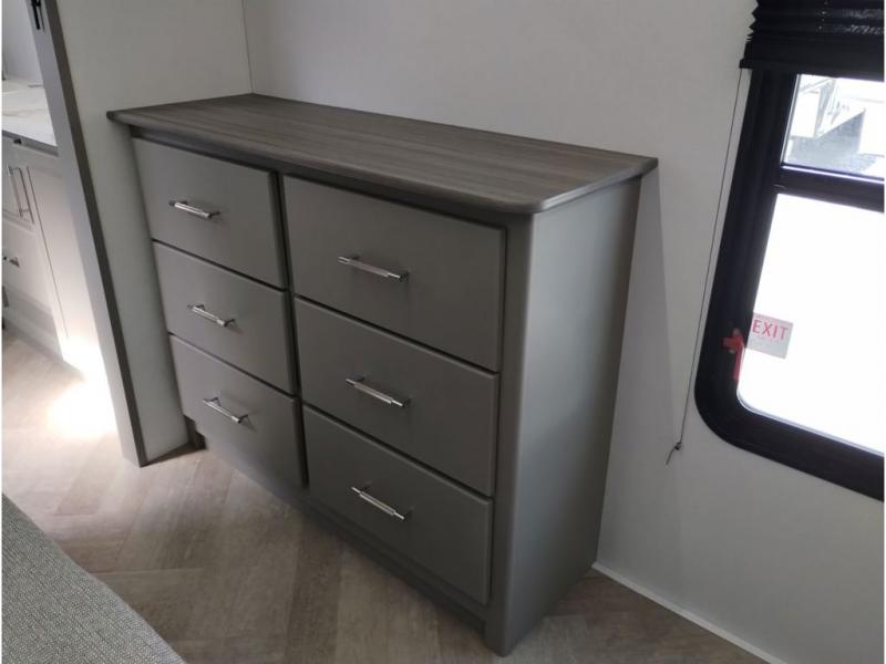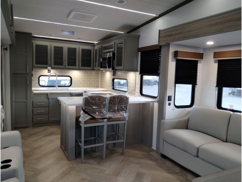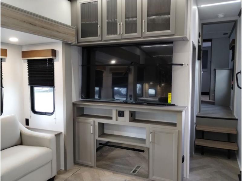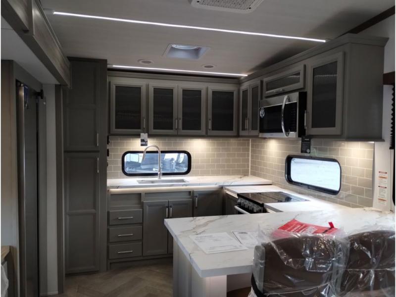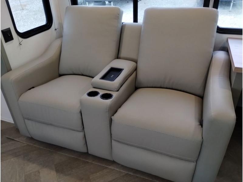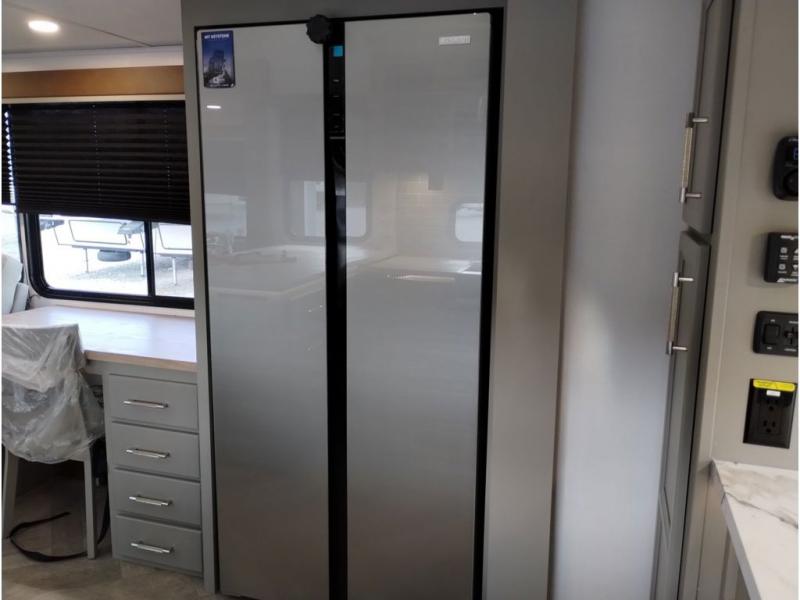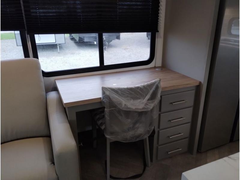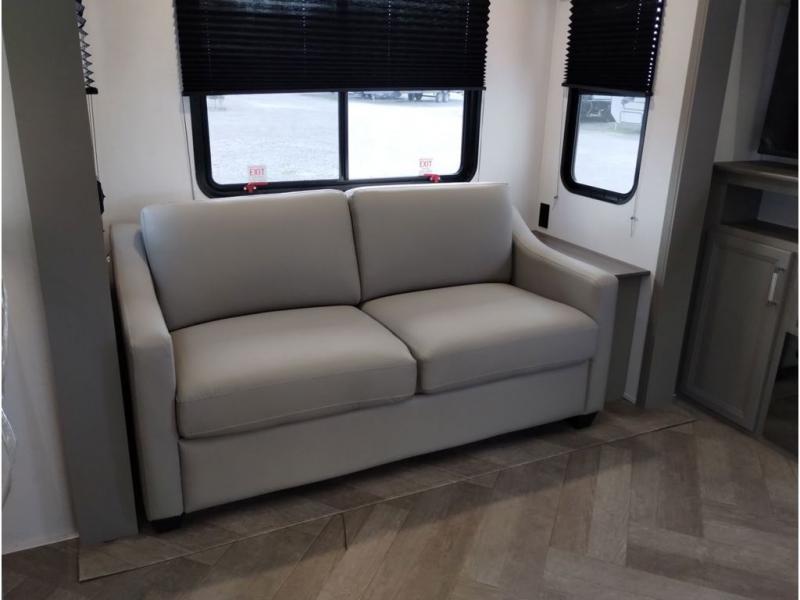 There is much to love about this fifth wheel! Starting with the front full bathroom which has a dual sink vanity for two to get ready at once and heading to the rear kitchen where you will have everything you need to prepare the best home cooked meals. There are also three bar stools at the bar top so guests can socialize with the cook. If you need to get a little work done while you're away, then you can easily get it done at the desk with chair next to the reclining theater seating and the 16 cu. ft. refrigerator for quick access to a snack break. The private bedroom has a king bed slide to lay your head on at night, and if you need an extra sleeping space then you can utilize the sofa slide too. Inside the half bathroom is a countertop with an area prepped for a washer and dryer to be added so you can enjoy clean clothes throughout your entire trip!