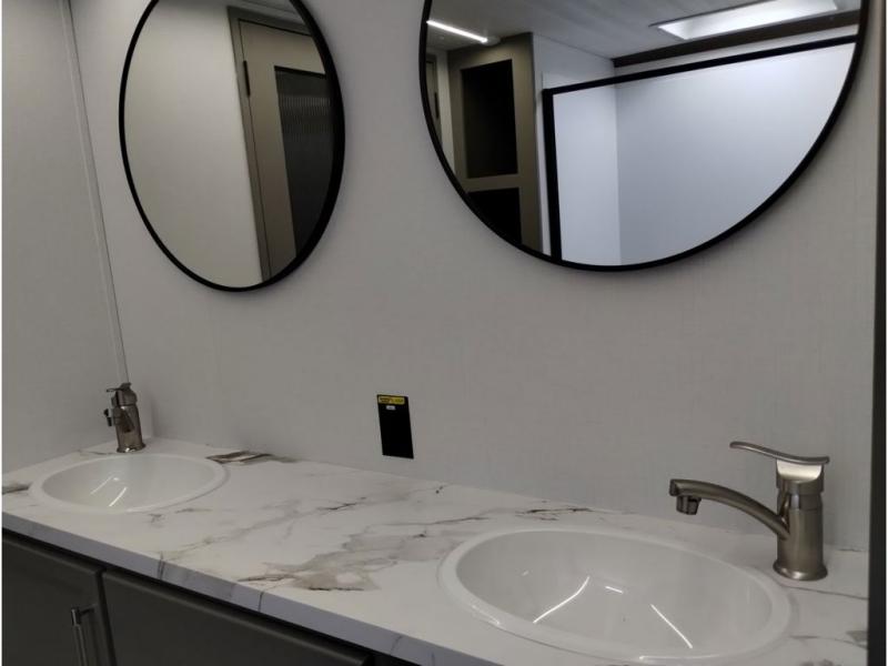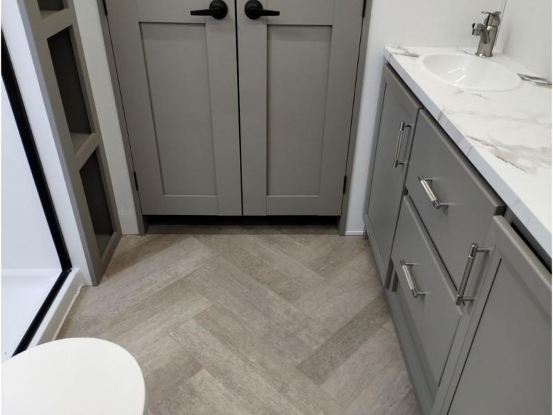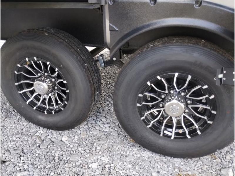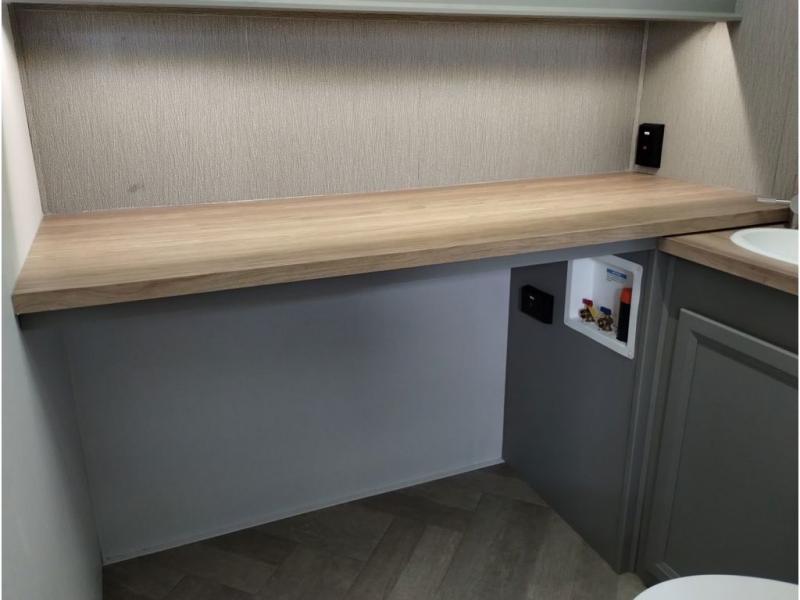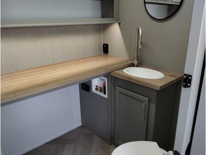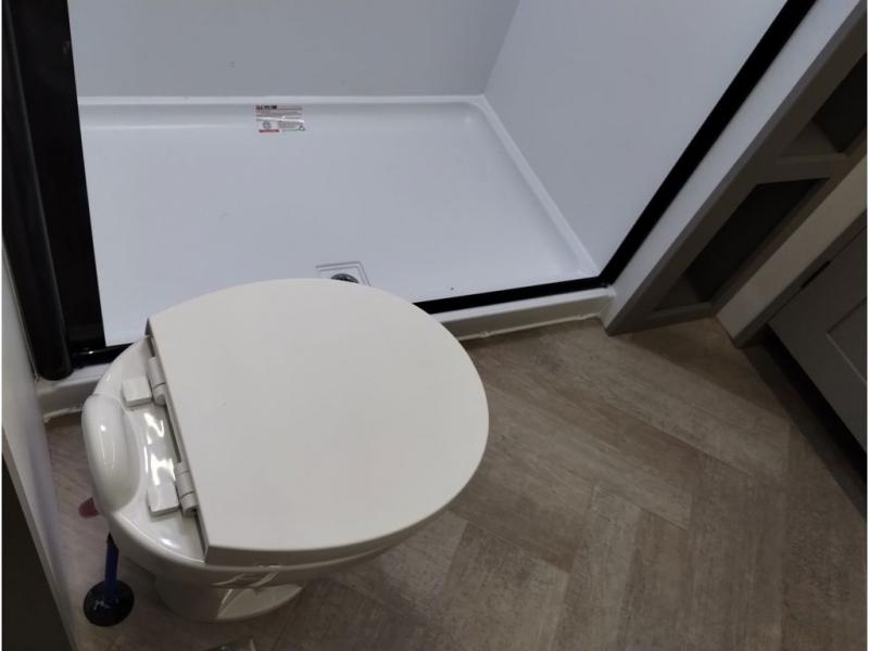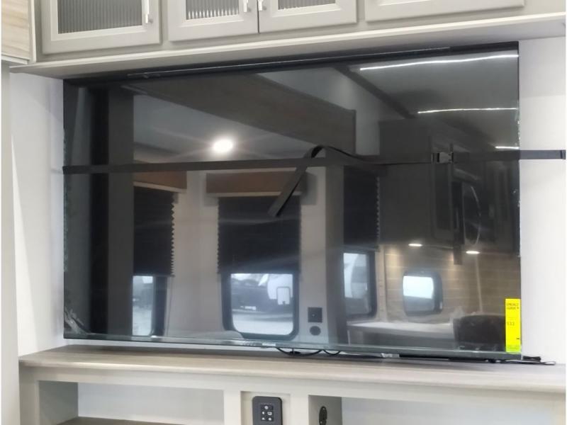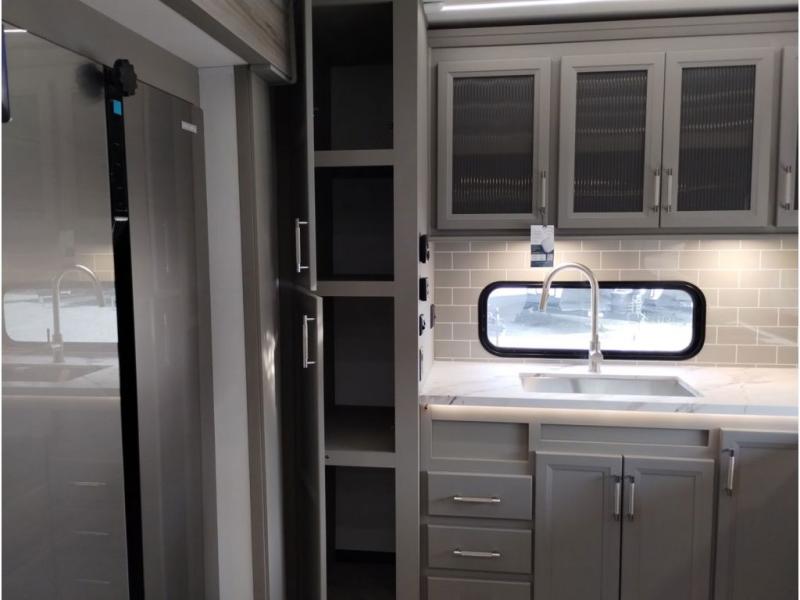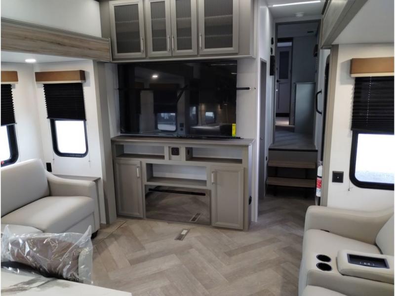 There is much to love about this fifth wheel! Starting with the front full bathroom which has a dual sink vanity for two to get ready at once and heading to the rear kitchen where you will have everything you need to prepare the best home cooked meals. There are also three bar stools at the bar top so guests can socialize with the cook. If you need to get a little work done while you're away, then you can easily get it done at the desk with chair next to the reclining theater seating and the 16 cu. ft. refrigerator for quick access to a snack break. The private bedroom has a king bed slide to lay your head on at night, and if you need an extra sleeping space then you can utilize the sofa slide too. Inside the half bathroom is a countertop with an area prepped for a washer and dryer to be added so you can enjoy clean clothes throughout your entire trip!