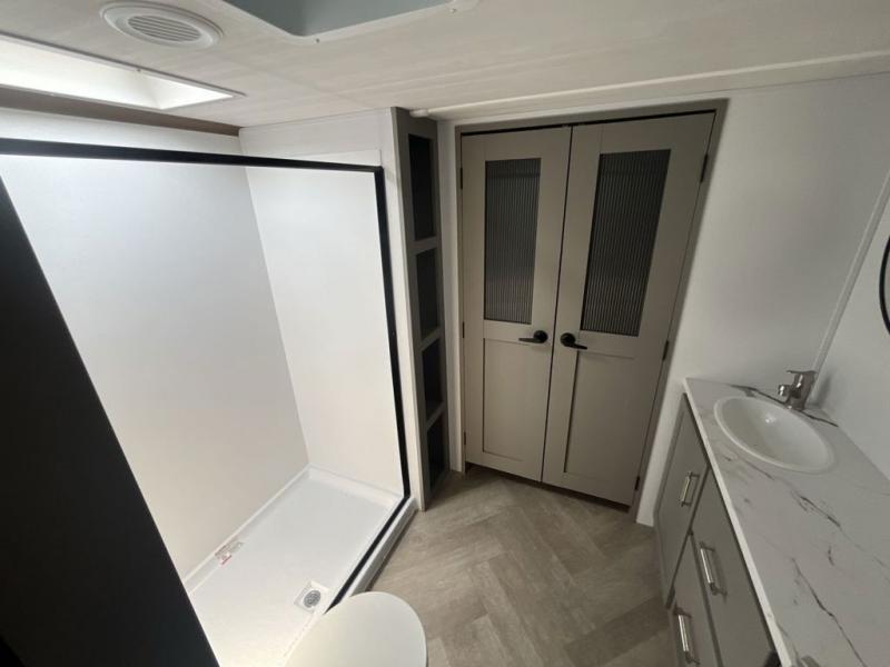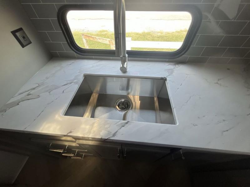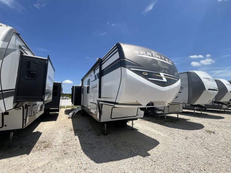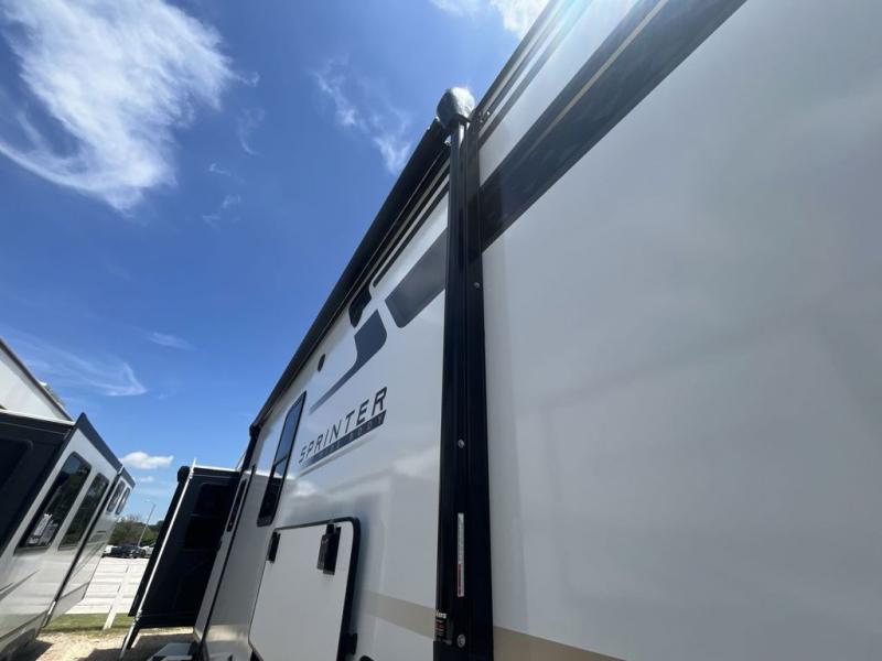 The Sprinter fifth wheels by Keystone feature spacious living areas, plenty of storage, and outstanding towability. Each unit is constructed with 2" aluminum framed and laminated sidewalls, a fully walkable roof, and dual layer insulation to help extend your camping season. The heated pass-through storage includes lockable slam latch baggage doors so you can easily pack your gear, and the one-touch 4-point leveling system features return hookup memory to have you set up in no-time. Head inside to find Congoleum vinyl flooring, Thomas Payne luxury collection furniture, residential style seamless marbled countertops, and an upgraded bedspread to name a few comforts. The Sprinter also includes a Girard tankless on-demand water heater, a central command center, plus a 30k BTU furnace and two A/C units to ensure your comfort!