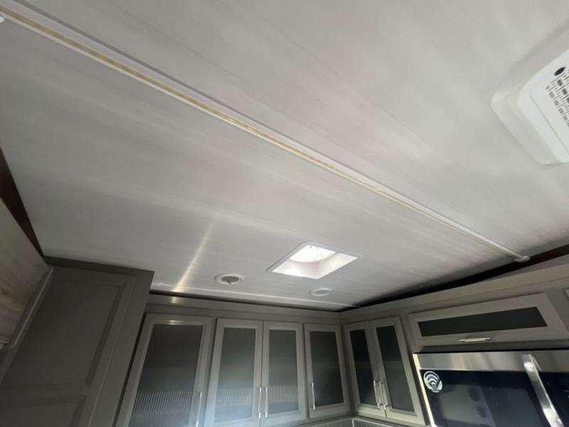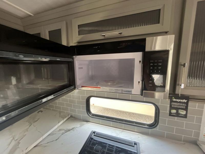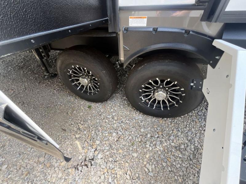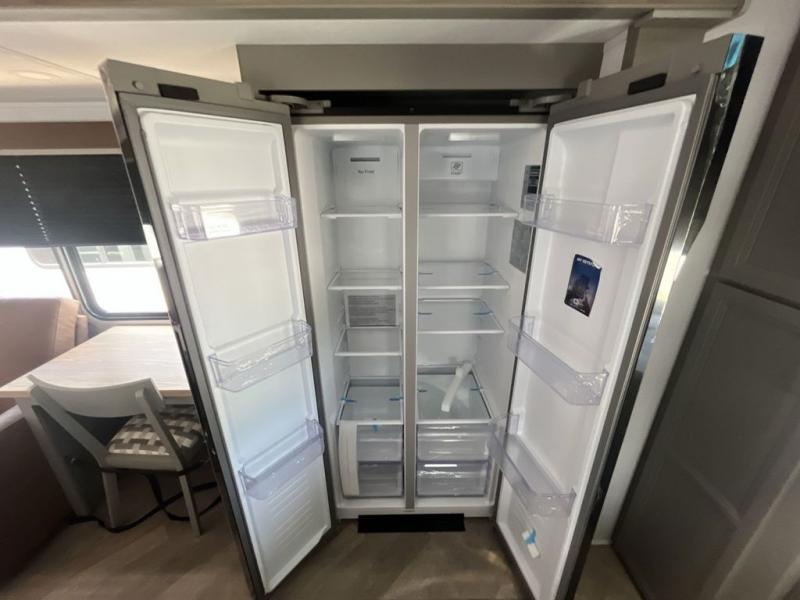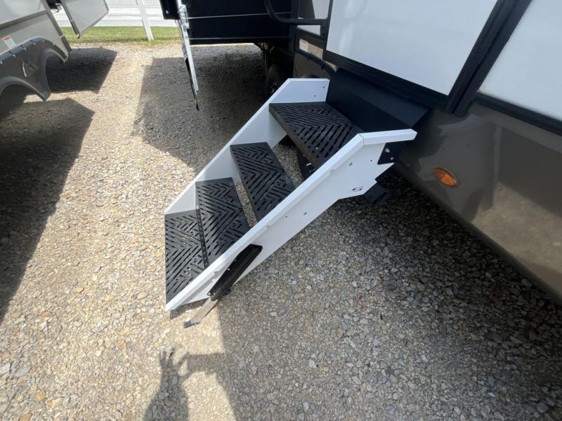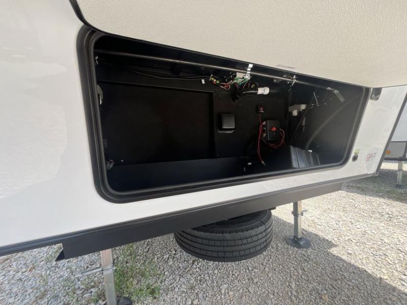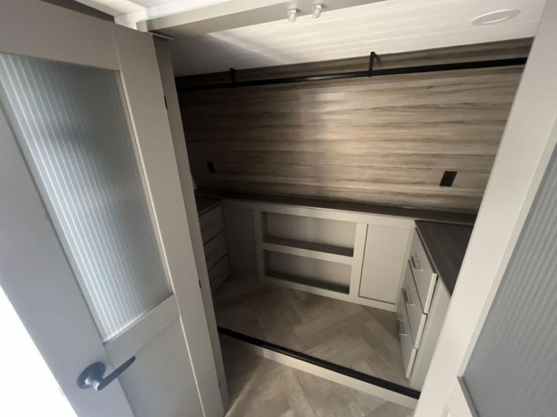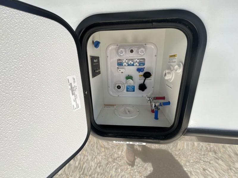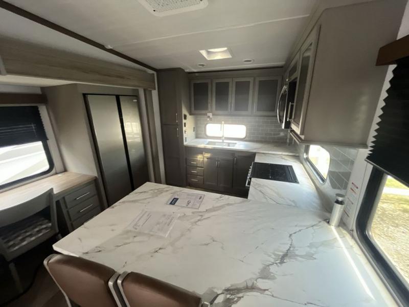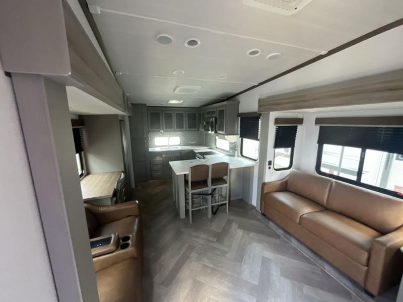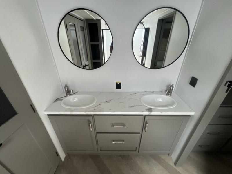 There is much to love about this fifth wheel! Starting with the front full bathroom which has a dual sink vanity for two to get ready at once and heading to the rear kitchen where you will have everything you need to prepare the best home cooked meals. There are also three bar stools at the bar top so guests can socialize with the cook. If you need to get a little work done while you're away, then you can easily get it done at the desk with chair next to the reclining theater seating and the 16 cu. ft. refrigerator for quick access to a snack break. The private bedroom has a king bed slide to lay your head on at night, and if you need an extra sleeping space then you can utilize the sofa slide too. Inside the half bathroom is a countertop with an area prepped for a washer and dryer to be added so you can enjoy clean clothes throughout your entire trip!