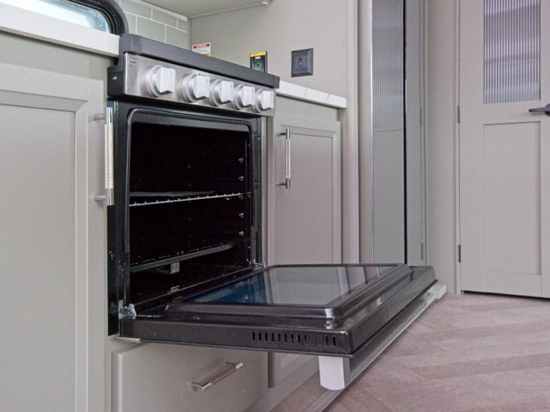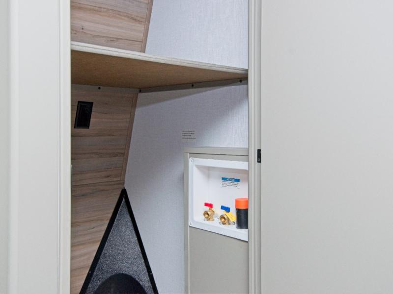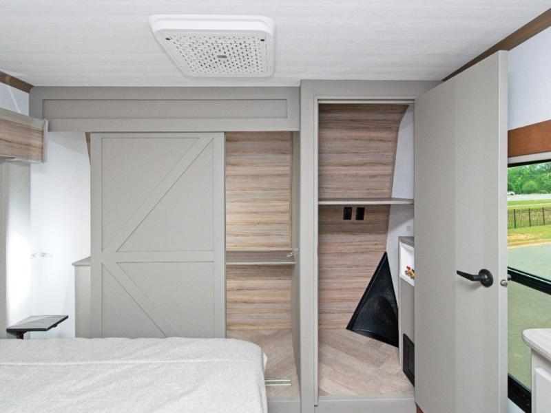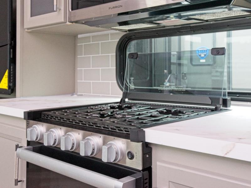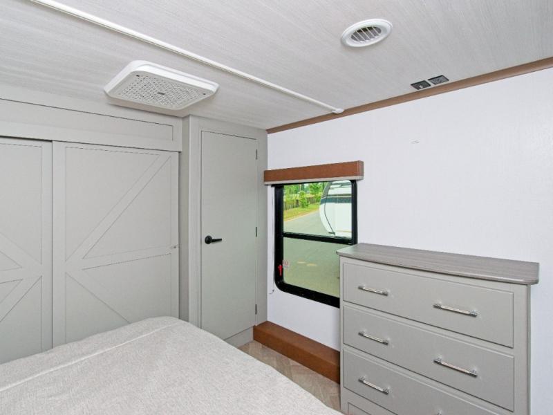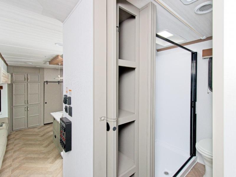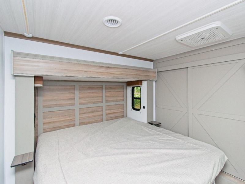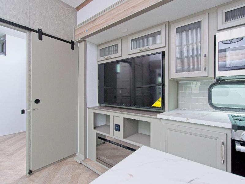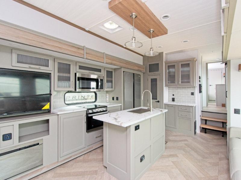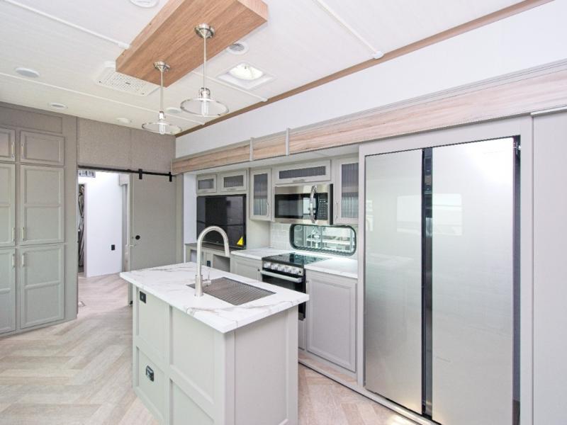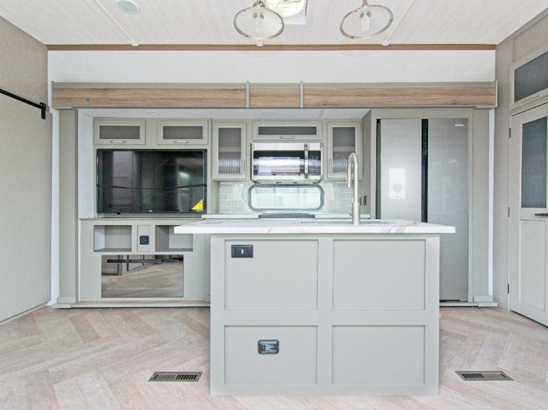 Cook and entertain with ease in the well-appointed kitchen, featuring a three-burner range with a glass top, a 16 cu. ft. 12-volt refrigerator, pantry, hutch, and a solid surface countertop on the center island. The king bed in the bedroom slides out to provide ample floor space, and the front wardrobe offers plenty of storage, with washer and dryer prep for added convenience. The bedroom is also prepped for a TV, ensuring you can unwind in comfort.