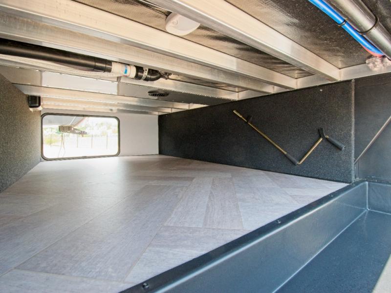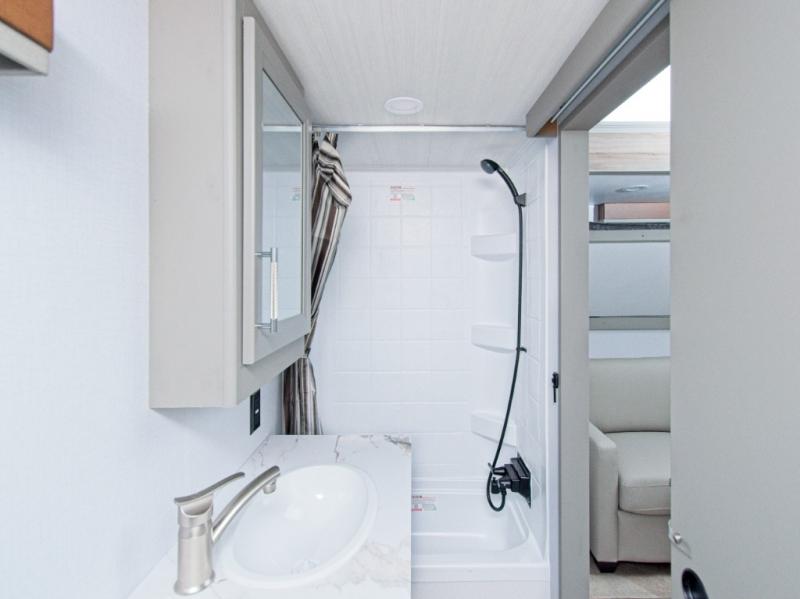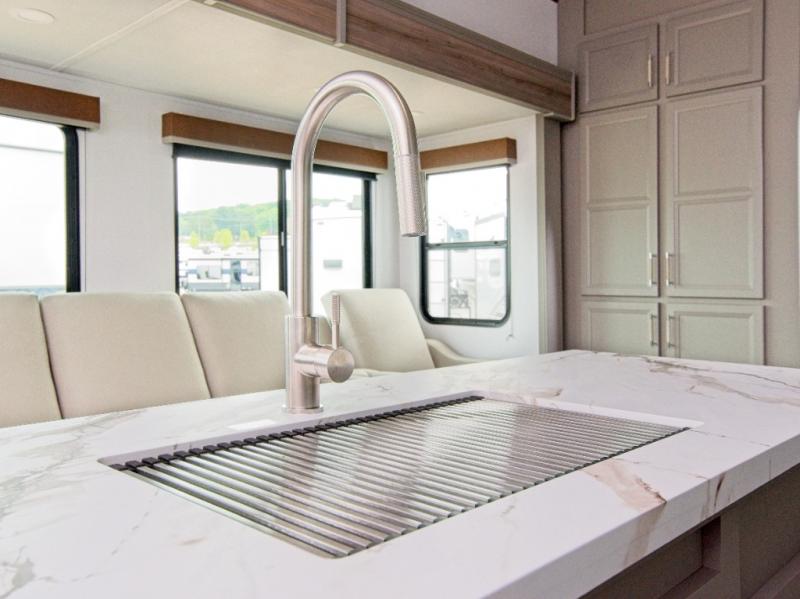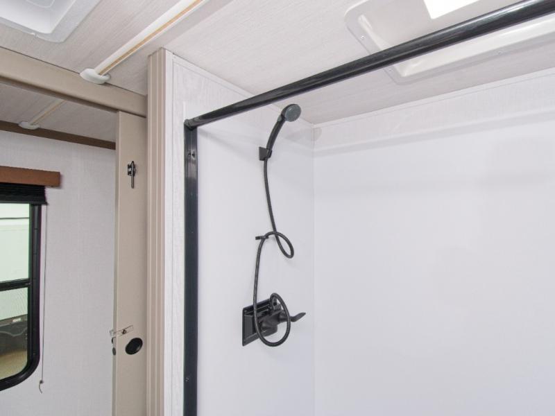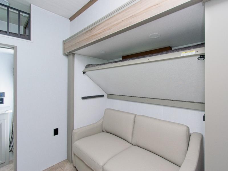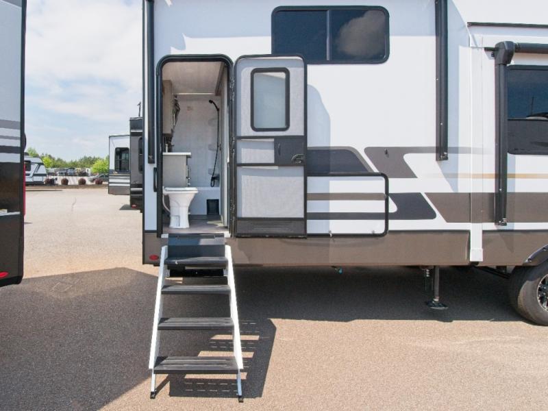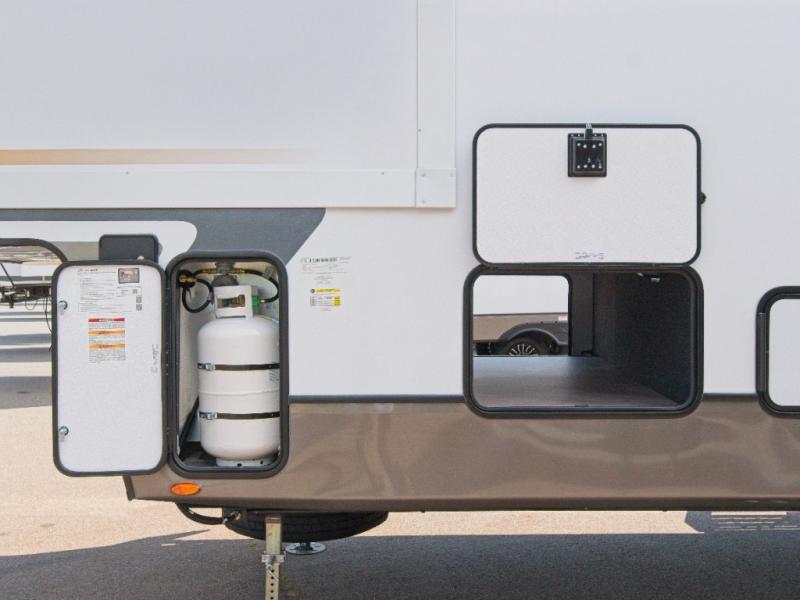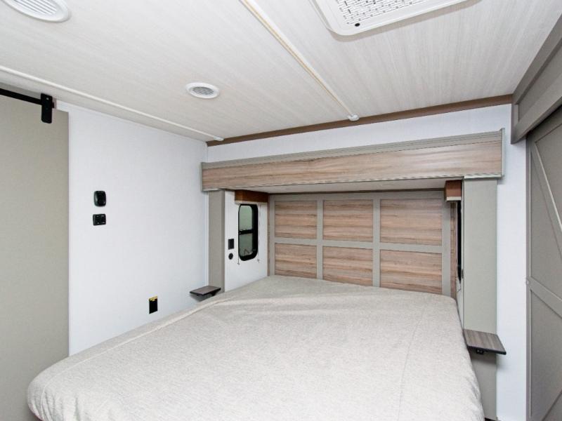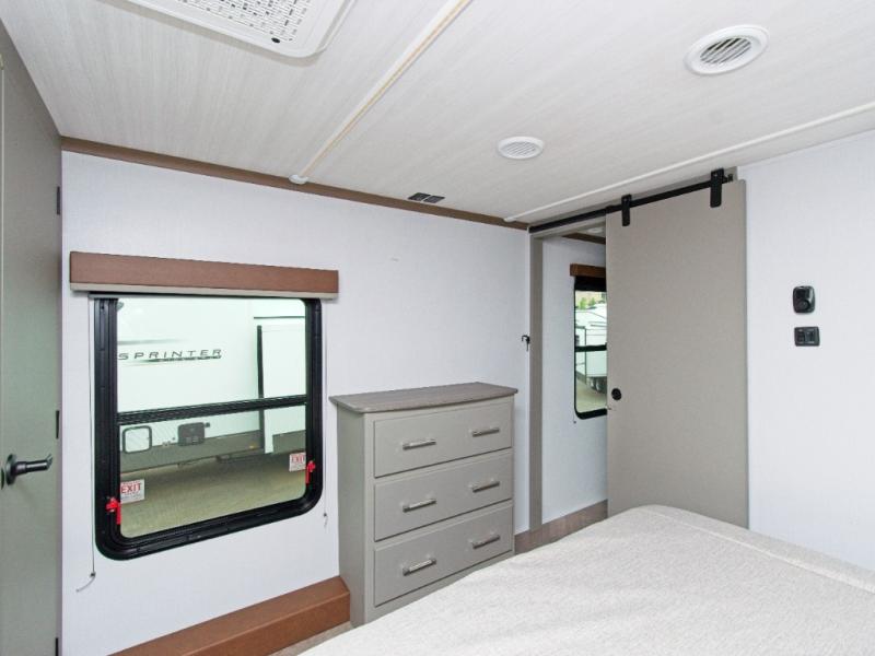 Keystone Sprinter fifth wheels are built for durability and comfort, with 2" aluminum framed and laminated sidewalls, a fully walkable roof, and dual-layer insulation for extended camping seasons. The heated pass-through storage with lockable slam latch baggage doors makes packing a breeze, and the one-touch 4-point leveling system with return hookup memory ensures quick and easy setup. Inside, enjoy Congoleum vinyl flooring, Thomas Payne luxury collection furniture, residential-style seamless marbled countertops, and an upgraded bedspread. Additional features include a Girard tankless on-demand water heater, a central command center, a 30k BTU furnace, and two A/C units for year-round comfort.