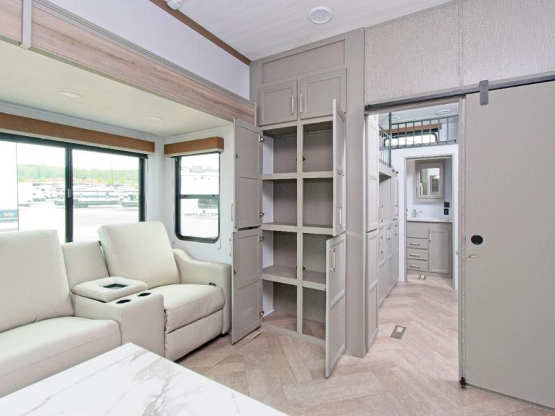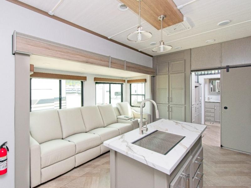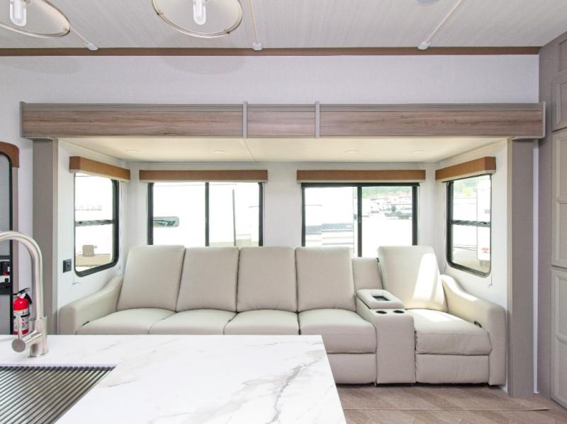 Elevate your family adventures with the Keystone Sprinter 3900DBL, featuring a spacious bunkhouse with a loft for the kids and luxurious theater seating with massage and USB connectivity for ultimate relaxation.