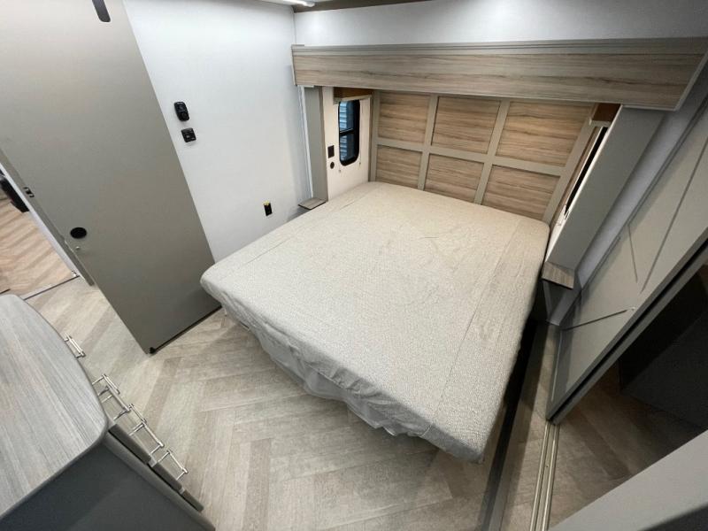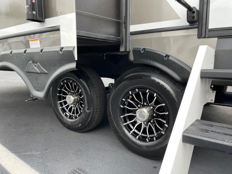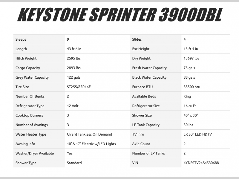 The Sprinter fifth wheels by Keystone feature spacious living areas, plenty of storage, and outstanding towability. Each unit is constructed with 2" aluminum framed and laminated sidewalls, a fully walkable roof, and dual layer insulation to help extend your camping season. The heated pass-through storage includes lockable slam latch baggage doors so you can easily pack your gear, and the one-touch 4-point leveling system features return hookup memory to have you set up in no-time. Head inside to find Congoleum vinyl flooring, Thomas Payne luxury collection furniture, residential style seamless marbled countertops, and an upgraded bedspread to name a few comforts. The Sprinter also includes a Girard tankless on-demand water heater, a central command center, plus a 30k BTU furnace and two A/C units to ensure your comfort!