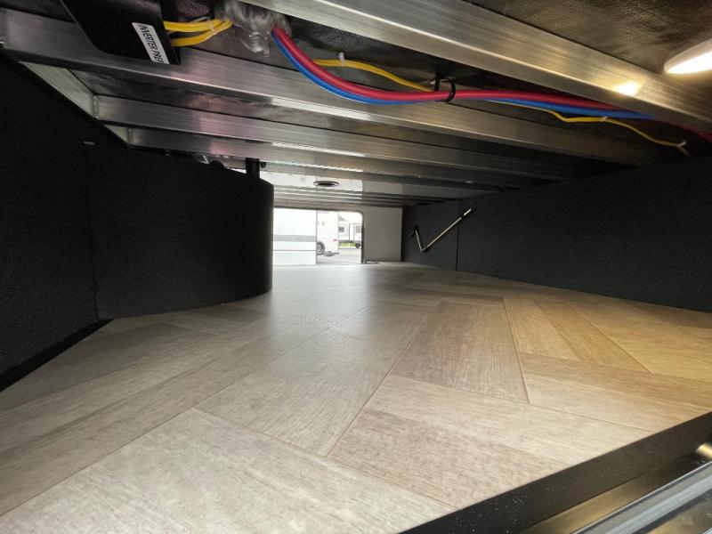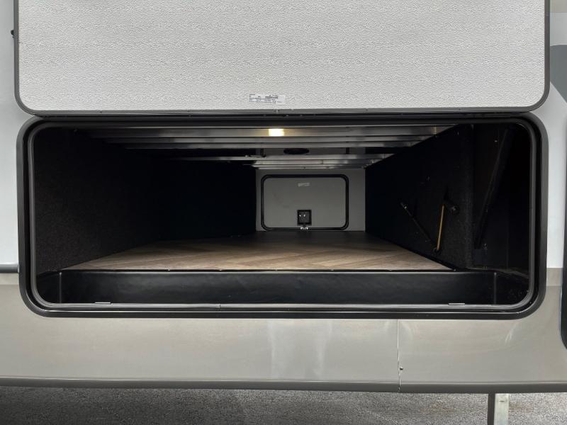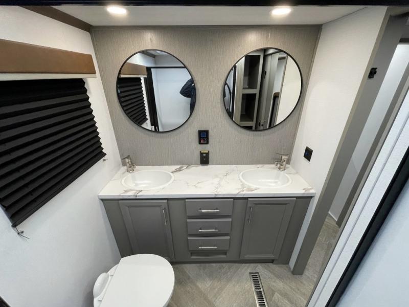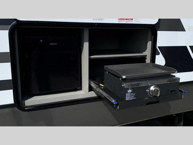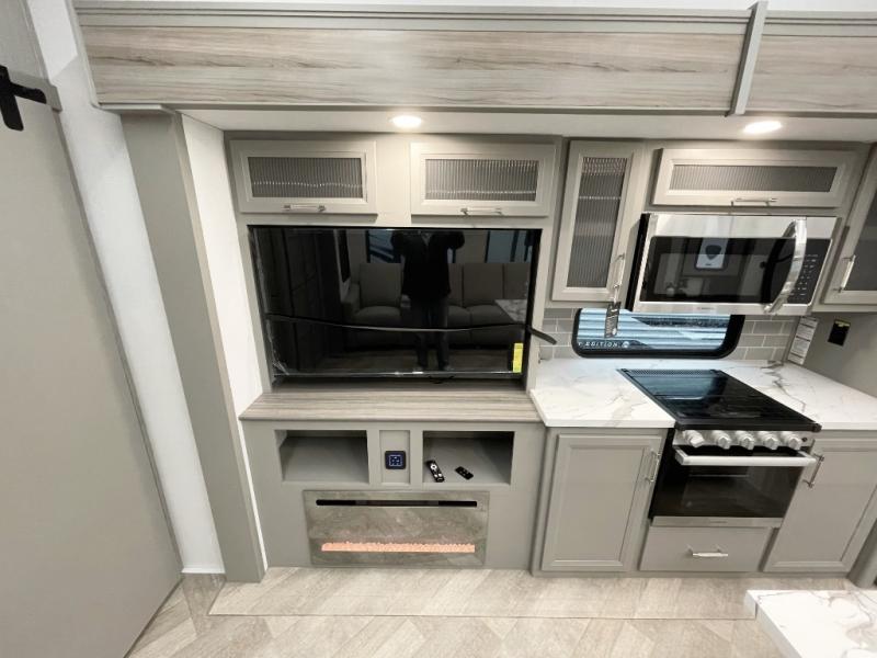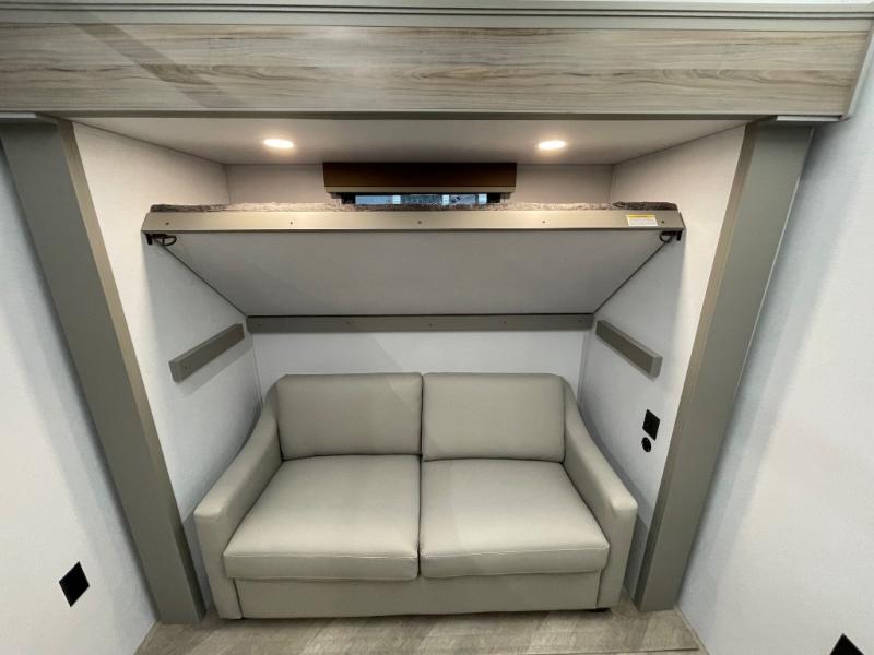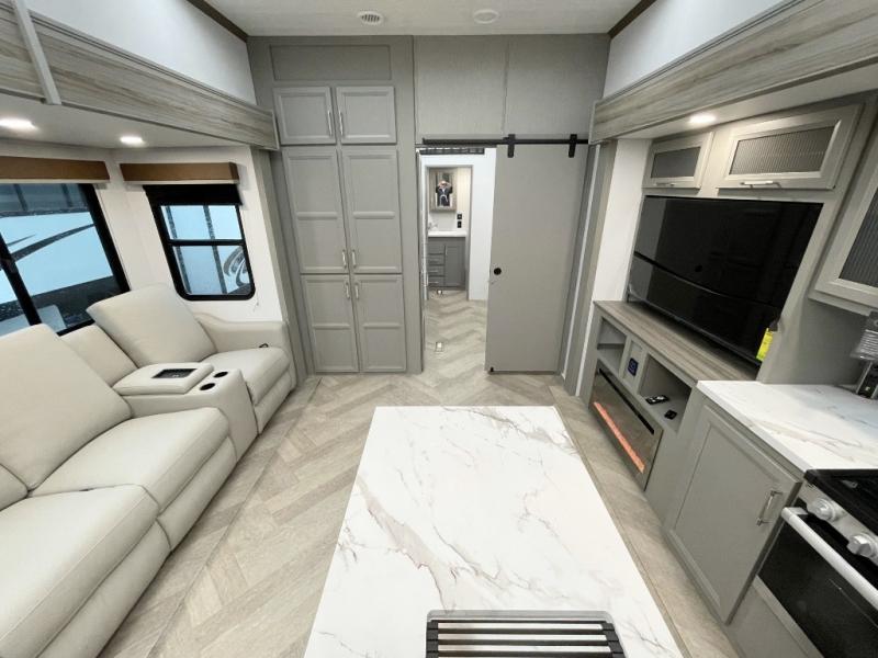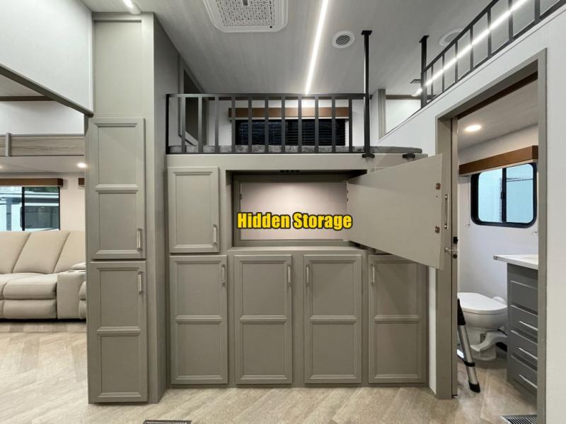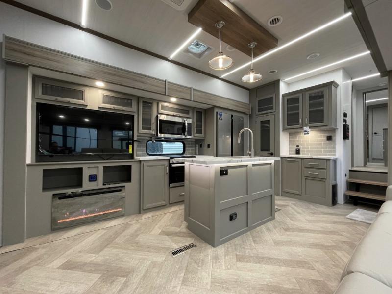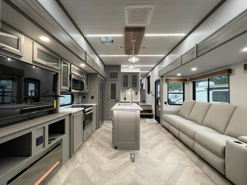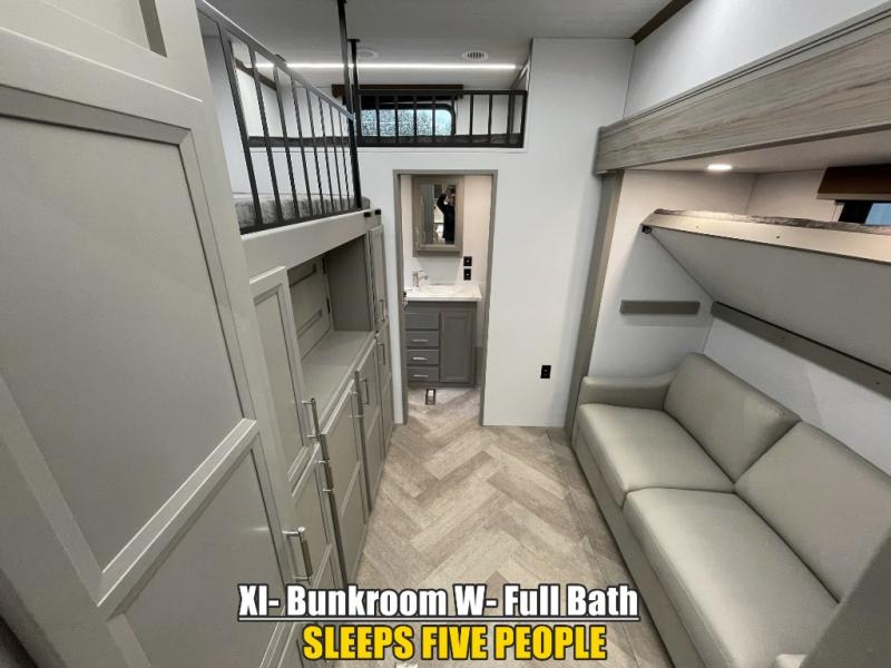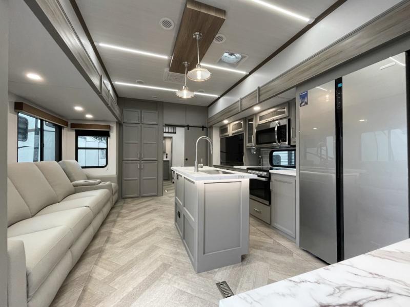 A great family bunkhouse fifth wheel featuring quad slides that really open this entire unit up to provide spacious living throughout. A booth dinette or optional free standing dinette is great for meals, and full reclining theater seating with massage, lights, and USB connectivity make movie night a real treat! The kids will love the rear bunkhouse with a separate bath and private entry for easy access when outside. There is even a loft area above for storage, so they can bring a few friends along as well. The kitchen has all of the features needed to allow you to cook and entertain when you want with a three burner range including a glass top, a 16 cu. ft. 12 volt refrigerator, pantry, hutch for dishes and things, plus a solid surface countertop on the center island that houses your sink. In the bedroom, a king bed slides out to offer more floor space to move about, plus you will find ample storage in the front wardrobe which has also been prepped for a washer and dryer if you choose to add. You can also add a TV in the bedroom since it has been prepped for one as well. And let's not forget the outside two burner cooktop and refrigerator!