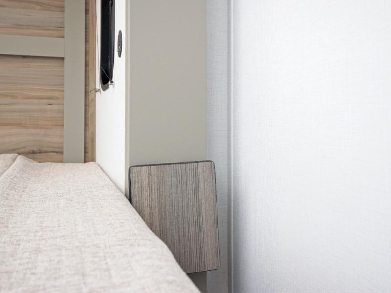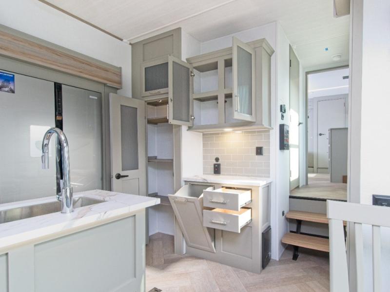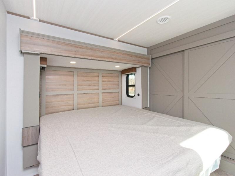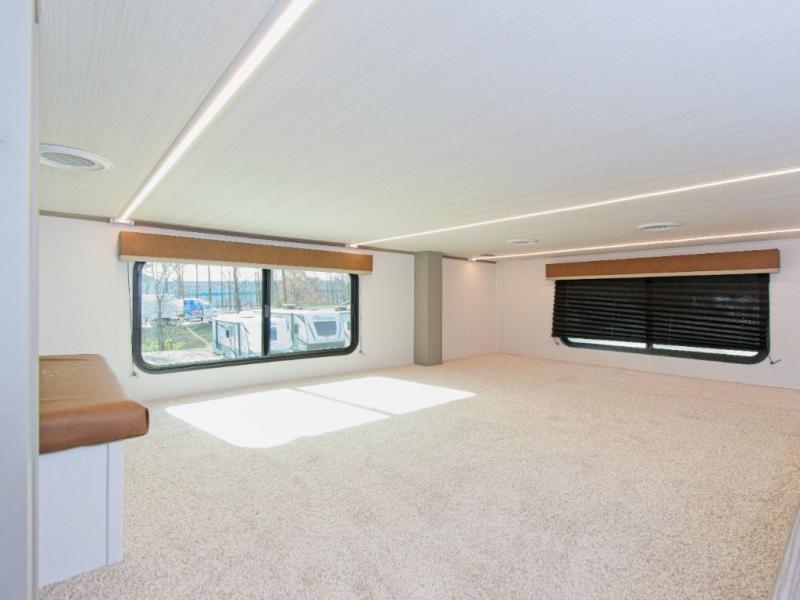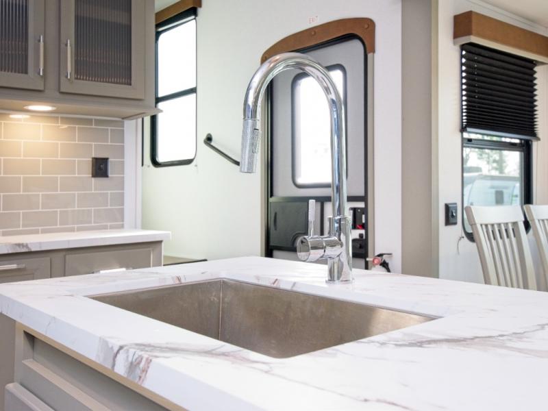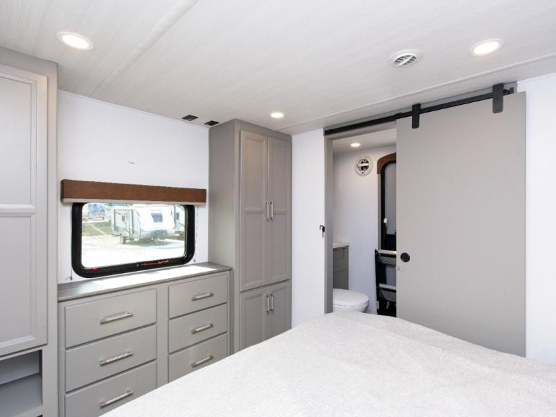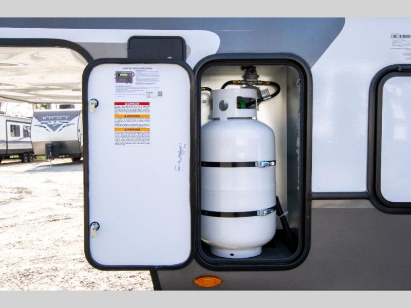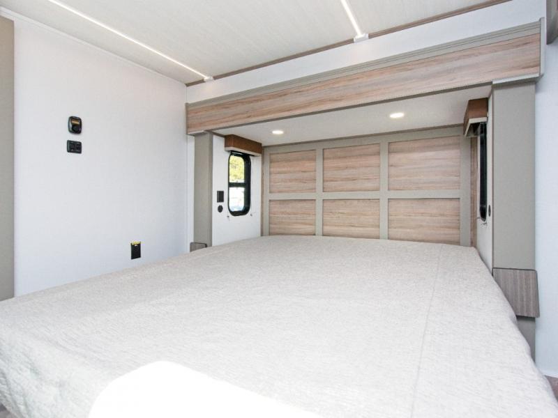 Set up is a breeze with the one-touch 4-point leveling system, which even includes return hookup memory for quick and easy parking. Inside, enjoy high-quality features like Congoleum vinyl flooring, Thomas Payne luxury furniture, seamless residential-style marbled countertops, and an upgraded bedspread for added comfort.