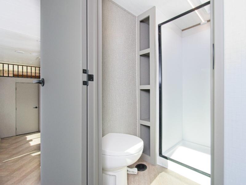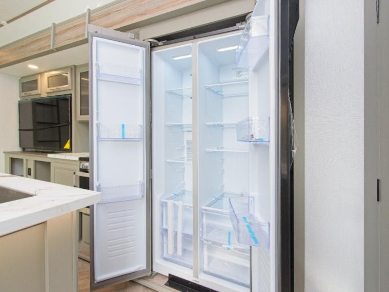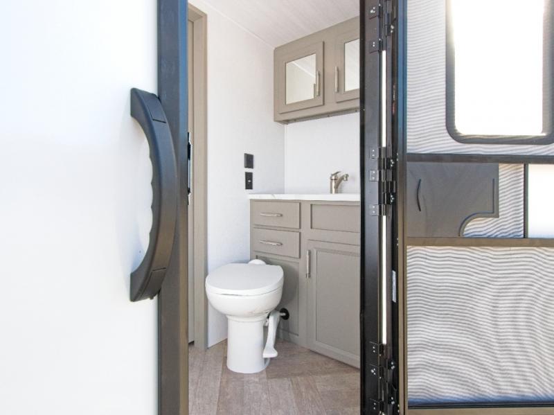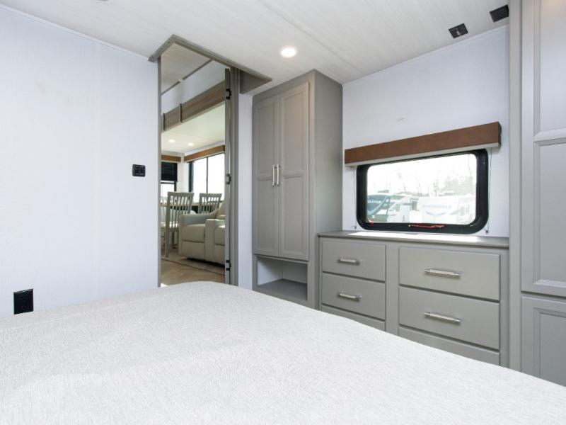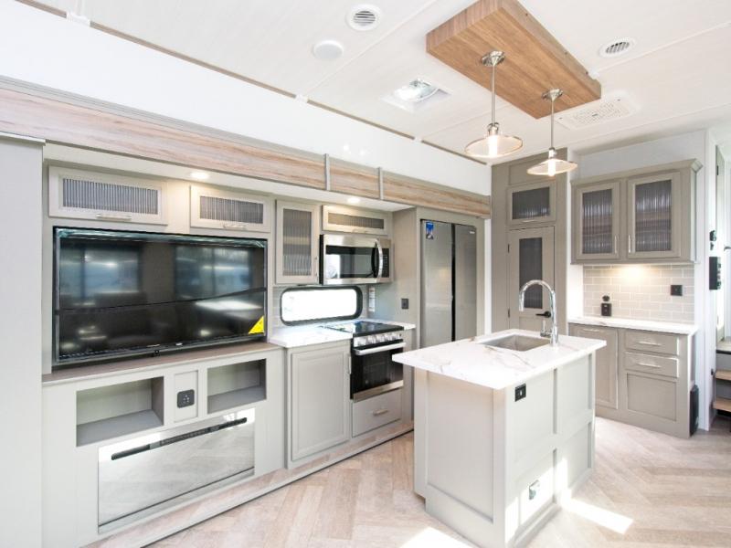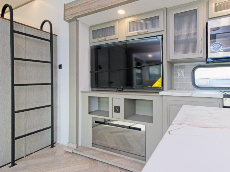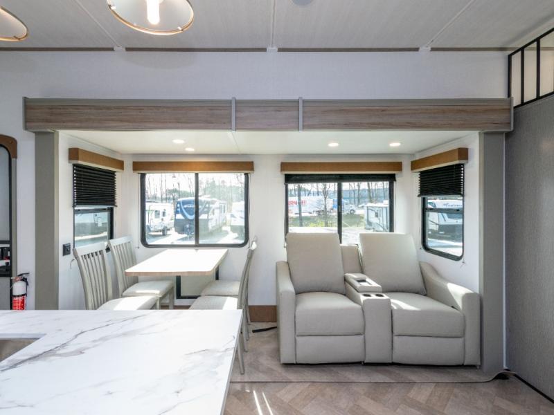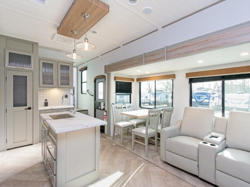 The main living area is perfect for gathering with loved ones—whether you’re relaxing on the theater seating or enjoying a meal at the booth dinette. The full kitchen is designed for convenience, featuring an island, a spacious pantry, a 16 cu. ft. 12V refrigerator, and a hutch for added storage.