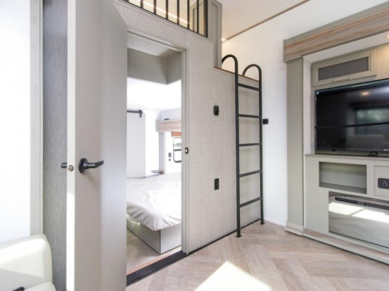 The front private bedroom features a king bed slide-out with convenient storage underneath, plus a wardrobe with a shelf and a closet prepped for a washer and dryer. Enjoy the luxury of the master suite, which includes a second king bed slide-out, dual wardrobes, a dresser, and a full rear bath with dual entry doors for easy access. Above this suite, the loft area provides ample space for extra sleeping or an entertainment/gaming center, complete with a ladder for easy access.