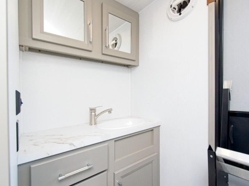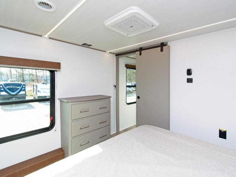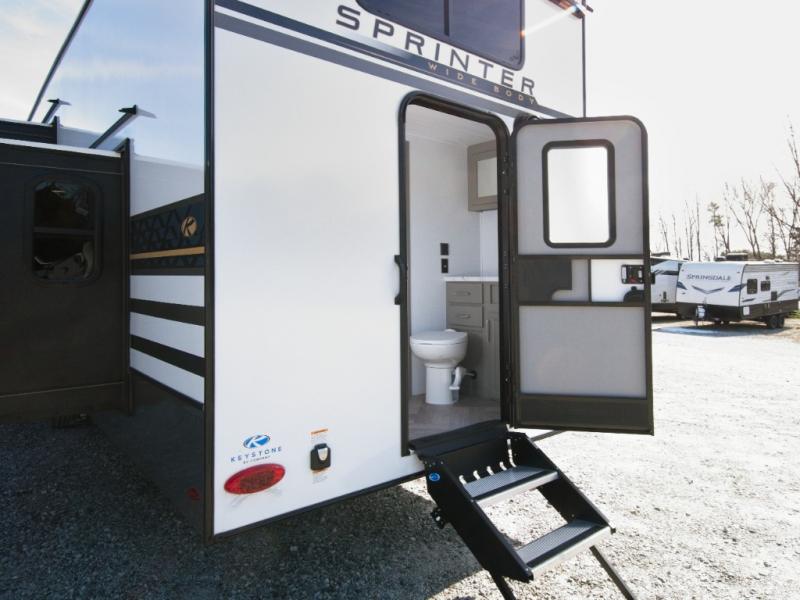 The Keystone Sprinter fifth wheel is engineered for maximum comfort and convenience with spacious living areas and abundant storage options. The construction features 2” aluminum framed laminated sidewalls, a fully walkable roof, and dual-layer insulation, making it perfect for extending your camping season. The heated pass-through storage comes with lockable slam latch baggage doors, ensuring your gear is secure and easy to access.