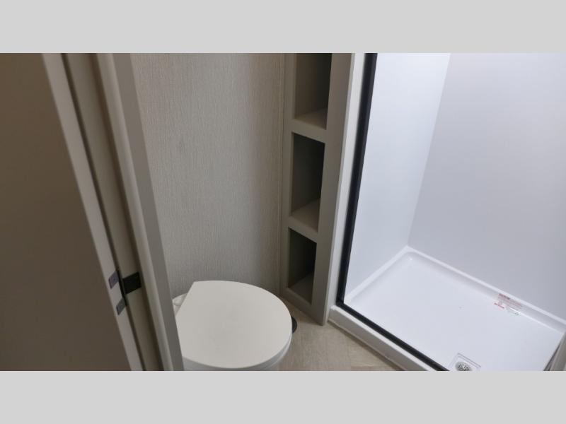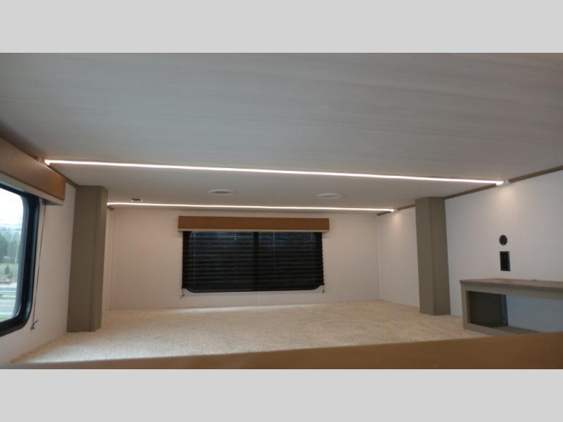 Two bedrooms and two full baths make this fifth wheel perfect for camping with friends and family! The front bedroom includes a king bed slide out with storage underneath, a wardrobe with a shelf, plus a closet with washer and dryer prep if you want to add these appliances. The master suite includes a second king bed slide out, dual wardrobes and a dresser, plus a full rear bath with one of the dual entry doors. There is also a loft area above this room with plenty of space, an entertainment/gaming center, and a ladder. Everyone can meet in the main living area to relax on the theater seating or dine at the booth dinette. And a full kitchen is complete with an island, pantry, 16 cu. ft. 12V refrigerator, and a hutch to name a few convenient features!