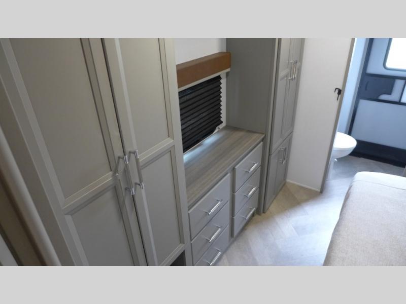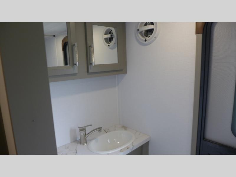 The Sprinter fifth wheels by Keystone feature spacious living areas, plenty of storage, and outstanding towability. Each unit is constructed with 2" aluminum framed and laminated sidewalls, a fully walkable roof, and dual layer insulation to help extend your camping season. The heated pass-through storage includes lockable slam latch baggage doors so you can easily pack your gear, and the one-touch 4-point leveling system features return hookup memory to have you set up in no-time. Head inside to find Congoleum vinyl flooring, Thomas Payne luxury collection furniture, residential style seamless marbled countertops, and an upgraded bedspread to name a few comforts. The Sprinter also includes a Girard tankless on-demand water heater, a central command center, plus a 30k BTU furnace and two A/C units to ensure your comfort!