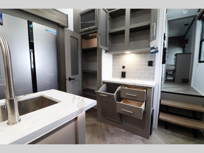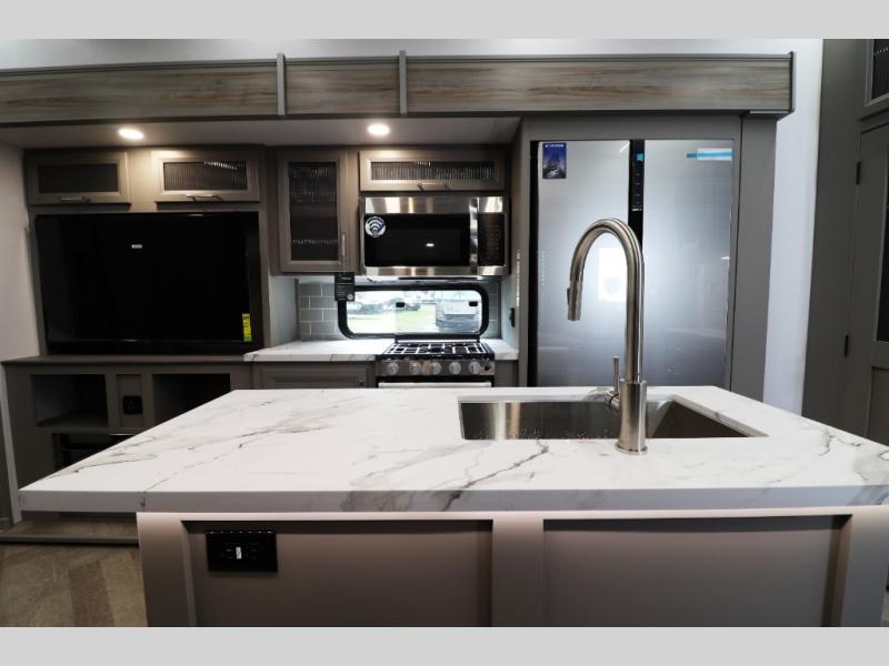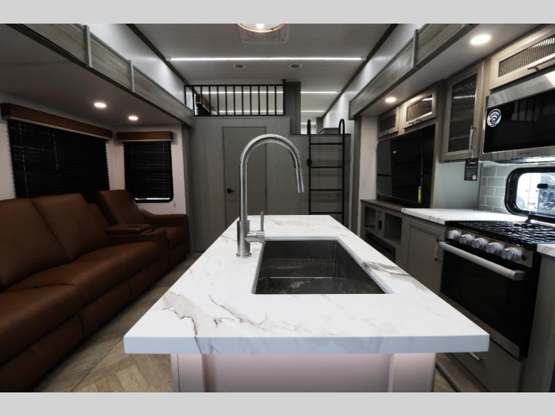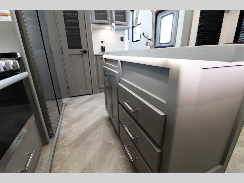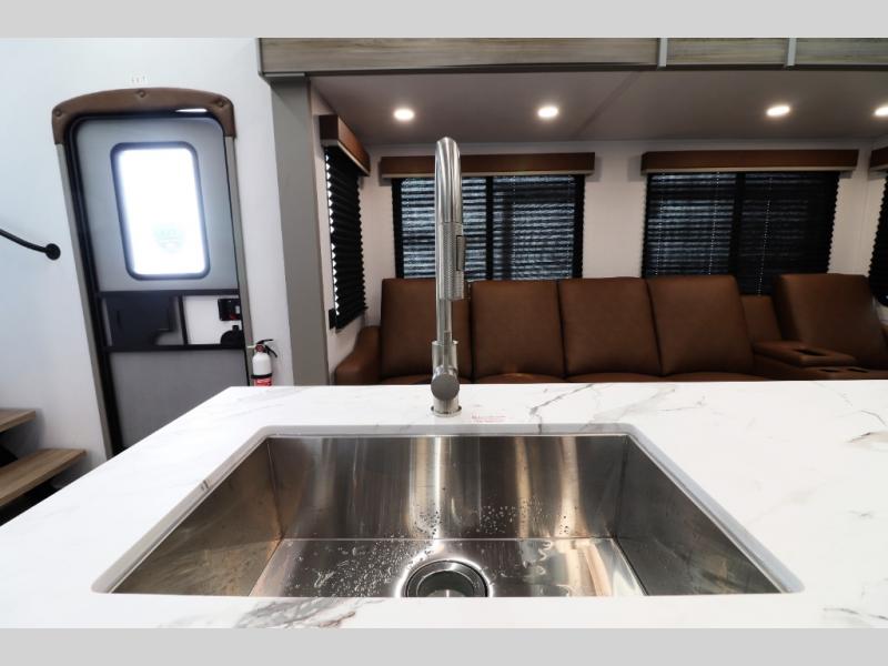 Modern Kitchen: Equipped with residential-style seamless marbled countertops, a deep single-basin stainless steel industrial sink, and a 16 cu. ft. 12V refrigerator, meal preparation becomes a delight.