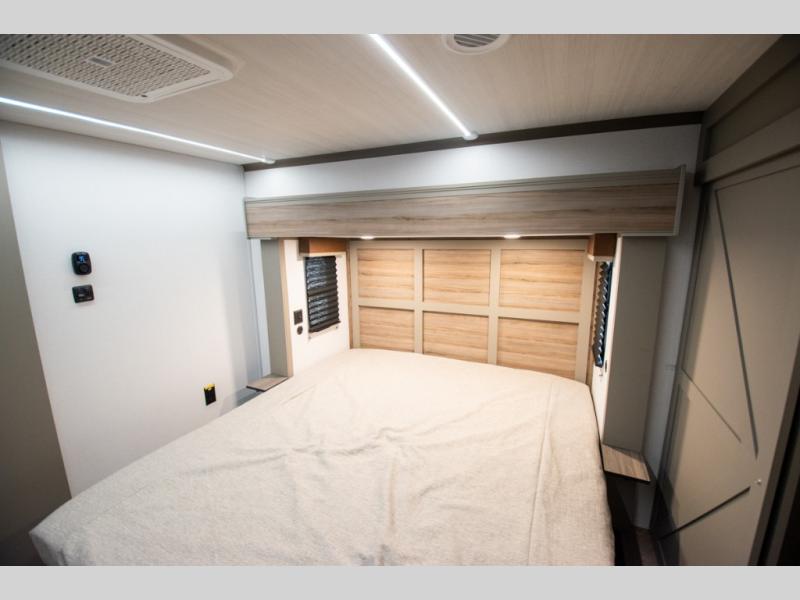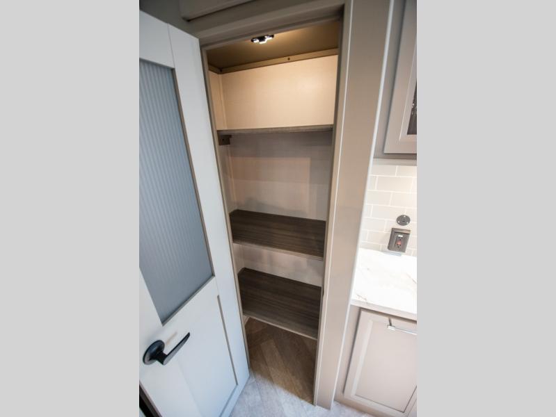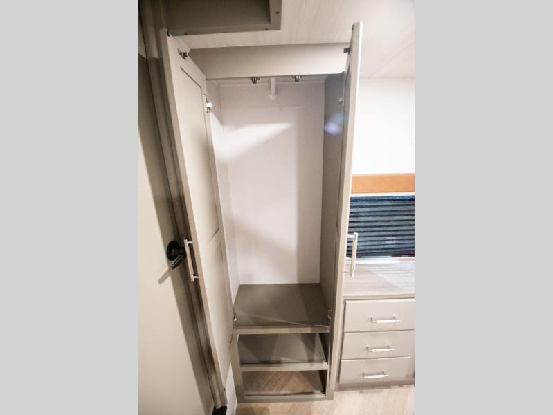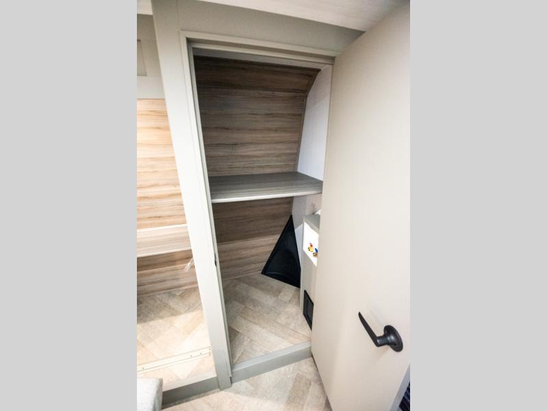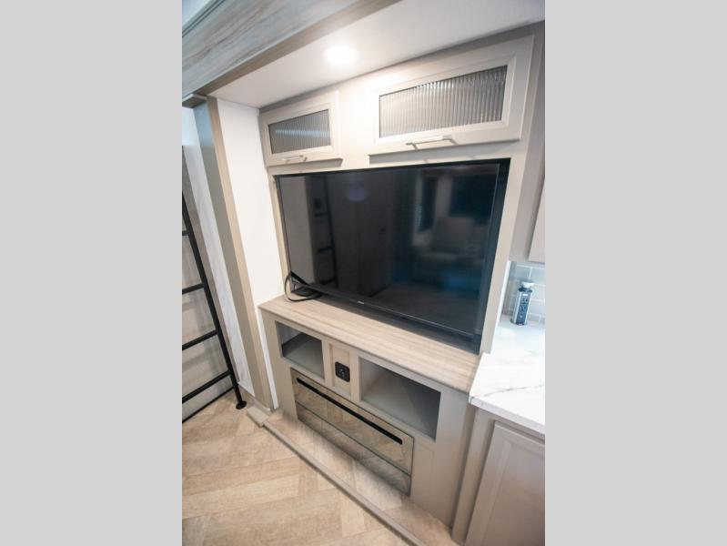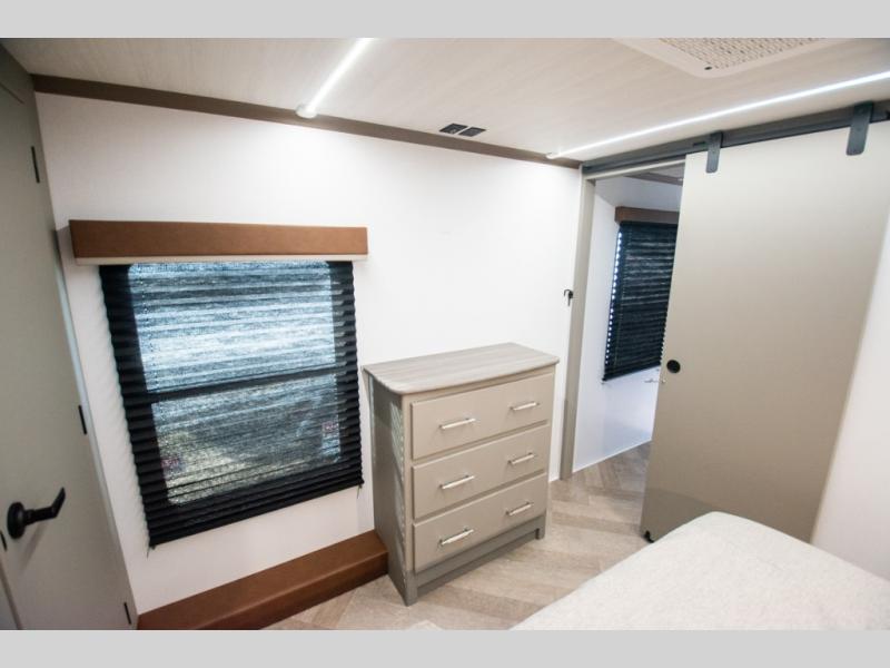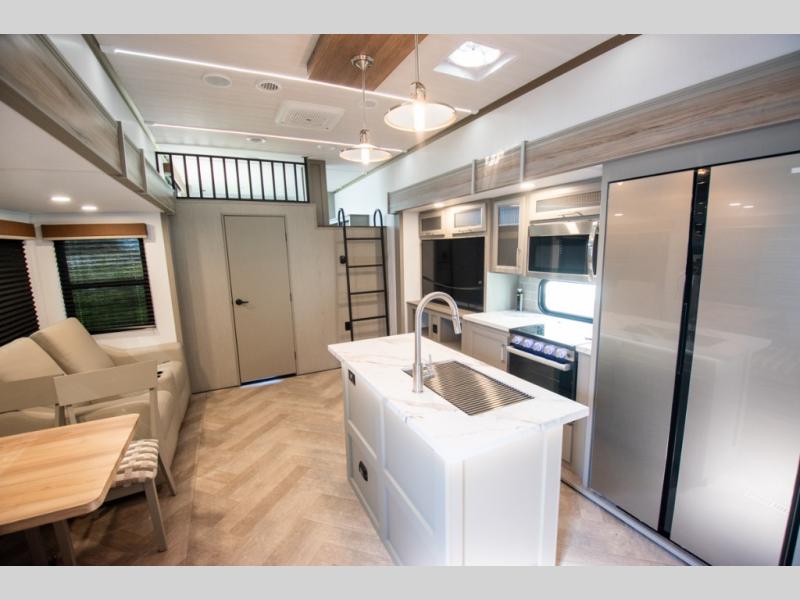 Two bedrooms and two full baths make this fifth wheel perfect for camping with friends and family! The front bedroom includes a king bed slide out with storage underneath, a wardrobe with a shelf, plus a closet with washer and dryer prep if you want to add these appliances. The master suite includes a second king bed slide out, dual wardrobes and a dresser, plus a full rear bath with one of the dual entry doors. There is also a loft area above this room with plenty of space, an entertainment/gaming center, and a ladder. Everyone can meet in the main living area to relax on the theater seating or dine at the booth dinette. And a full kitchen is complete with an island, pantry, 16 cu. ft. 12V refrigerator, and a hutch to name a few convenient features!