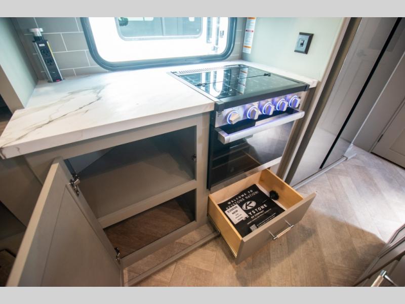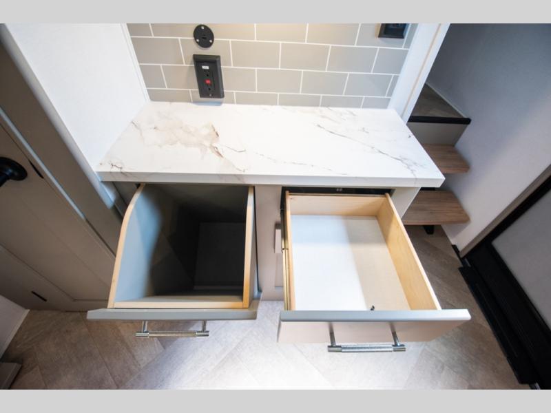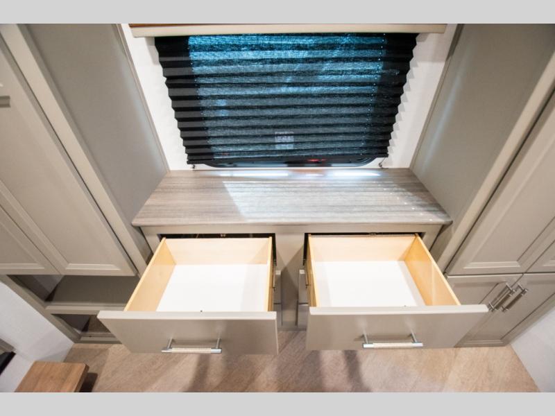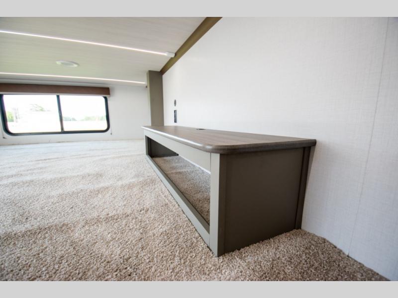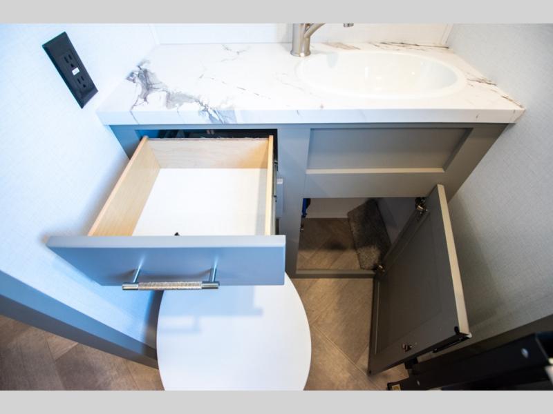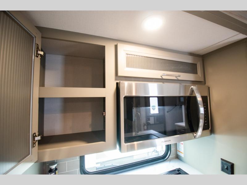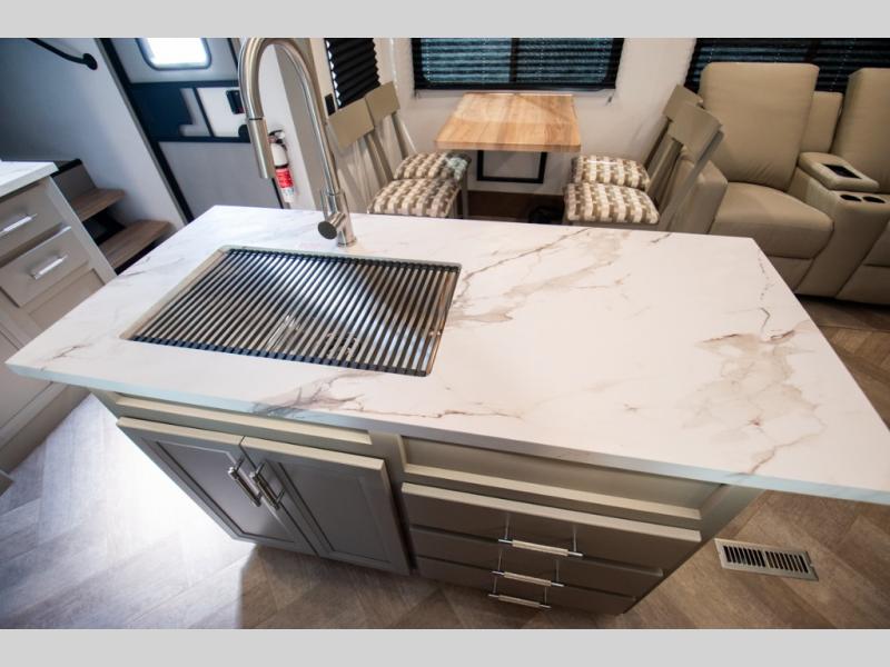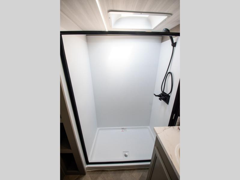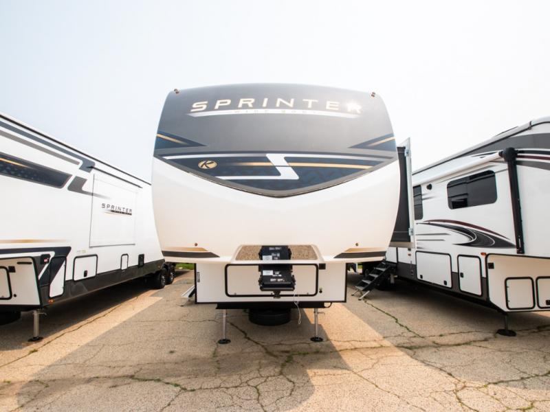 The Sprinter fifth wheels by Keystone feature spacious living areas, plenty of storage, and outstanding towability. Each unit is constructed with 2" aluminum framed and laminated sidewalls, a fully walkable roof, and dual layer insulation to help extend your camping season. The heated pass-through storage includes lockable slam latch baggage doors so you can easily pack your gear, and the one-touch 4-point leveling system features return hookup memory to have you set up in no-time. Head inside to find Congoleum vinyl flooring, Thomas Payne luxury collection furniture, residential style seamless marbled countertops, and an upgraded bedspread to name a few comforts. The Sprinter also includes a Girard tankless on-demand water heater, a central command center, plus a 30k BTU furnace and two A/C units to ensure your comfort!