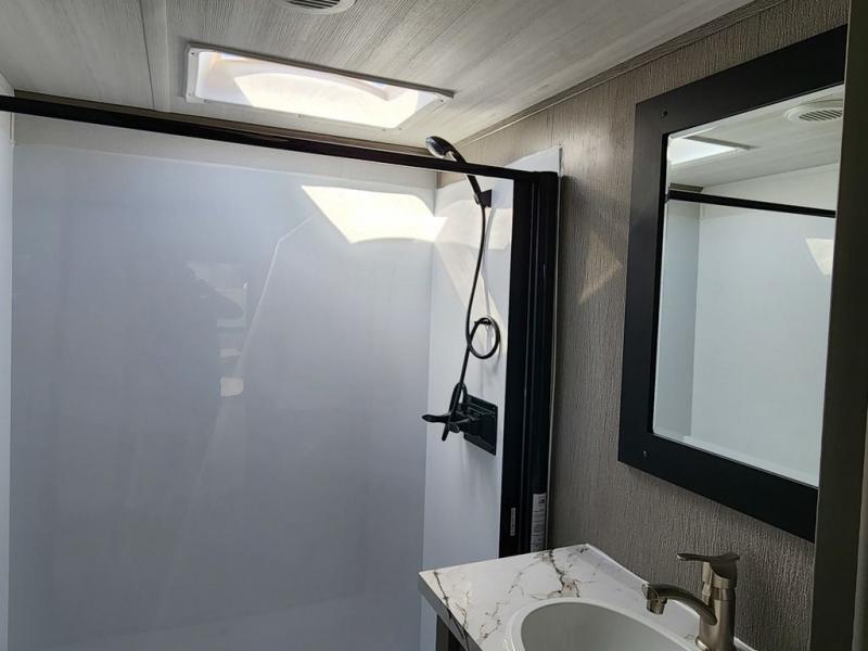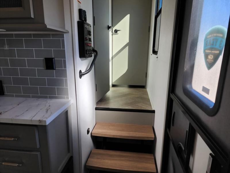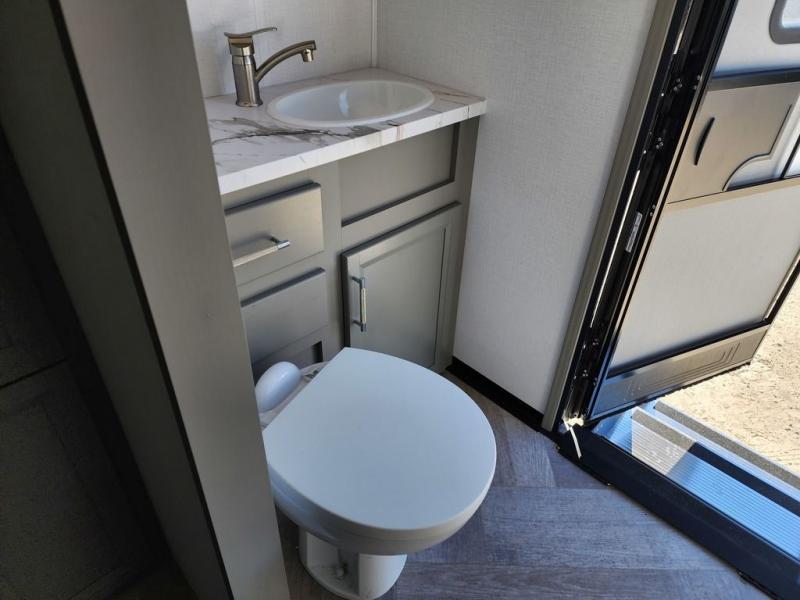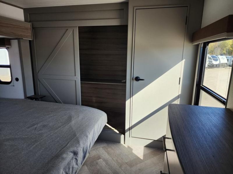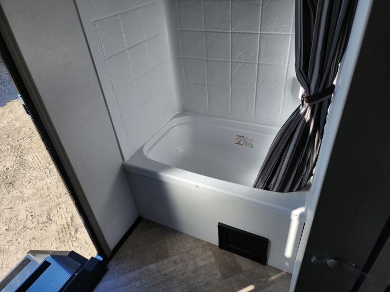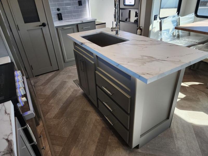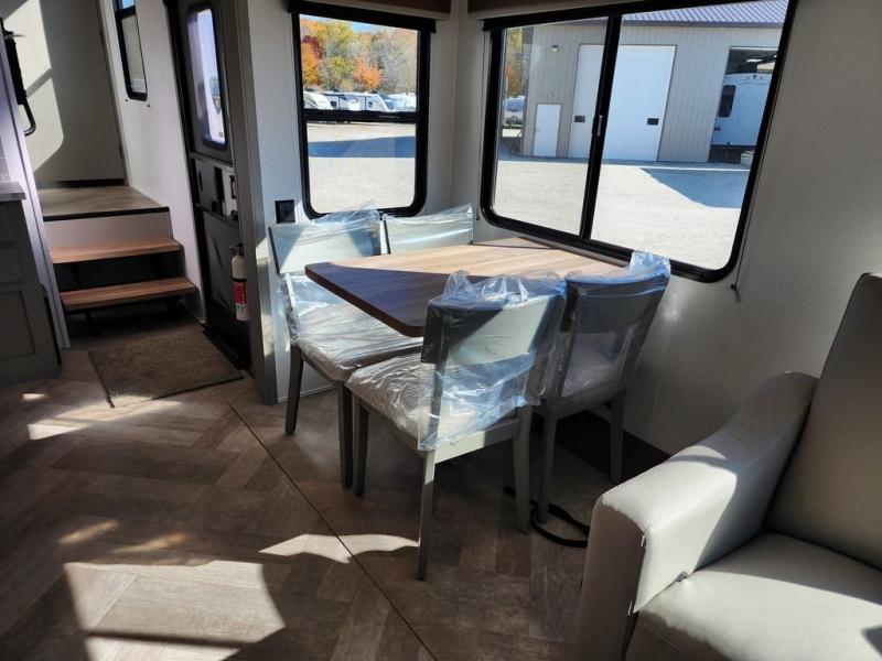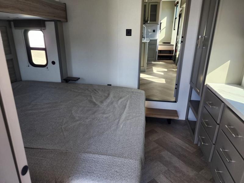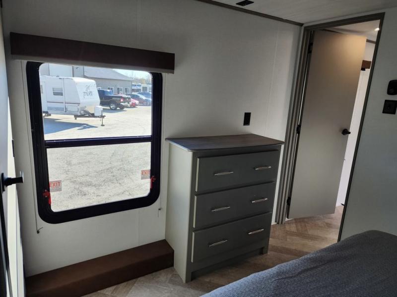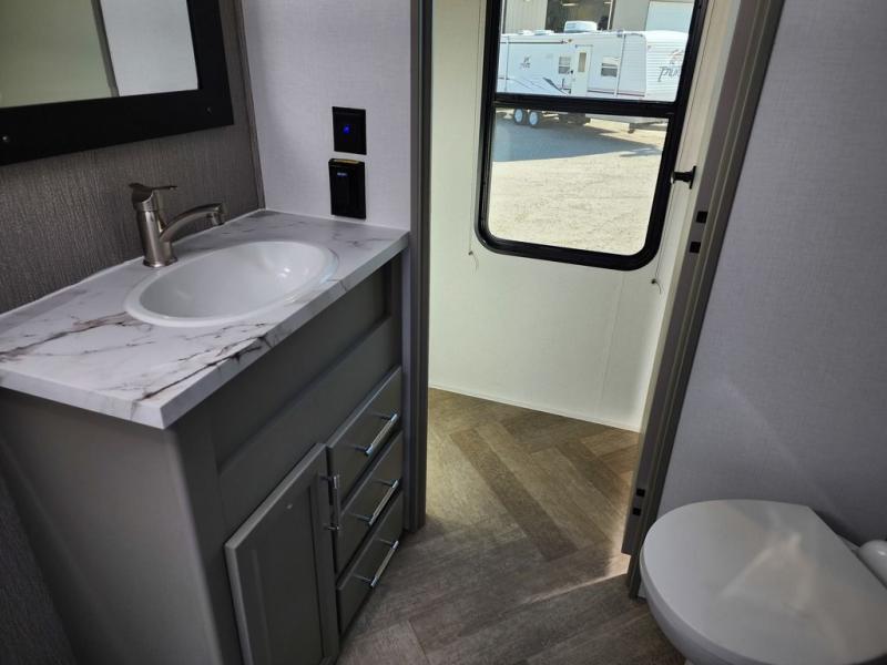 The Sprinter fifth wheels by Keystone feature spacious living areas, plenty of storage, and outstanding towability. Each unit is constructed with 2" aluminum framed and laminated sidewalls, a fully walkable roof, and dual layer insulation to help extend your camping season. The heated pass-through storage includes lockable slam latch baggage doors so you can easily pack your gear, and the one-touch 4-point leveling system features return hookup memory to have you set up in no-time. Head inside to find Congoleum vinyl flooring, Thomas Payne luxury collection furniture, residential style seamless marbled countertops, and an upgraded bedspread to name a few comforts. The Sprinter also includes a Girard tankless on-demand water heater, a central command center, plus a 30k BTU furnace and two A/C units to ensure your comfort!