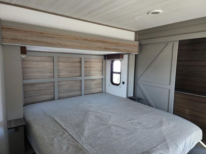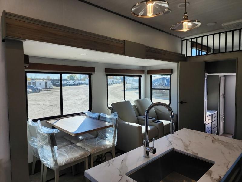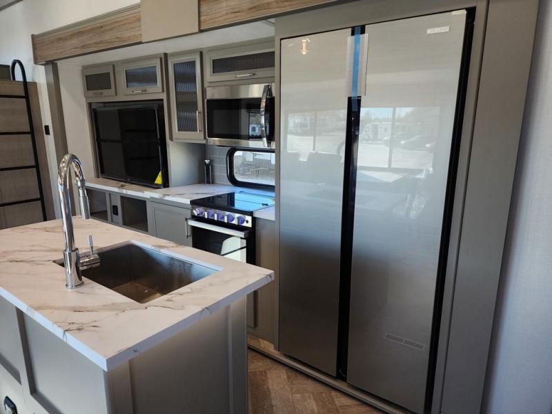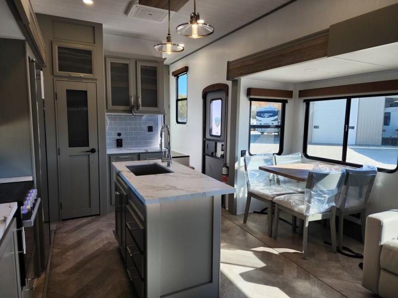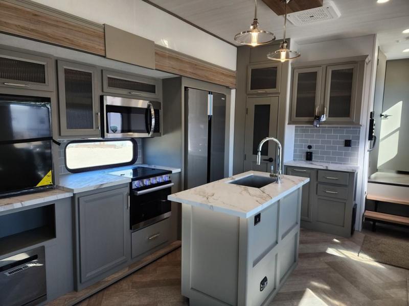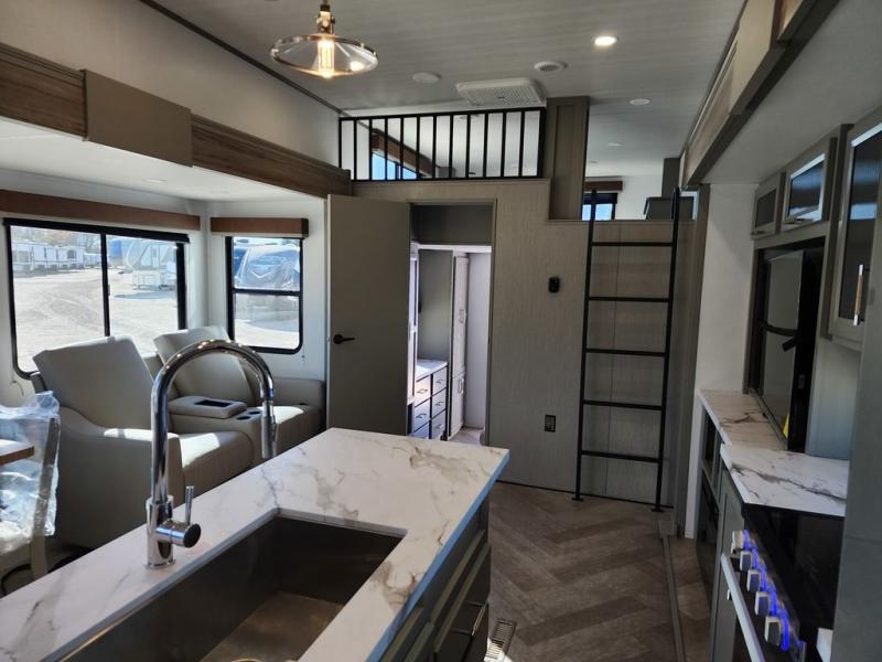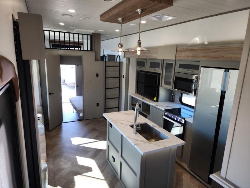 Two bedrooms and two full baths make this fifth wheel perfect for camping with friends and family! The front bedroom includes a king bed slide out with storage underneath, a wardrobe with a shelf, plus a closet with washer and dryer prep if you want to add these appliances. The master suite includes a second king bed slide out, dual wardrobes and a dresser, plus a full rear bath with one of the dual entry doors. There is also a loft area above this room with plenty of space, an entertainment/gaming center, and a ladder. Everyone can meet in the main living area to relax on the theater seating or dine at the booth dinette. And a full kitchen is complete with an island, pantry, 16 cu. ft. 12V refrigerator, and a hutch to name a few convenient features!