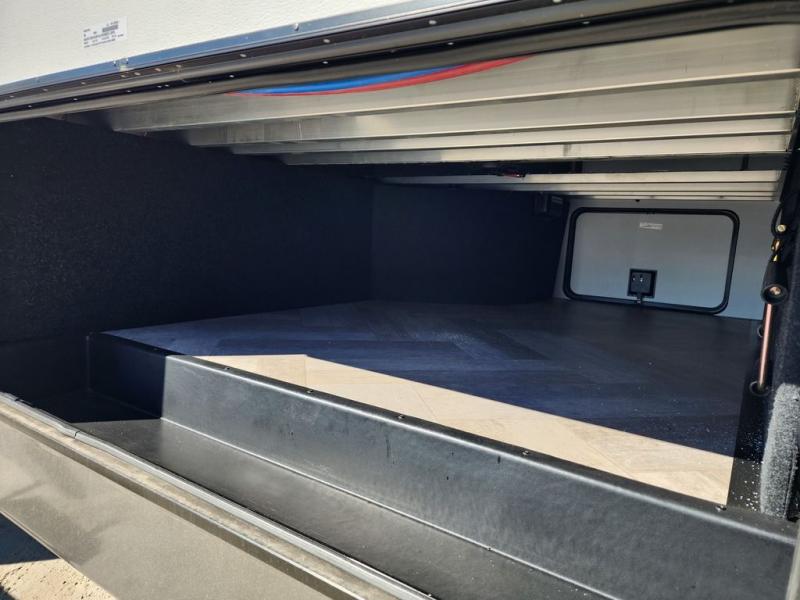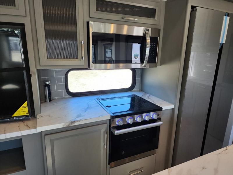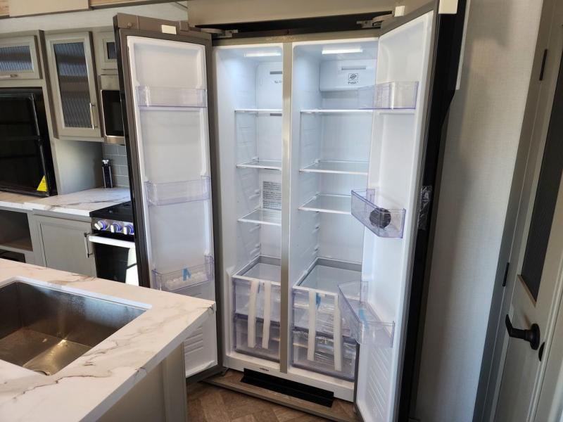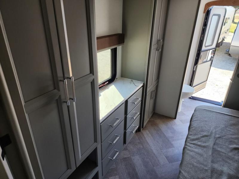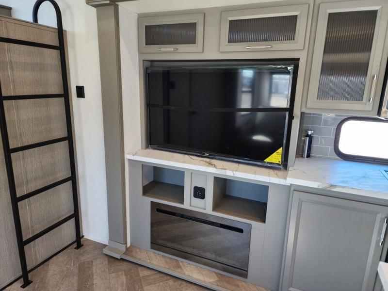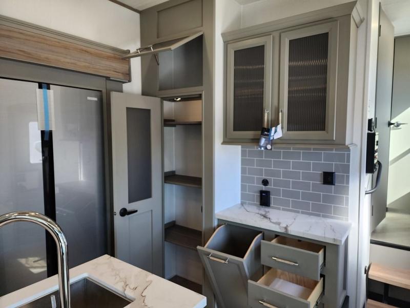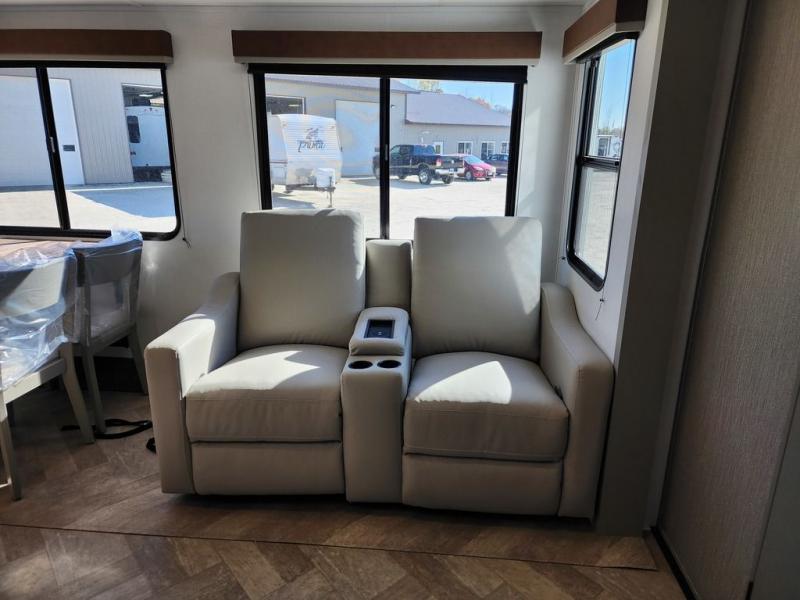 Two bedrooms and two full baths make this fifth wheel perfect for camping with friends and family! The front bedroom includes a king bed slide out with storage underneath, a wardrobe with a shelf, plus a closet with washer and dryer prep if you want to add these appliances. The master suite includes a second king bed slide out, dual wardrobes and a dresser, plus a full rear bath with one of the dual entry doors. There is also a loft area above this room with plenty of space, an entertainment/gaming center, and a ladder. Everyone can meet in the main living area to relax on the theater seating or dine at the booth dinette. And a full kitchen is complete with an island, pantry, 16 cu. ft. 12V refrigerator, and a hutch to name a few convenient features!
