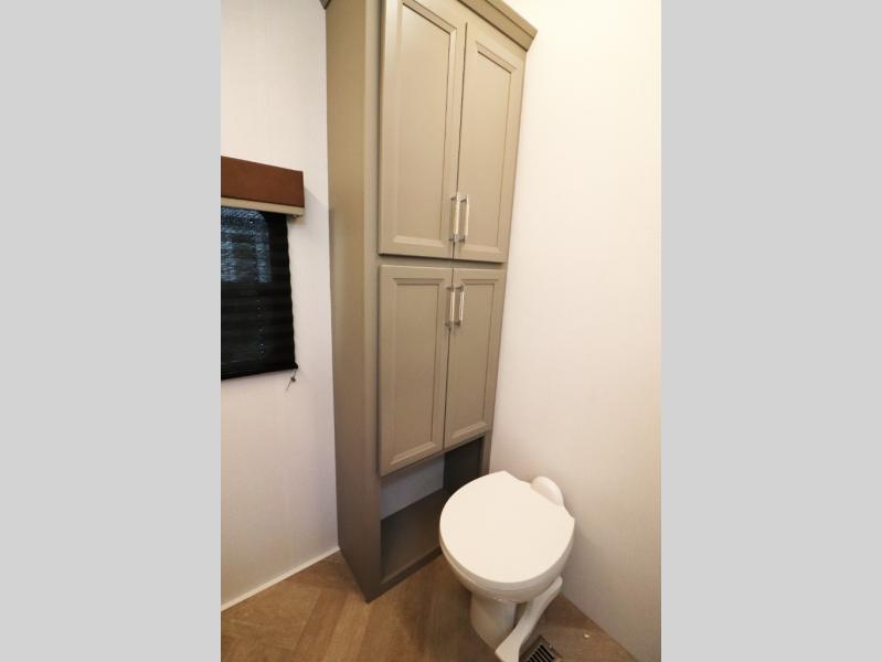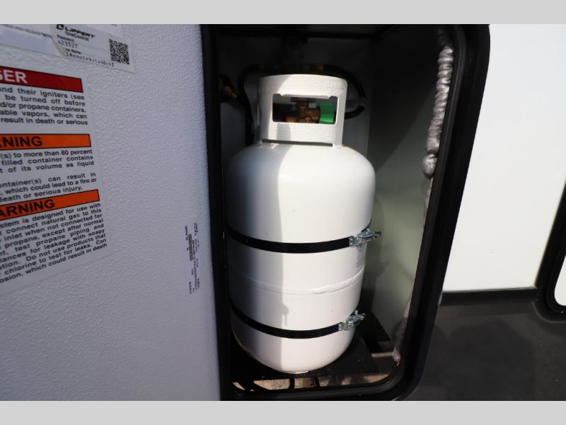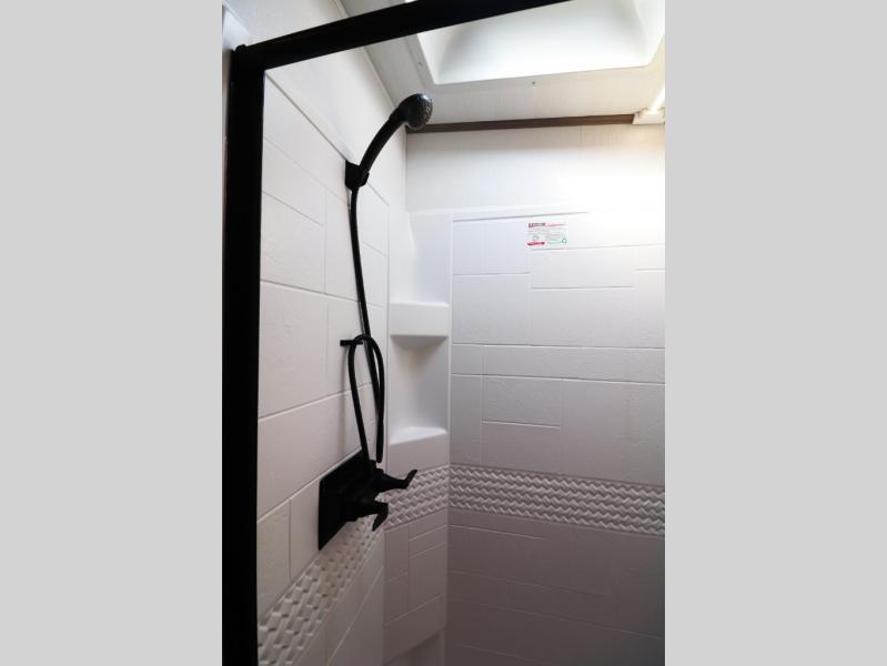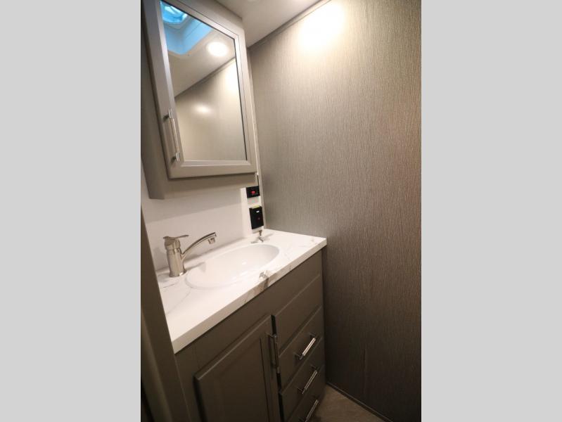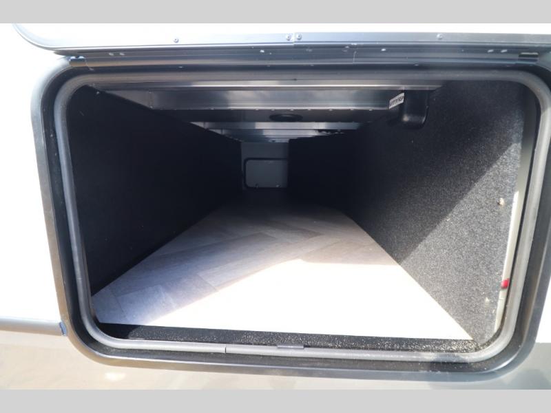 The Sprinter 3980FBS showcases a sleek design with practical features, including aluminum wheels with a lifetime warranty, a one-touch 4-point leveling system with return hookup memory, and an electric awning with LED light strip. The heated pass-through storage with lockable slam latch baggage doors ensures your gear is both secure and easily accessible.
