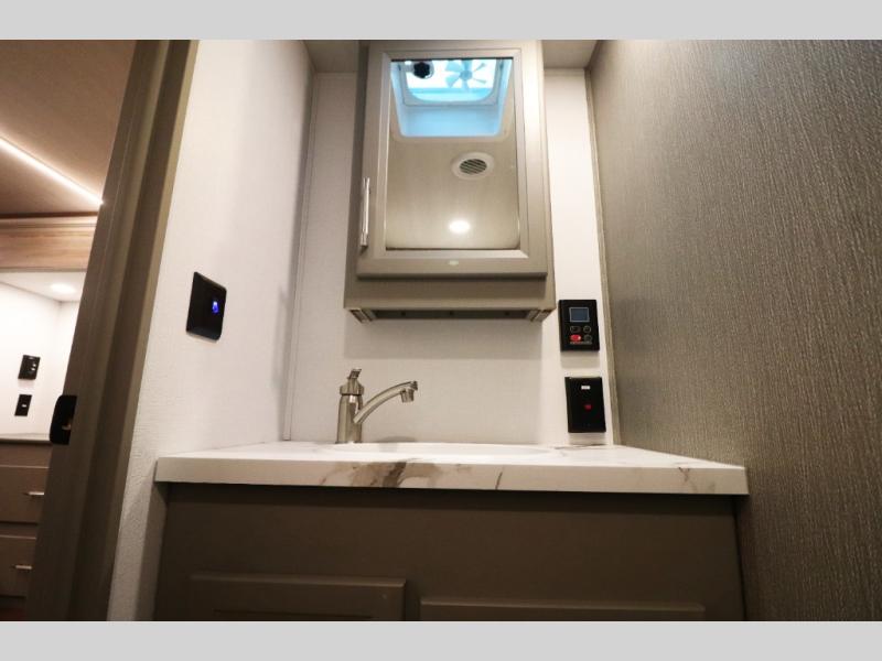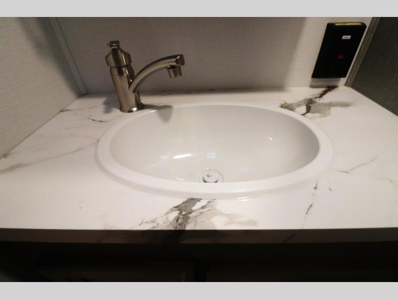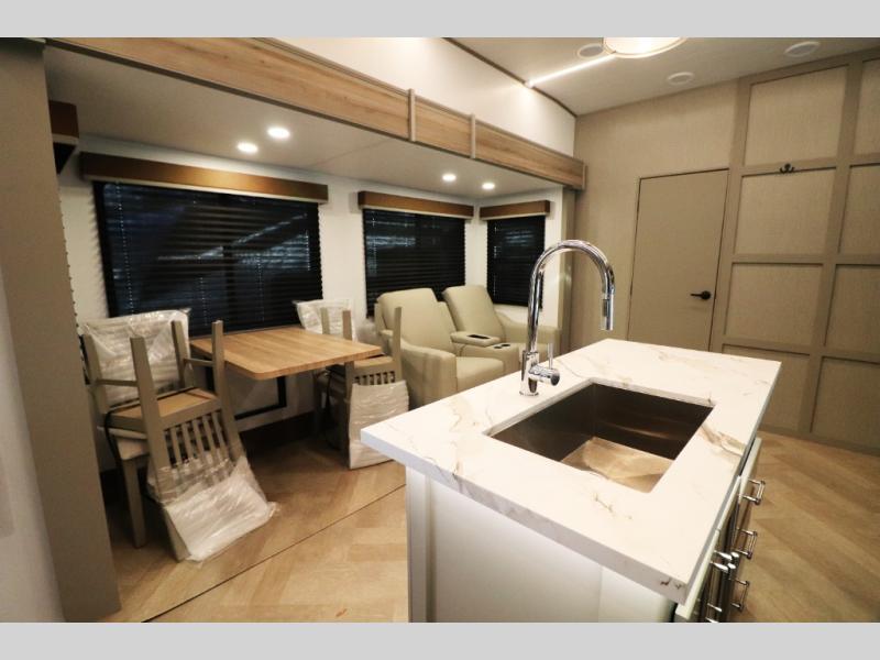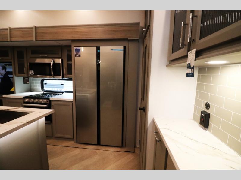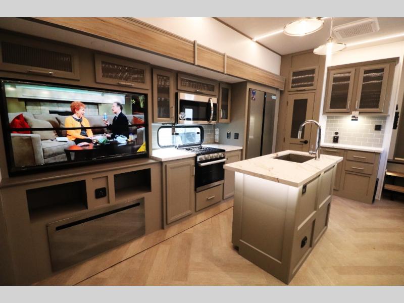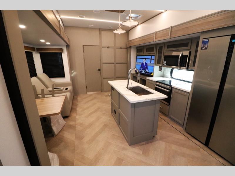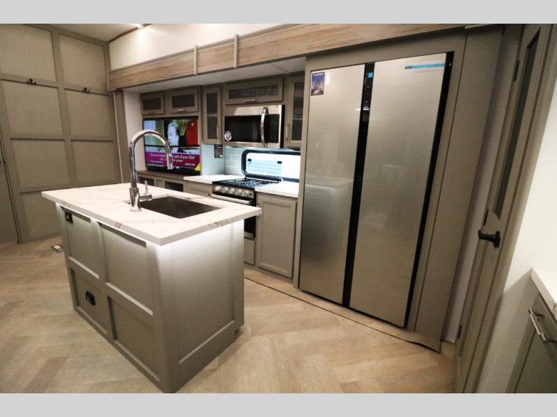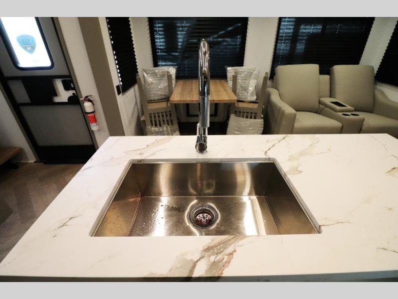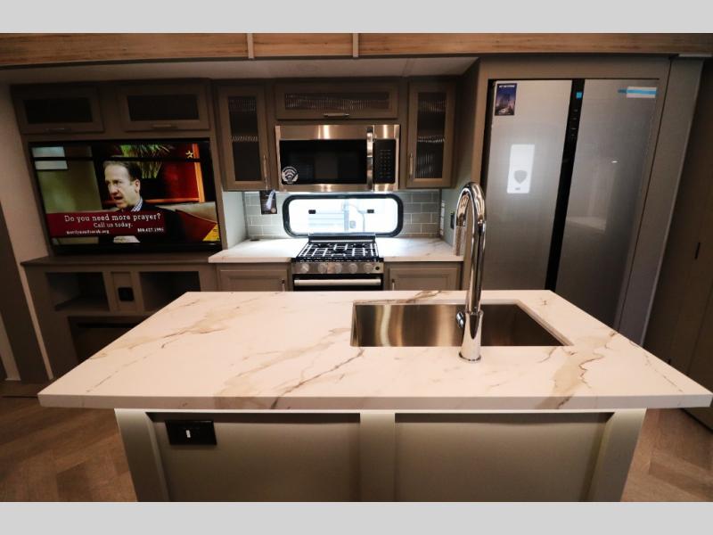 Modern Kitchen Amenities: The heart of this RV boasts a fully-equipped kitchen with a 16 cu. ft. 12V refrigerator, oversized 30" over-the-range microwave, and a 3-burner gas range with a 21" stainless steel oven. The deep single-basin stainless steel industrial sink and residential-style seamless marbled countertops make meal preparation a delight.