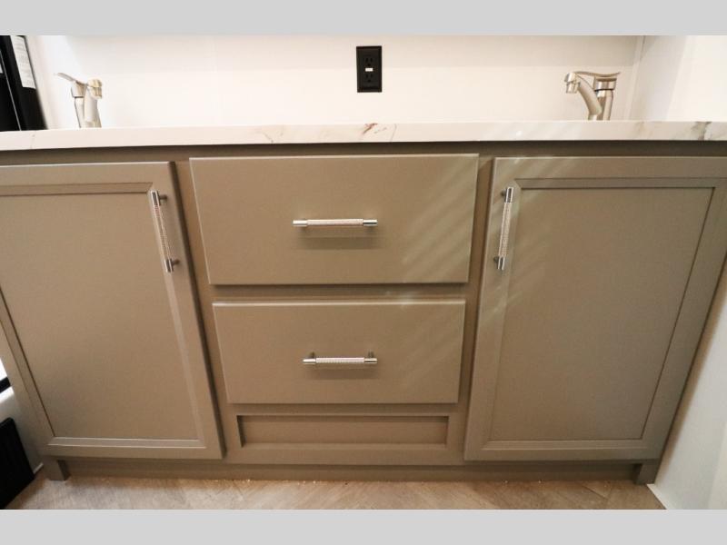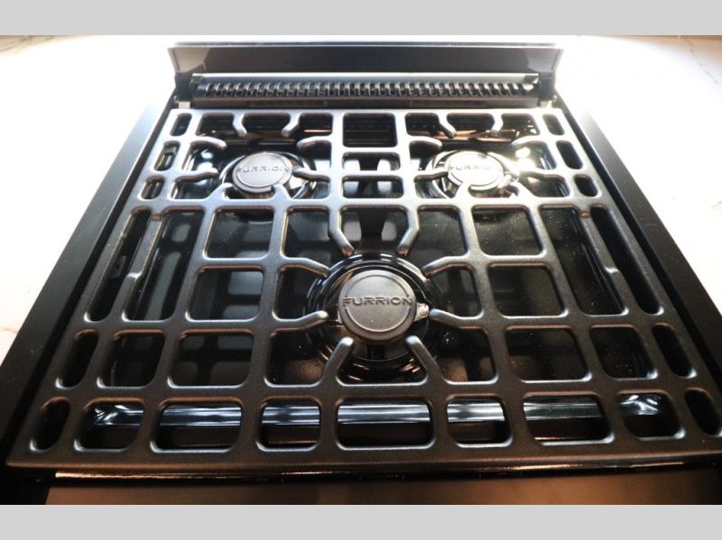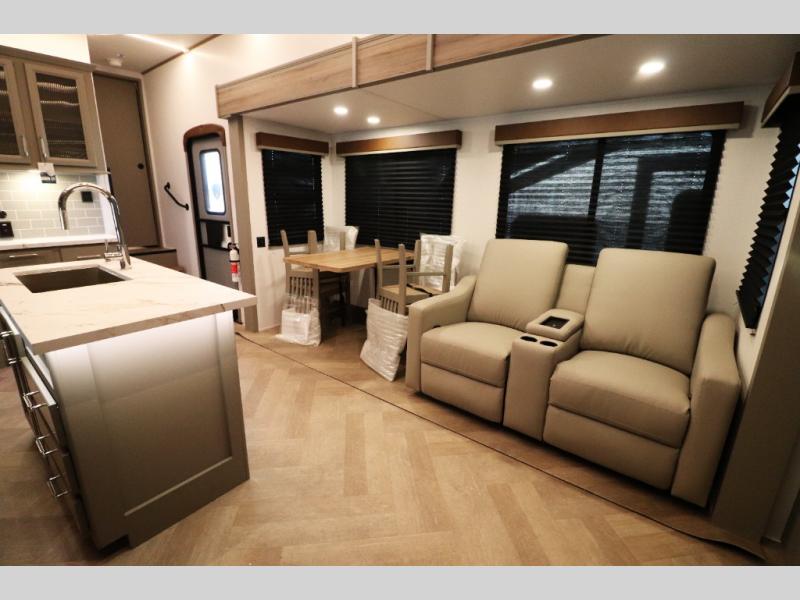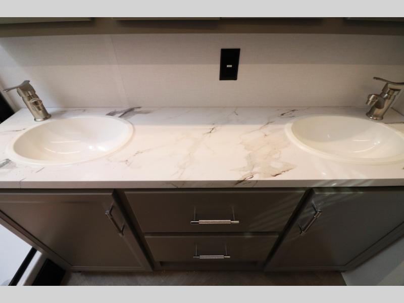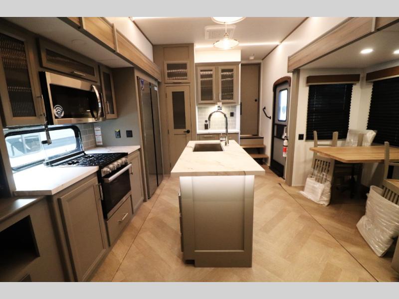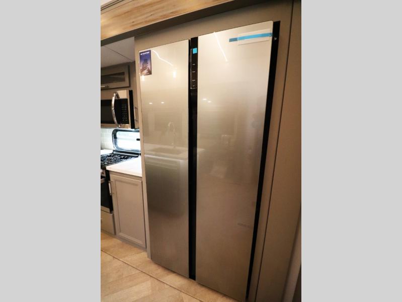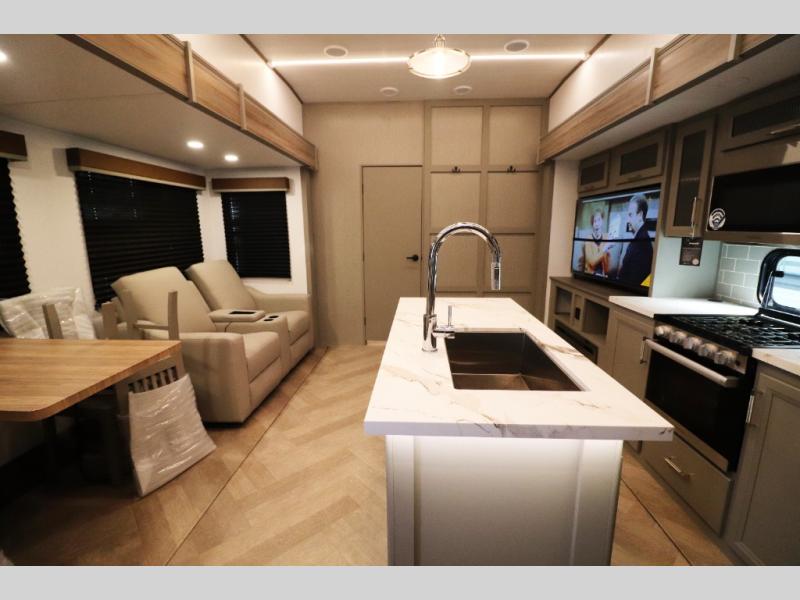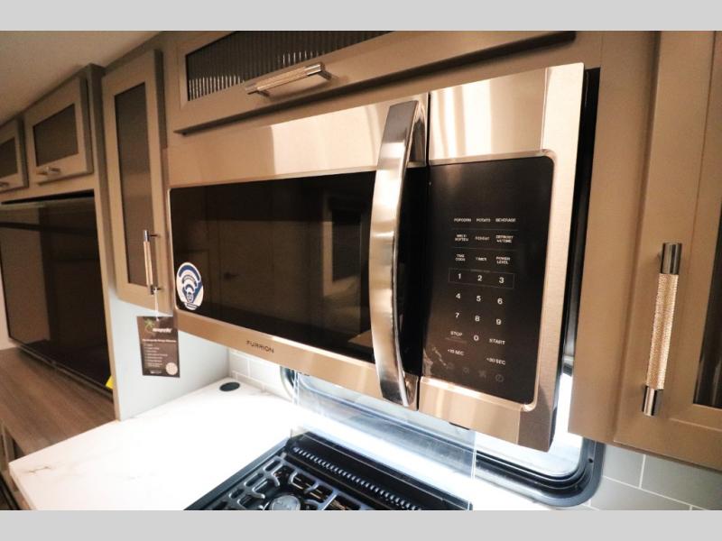 Modern Kitchen Amenities: The heart of this RV boasts a fully-equipped kitchen with a 16 cu. ft. 12V refrigerator, oversized 30" over-the-range microwave, and a 3-burner gas range with a 21" stainless steel oven. The deep single-basin stainless steel industrial sink and residential-style seamless marbled countertops make meal preparation a delight.