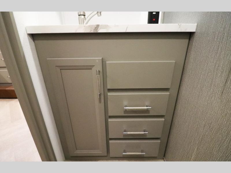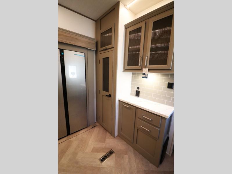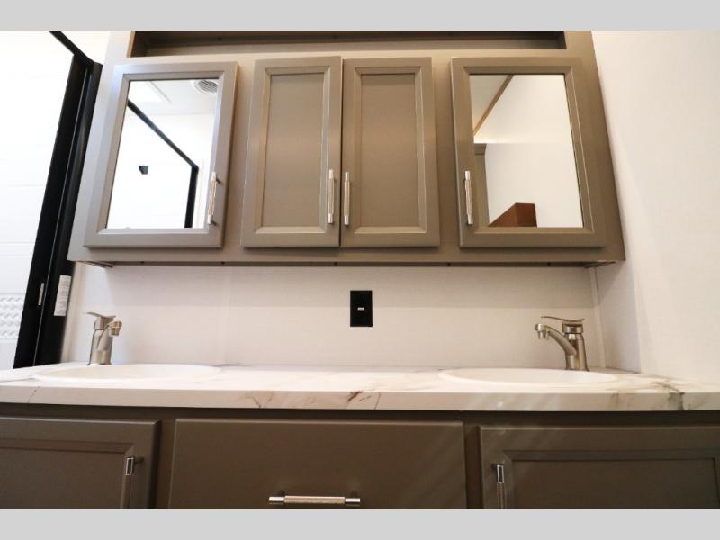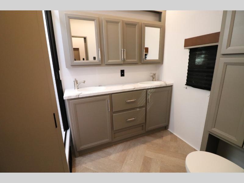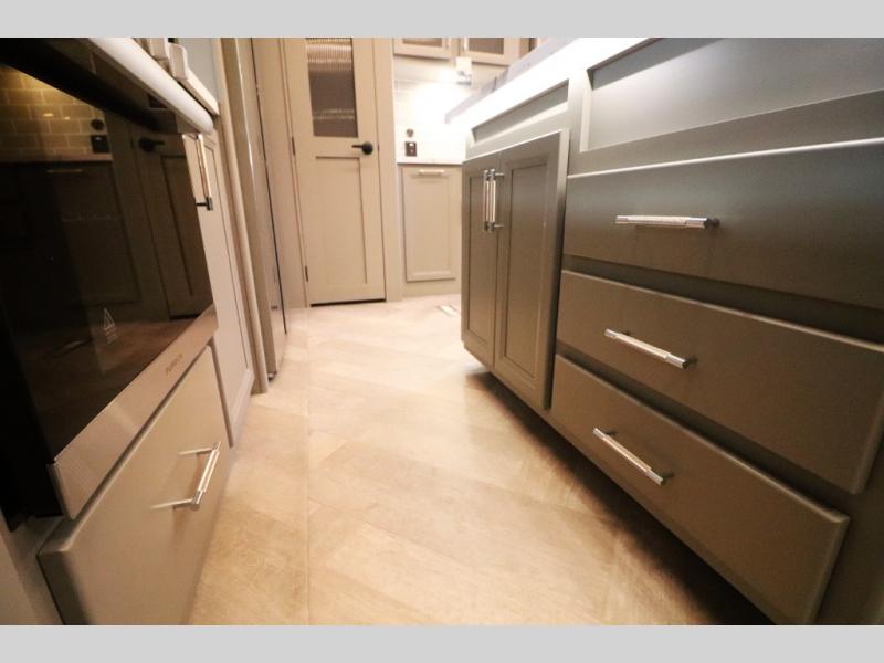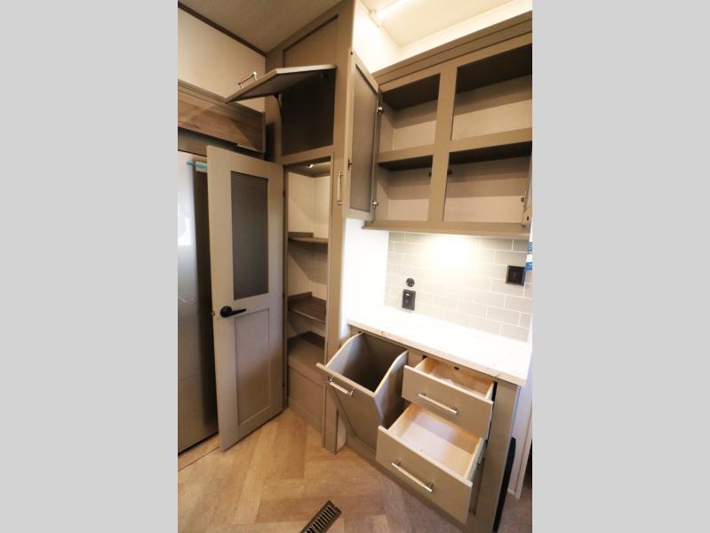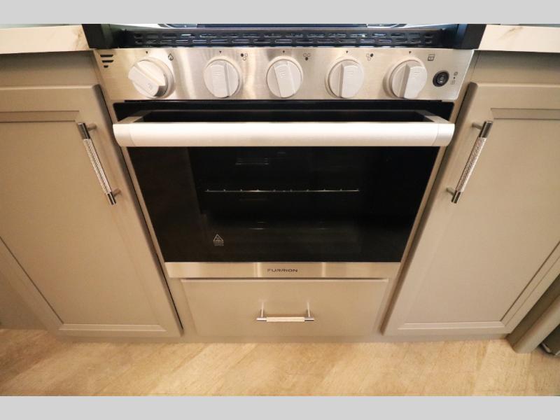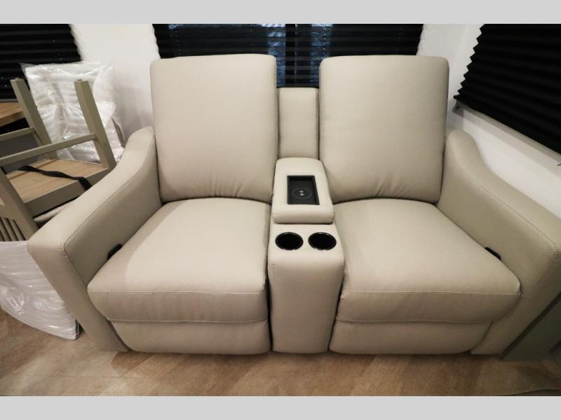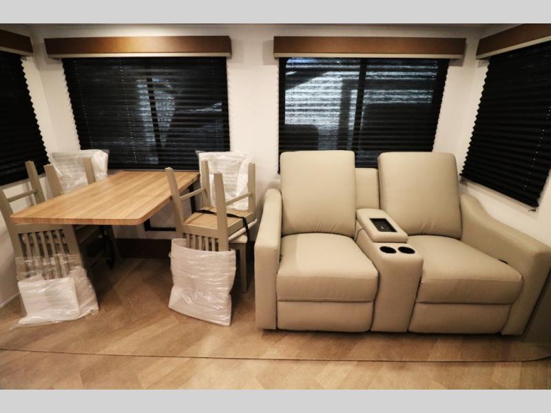 Modern Kitchen Amenities: The heart of this RV boasts a fully-equipped kitchen with a 16 cu. ft. 12V refrigerator, oversized 30" over-the-range microwave, and a 3-burner gas range with a 21" stainless steel oven. The deep single-basin stainless steel industrial sink and residential-style seamless marbled countertops make meal preparation a delight.
