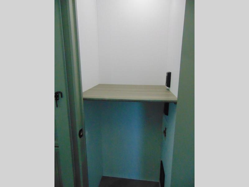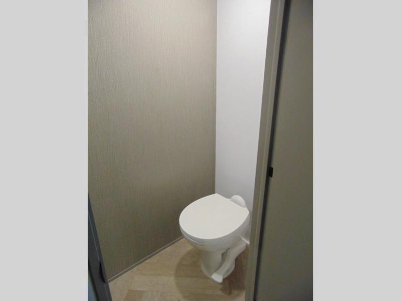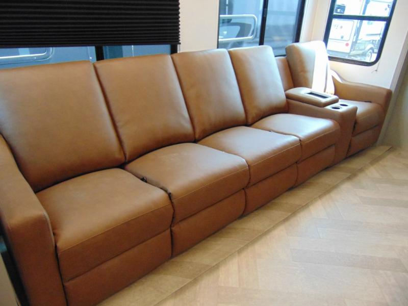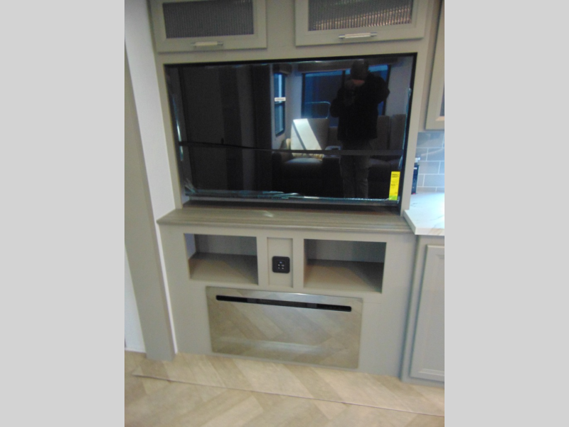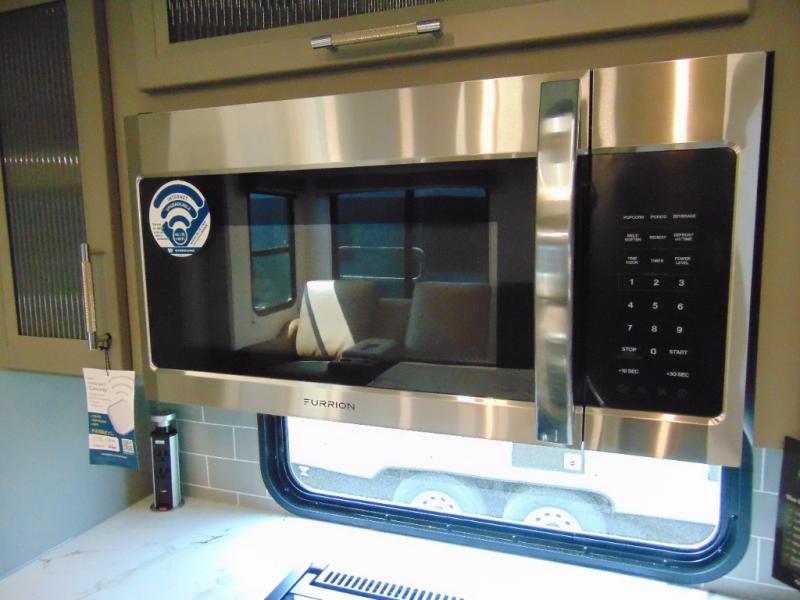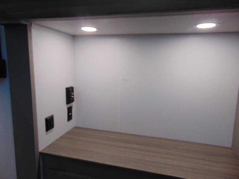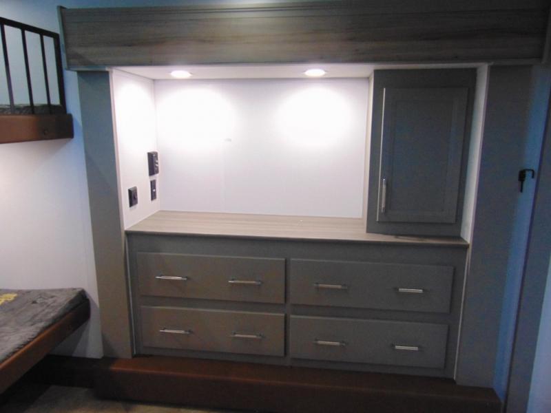 Up front, the bunkhouse suite includes two bunk beds, a desk, a slide out with a TV hookup, and a half bath for convenience. You'll have the master bedroom all to yourselves with a king bed slide out, plenty of storage. The chef of your group can make meals on the three burner gas range or in the stainless steel microwave, and food can be stored in the 12V refrigerator and pantry. A booth dinette provides a place to dine, or you can choose the optional free-standing dinette. And the full reclining theater seating across from the fireplace and 50" TV will make movie night cozy!