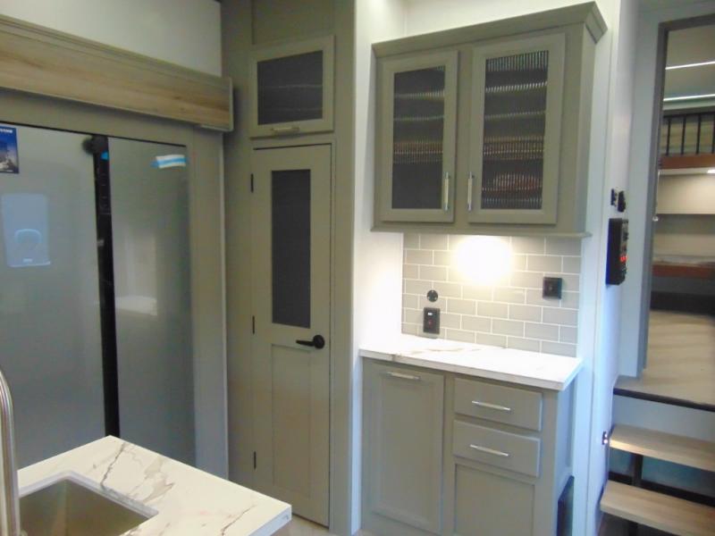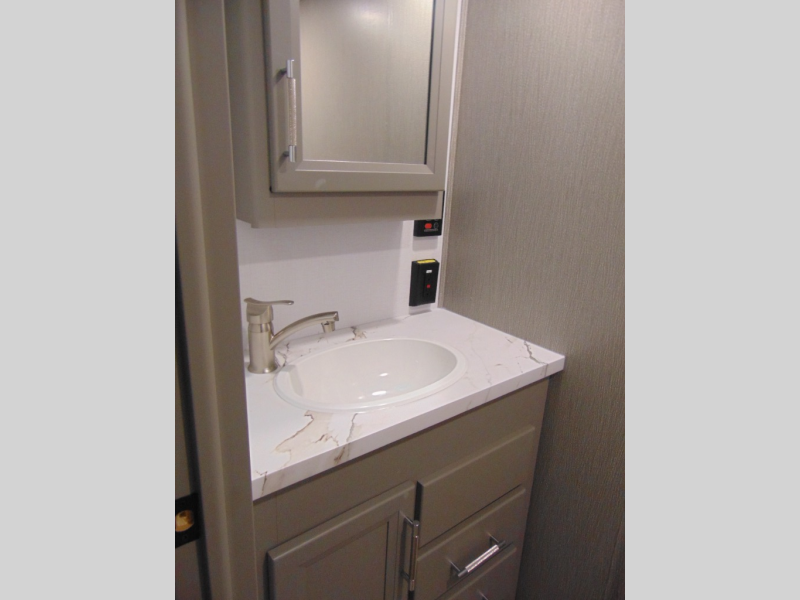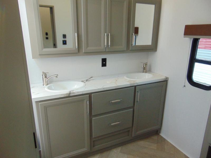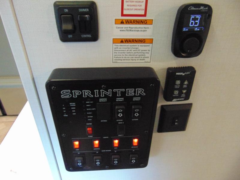 The Sprinter fifth wheels by Keystone feature 2" aluminum framed and laminated sidewalls, a fully walkable roof, and dual layer insulation to help extend your camping season. The heated pass-through storage includes lockable slam latch baggage doors so you can easily pack your gear, and the one-touch 4-point leveling system features return hookup memory to have you set up in no-time. Head inside to find Congoleum vinyl flooring, Thomas Payne luxury collection furniture, residential style seamless marbled countertops, and an upgraded bedspread to name a few comforts. The Sprinter also includes a Girard tankless on-demand water heater, a central command center, plus a 30k BTU furnace and two A/C units to ensure your comfort!