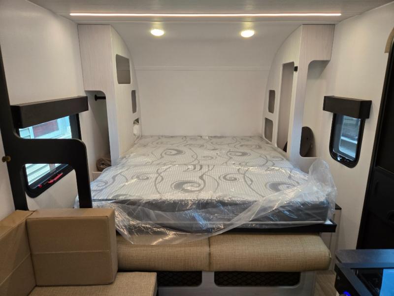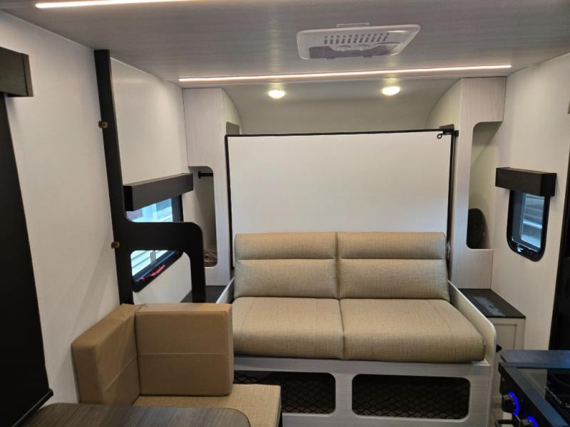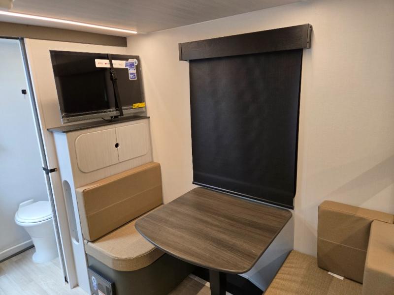 This single axle trailer is both cozy and versatile since there is a fold down sofa/Murphy bed up front! Now you can easily convert seating space into sleeping space, plus there are dual bedside closets to keep your things tidy. A two burner cooktop and air fryer/convection microwave will let you cook meals each day, and a booth dinette provides a place to dine together. You can also choose to add the optional flip-up bunk above the dinette if you need more sleeping space. And don't overlook the full rear bath that will allow you to freshen up without having to leave your camper!