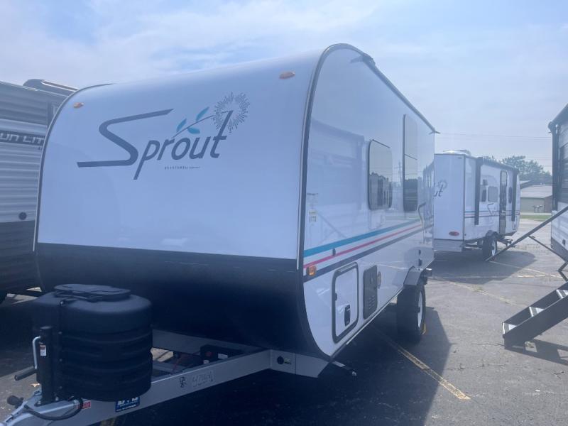 The Sprout travel trailers by Keystone are premium single-axle units that are sure to make an impression at the campground. Each one is built with an exclusive automotive-finished aluminum exterior, a walkable roof, and a 100% composite floor for added durability. There are also tinted safety glass windows, quick drop stabilizer jacks, and an exterior shower with hot and cold water. Inside, you will enjoy blackout night shades and a 6' 6" interior height, along with an ultra bright LED light strip and solid surface countertops in the kitchen. The 13,500 BTU A/C and 20,000 BTU furnace will keep you comfortable, and the Suburban tankless water heater is a convenience you won't want to camp without!