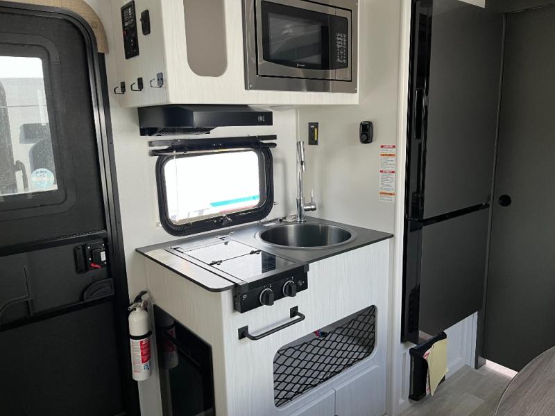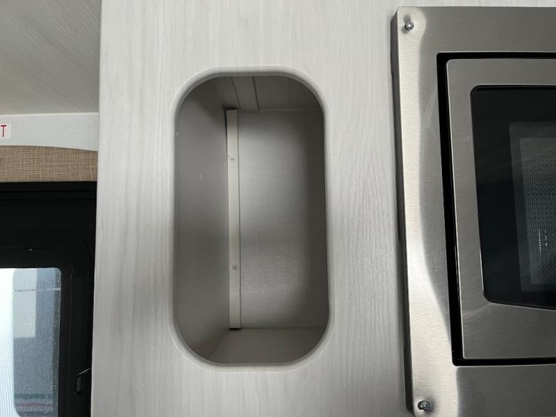 The well-designed kitchen in the Sprout 15RBS makes meal prep convenient and enjoyable. Equipped with a cooktop, microwave, and refrigerator, this kitchen has what you need for breakfast before a day of exploring or dinner after sunset. Counter space is optimized for efficiency, and smart storage areas keep pots, pans, and pantry items neatly organized.