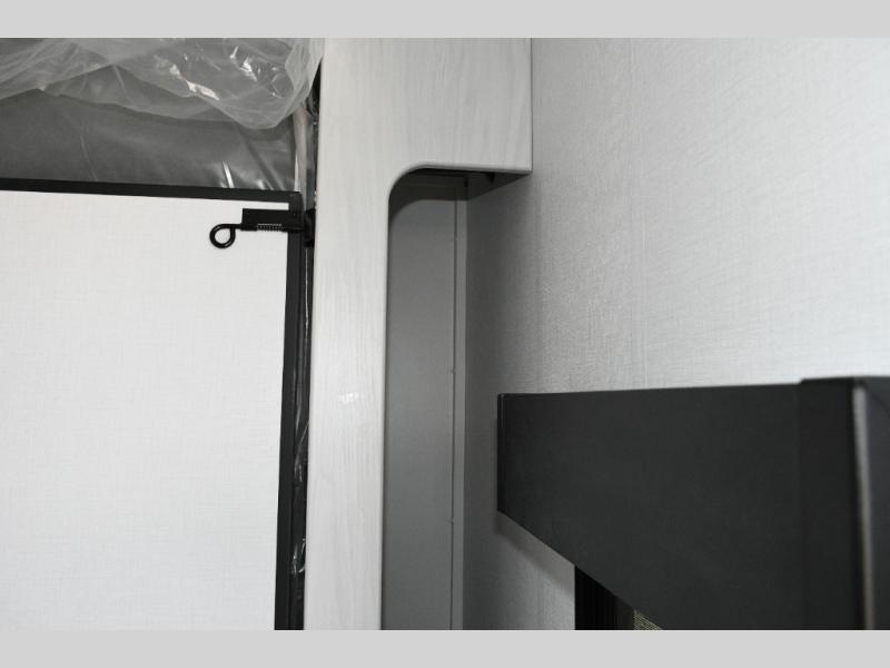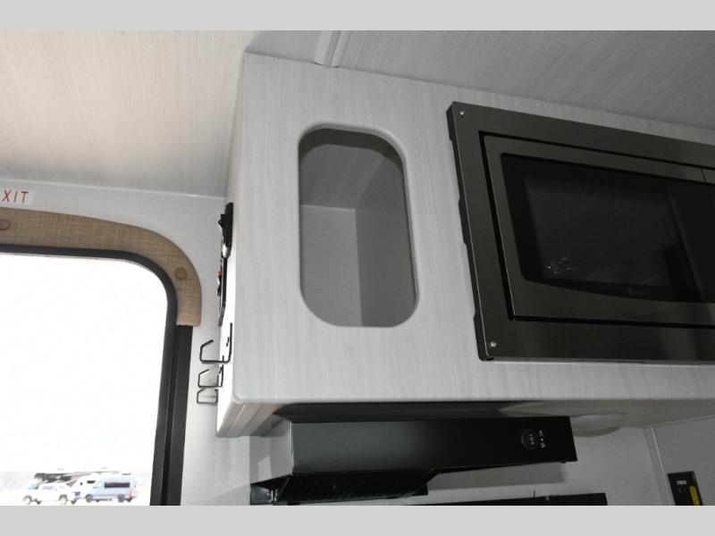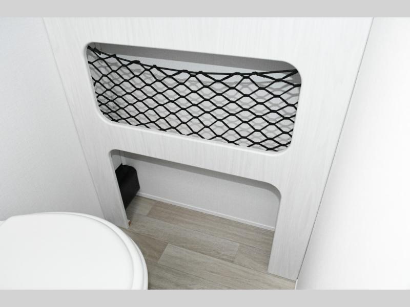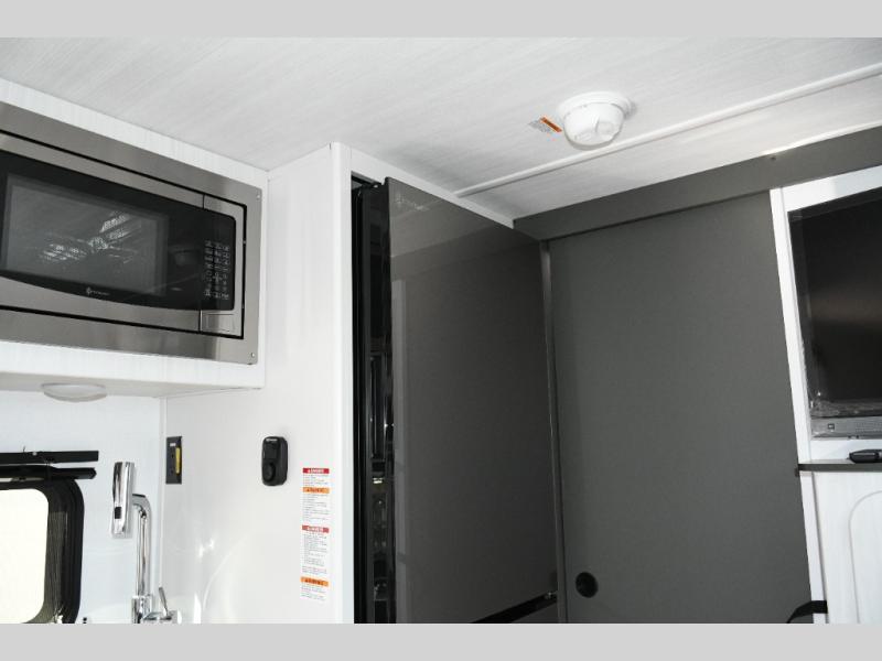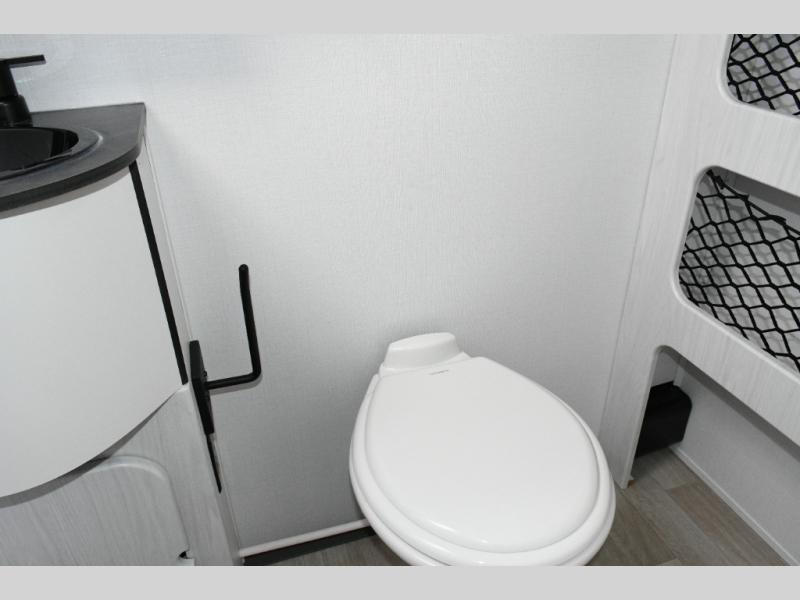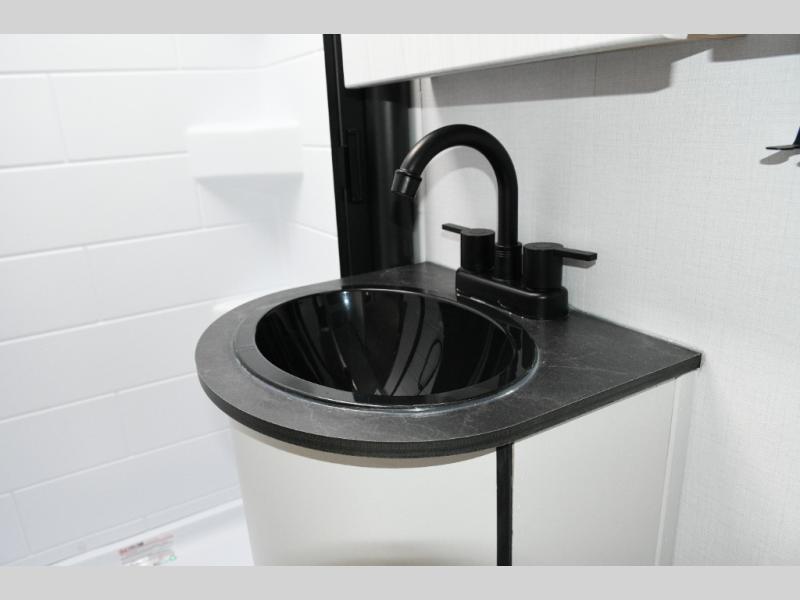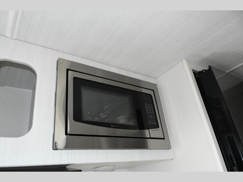 The kitchen is compact yet capable, featuring a two-burner cooktop and an air fryer/convection microwave so you can prepare everything from quick breakfasts to campsite dinners. Solid surface countertops add a premium touch. At the rear, the full bathroom lets you clean up comfortably without relying on campground facilities—an essential upgrade for longer trips or off-grid stops.