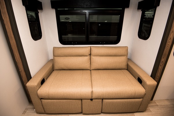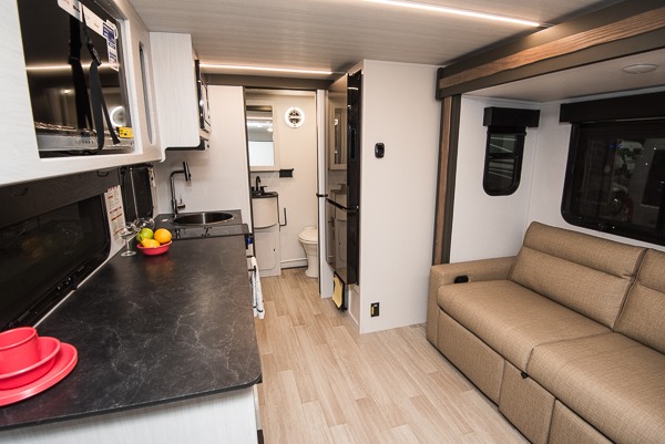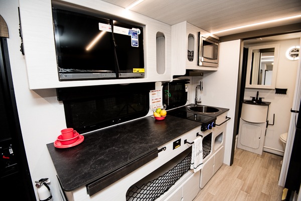 This single axle trailer is both cozy and versatile since there is a fold down sofa/Murphy bed up front! Now you can easily convert seating space into sleeping space, plus there are dual bedside closets to keep your things tidy. A two burner cooktop and air fryer/convection microwave will let you cook meals each day, and there is a huge countertop plus a flip-up extension for even more prep space. This unit also includes a theater dinette where you can relax each day, and the fireplace is sure to make your space feel like home!