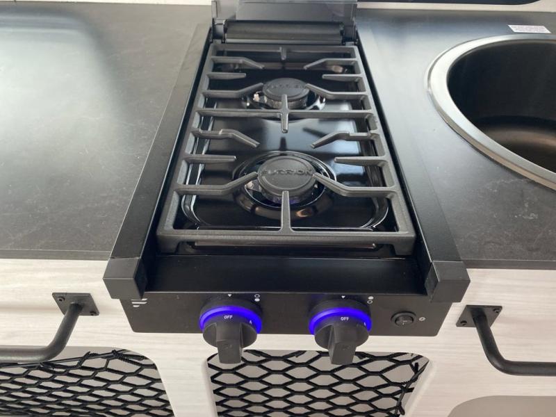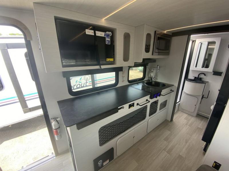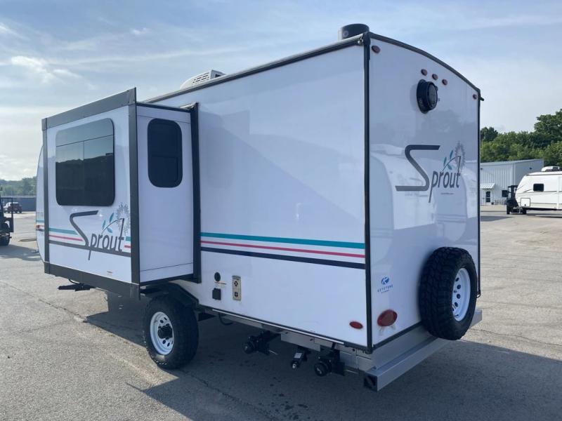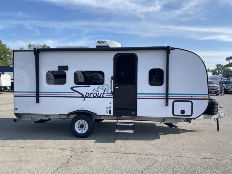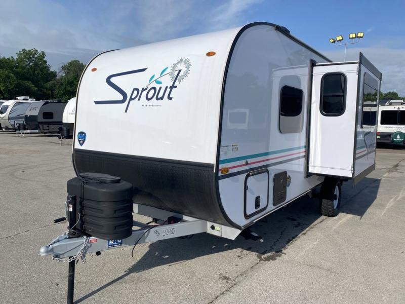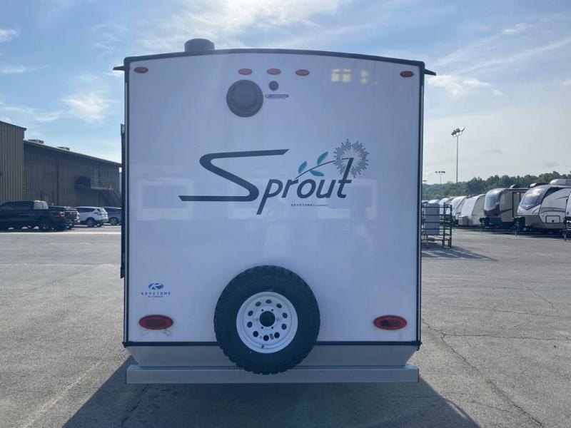 The Sprout travel trailers by Keystone are premium single-axle units that are sure to make an impression at the campground. Each one is built with an exclusive automotive-finished aluminum exterior, a walkable roof, and a 100% composite floor for added durability. There are also tinted safety glass windows, quick drop stabilizer jacks, and an exterior shower with hot and cold water. Inside, you will enjoy blackout night shades and a 6' 6" interior height, along with an ultra bright LED light strip and solid surface countertops in the kitchen. The 13,500 BTU A/C and 20,000 BTU furnace will keep you comfortable, and the Suburban tankless water heater is a convenience you won't want to camp without!