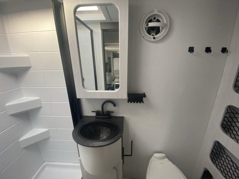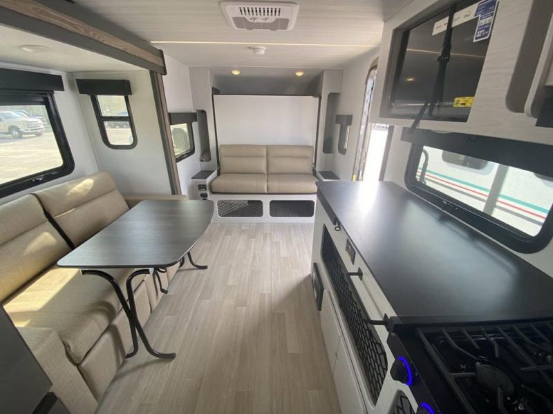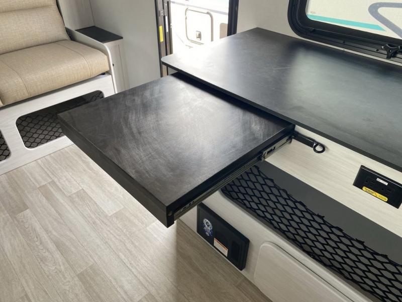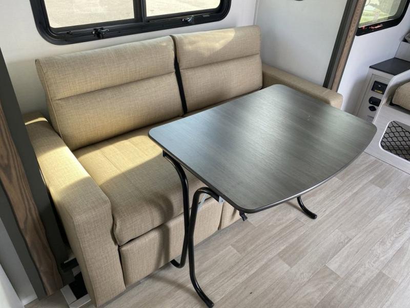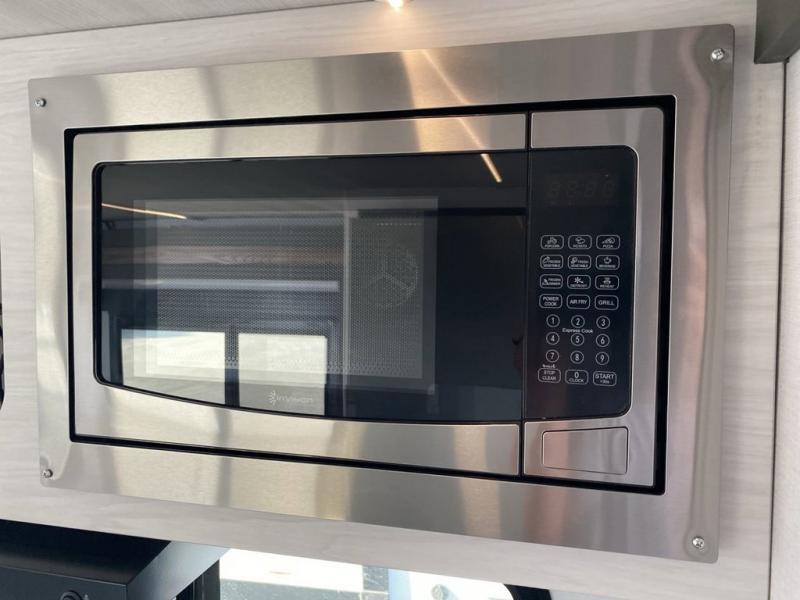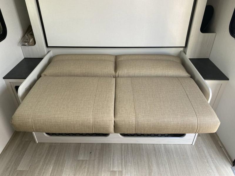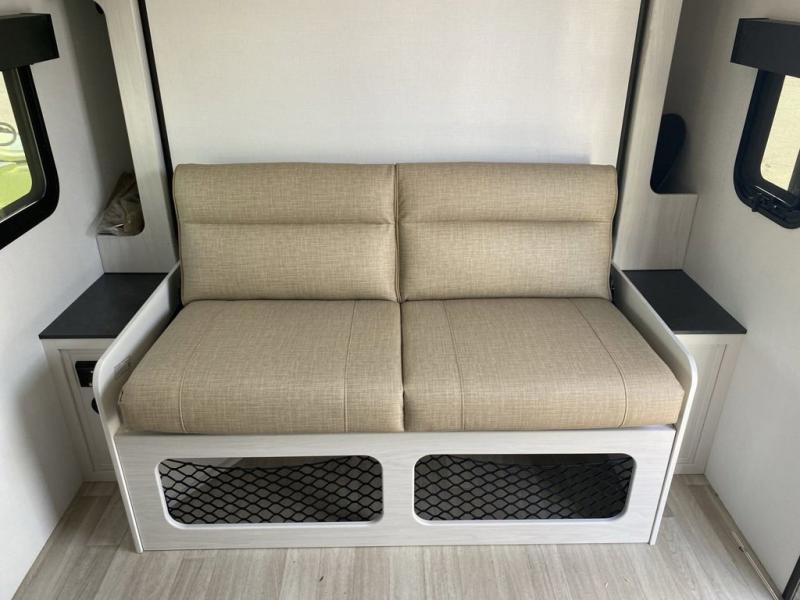 This single axle trailer is both cozy and versatile since there is a fold down sofa/Murphy bed up front! Now you can easily convert seating space into sleeping space, plus there are dual bedside closets to keep your things tidy. A two burner cooktop and air fryer/convection microwave will let you cook meals each day, and there is a huge countertop plus a flip-up extension for even more prep space. This unit also includes a theater dinette where you can relax each day, and the fireplace is sure to make your space feel like home!