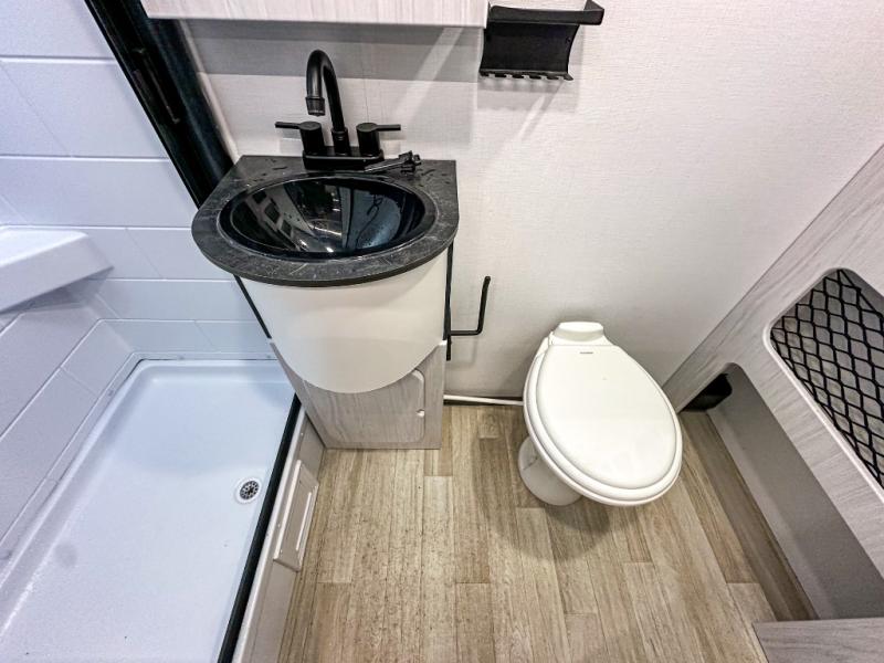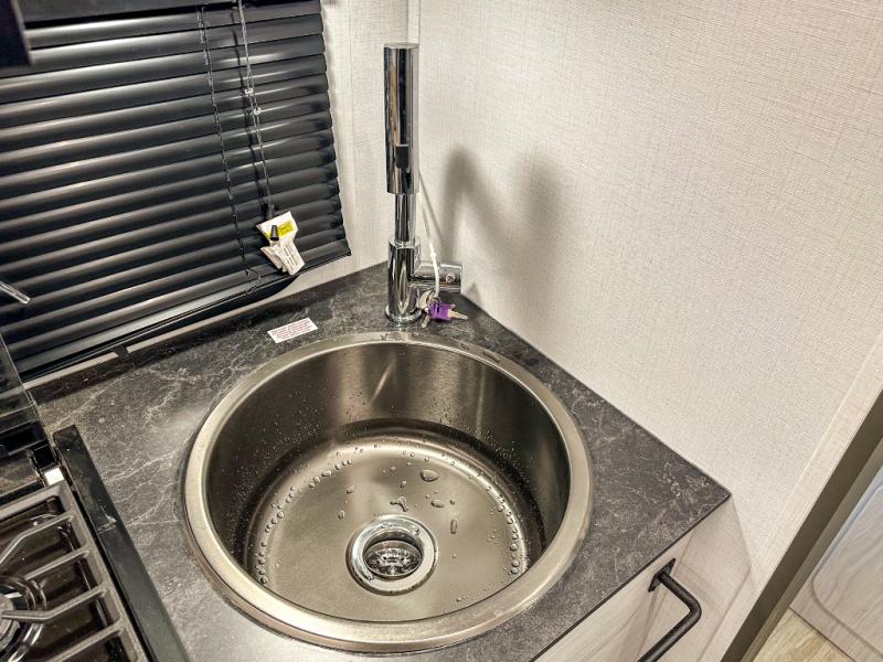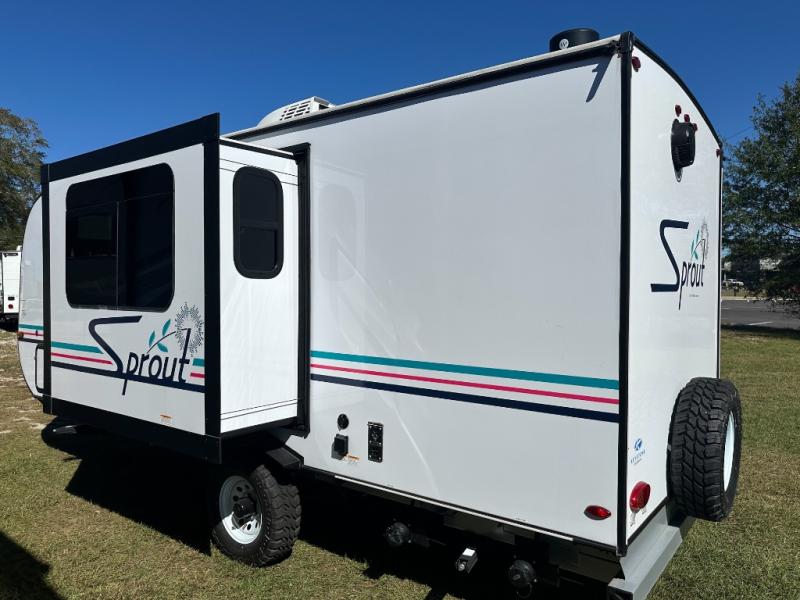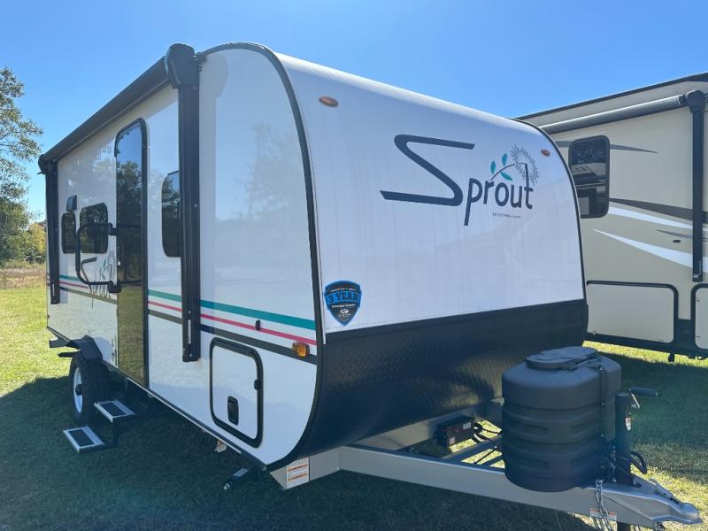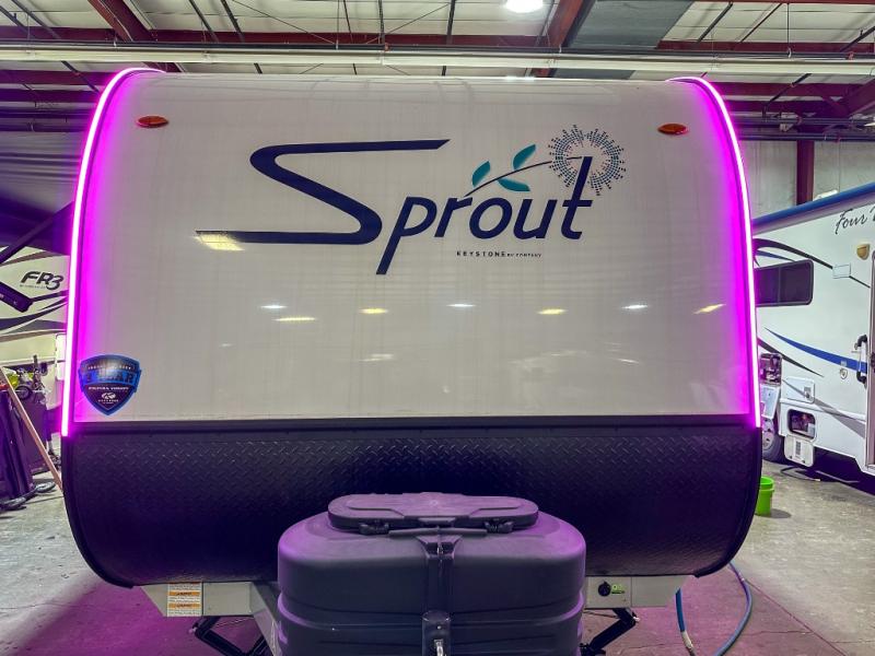 The Sprout travel trailers by Keystone are premium single-axle units that are sure to make an impression at the campground. Each one is built with an exclusive automotive-finished aluminum exterior, a walkable roof, and a 100% composite floor for added durability. There are also tinted safety glass windows, quick drop stabilizer jacks, and an exterior shower with hot and cold water. Inside, you will enjoy blackout night shades and a 6' 6" interior height, along with an ultra bright LED light strip and solid surface countertops in the kitchen. The 13,500 BTU A/C and 20,000 BTU furnace will keep you comfortable, and the Suburban tankless water heater is a convenience you won't want to camp without!