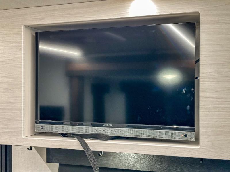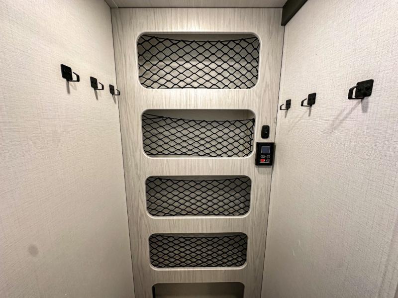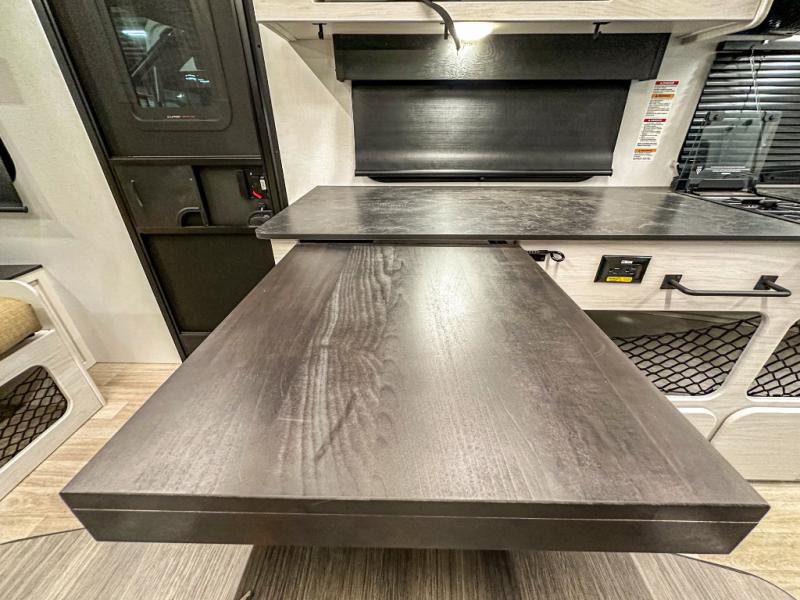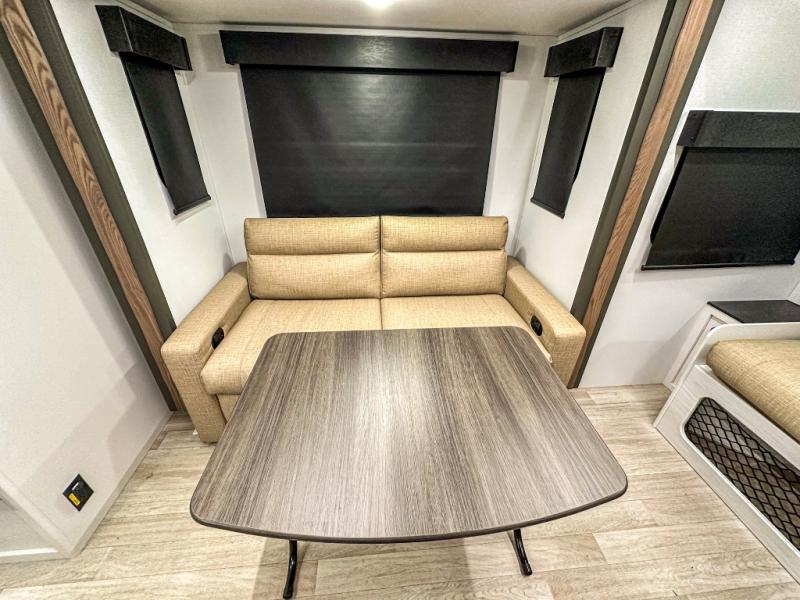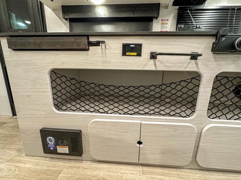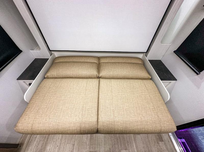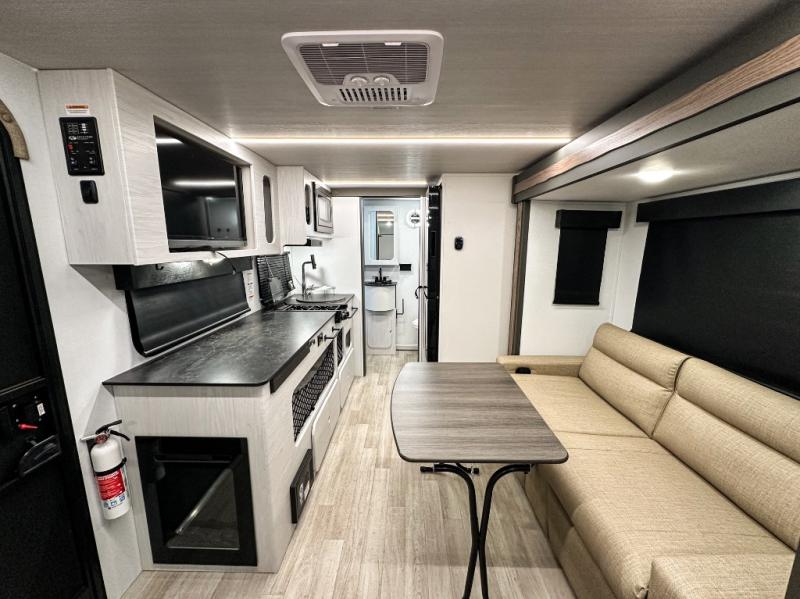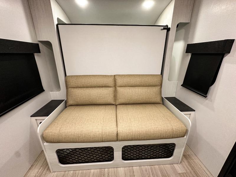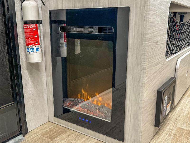 This single axle trailer is both cozy and versatile since there is a fold down sofa/Murphy bed up front! Now you can easily convert seating space into sleeping space, plus there are dual bedside closets to keep your things tidy. A two burner cooktop and air fryer/convection microwave will let you cook meals each day, and there is a huge countertop plus a flip-up extension for even more prep space. This unit also includes a theater dinette where you can relax each day, and the fireplace is sure to make your space feel like home!
