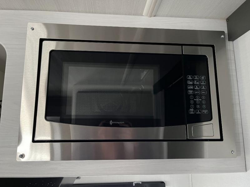 Cooktop, microwave, and refrigerator make meal prep convenient on the road.