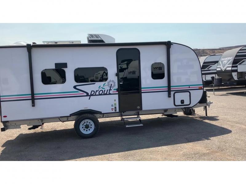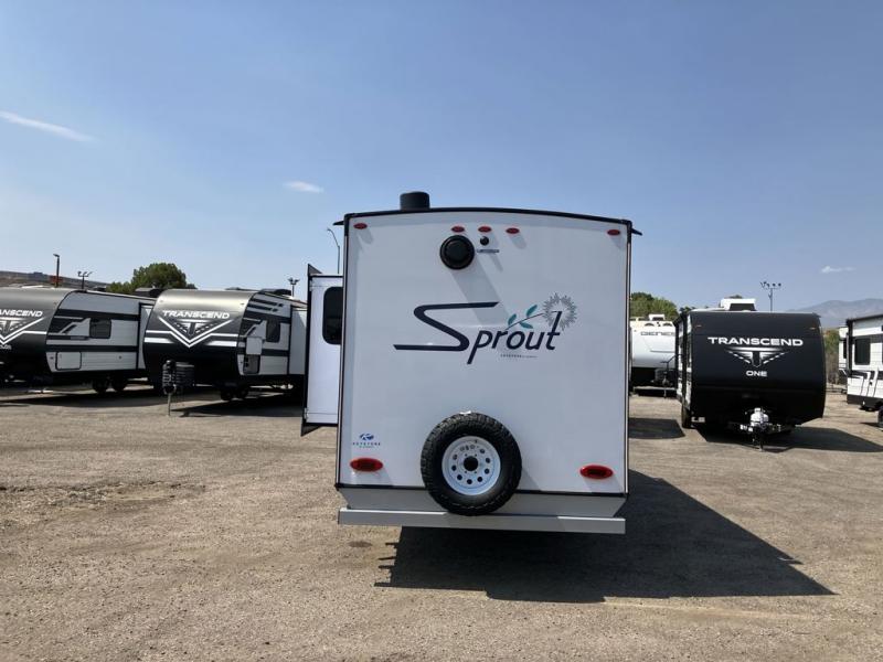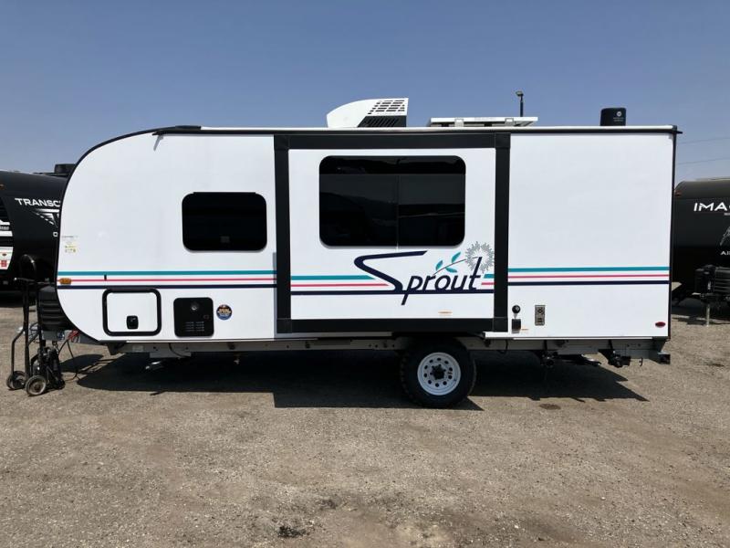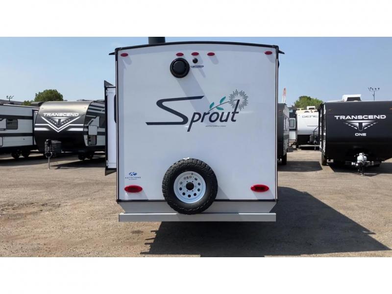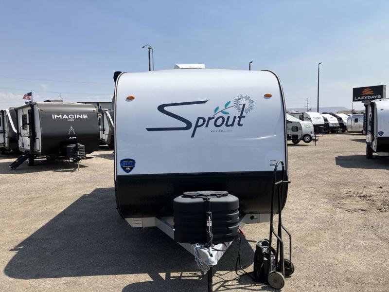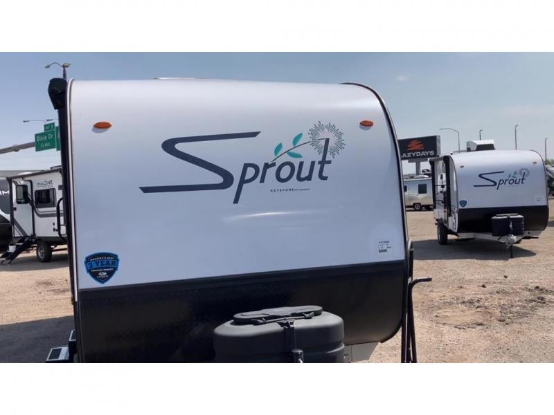 The Sprout travel trailers by Keystone are premium single-axle units that are sure to make an impression at the campground. Each one is built with an exclusive automotive-finished aluminum exterior, a walkable roof, and a 100% composite floor for added durability. There are also tinted safety glass windows, quick drop stabilizer jacks, and an exterior shower with hot and cold water. Inside, you will enjoy blackout night shades and a 6' 6" interior height, along with an ultra bright LED light strip and solid surface countertops in the kitchen. The 13,500 BTU A/C and 20,000 BTU furnace will keep you comfortable, and the Suburban tankless water heater is a convenience you won't want to camp without!