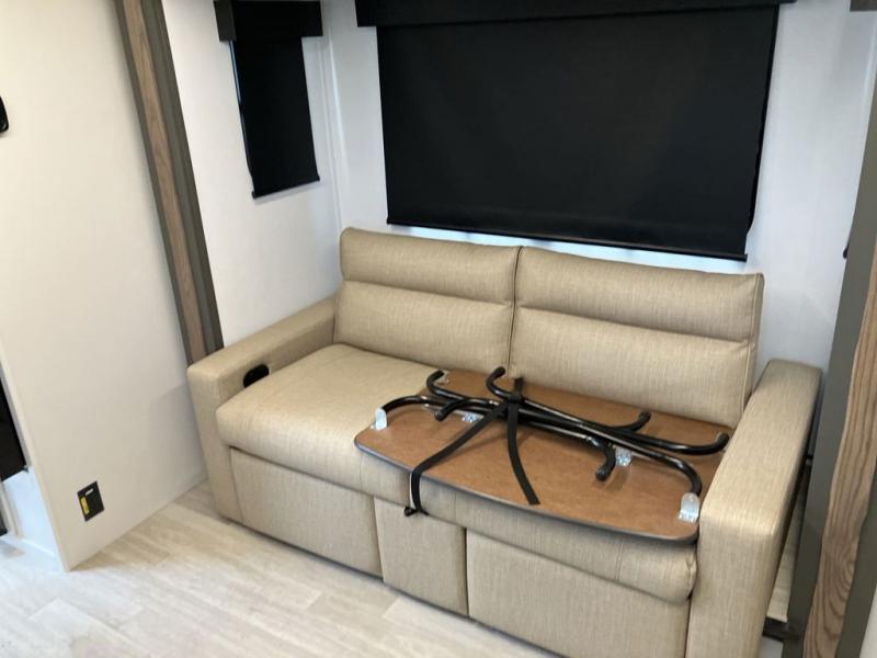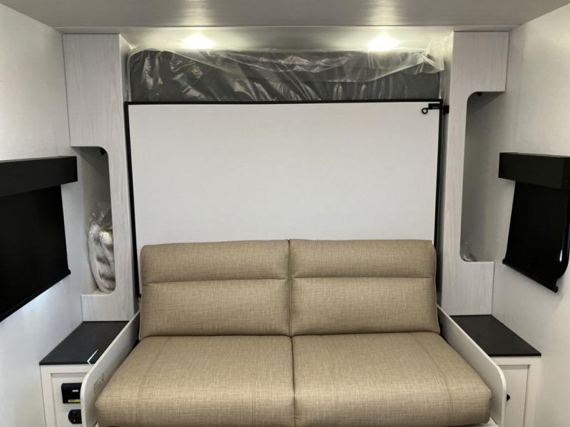 This single axle trailer is both cozy and versatile since there is a fold down sofa/Murphy bed up front! Now you can easily convert seating space into sleeping space, plus there are dual bedside closets to keep your things tidy. A two burner cooktop and air fryer/convection microwave will let you cook meals each day, and there is a huge countertop plus a flip-up extension for even more prep space. This unit also includes a theater dinette where you can relax each day, and the fireplace is sure to make your space feel like home!